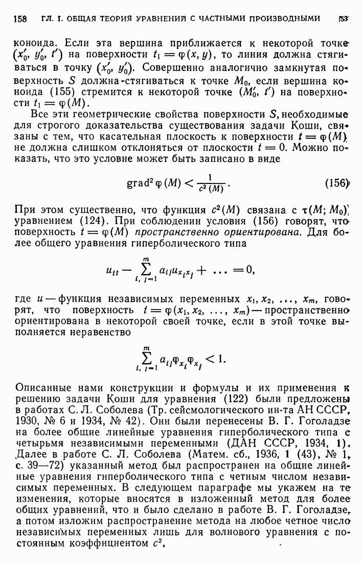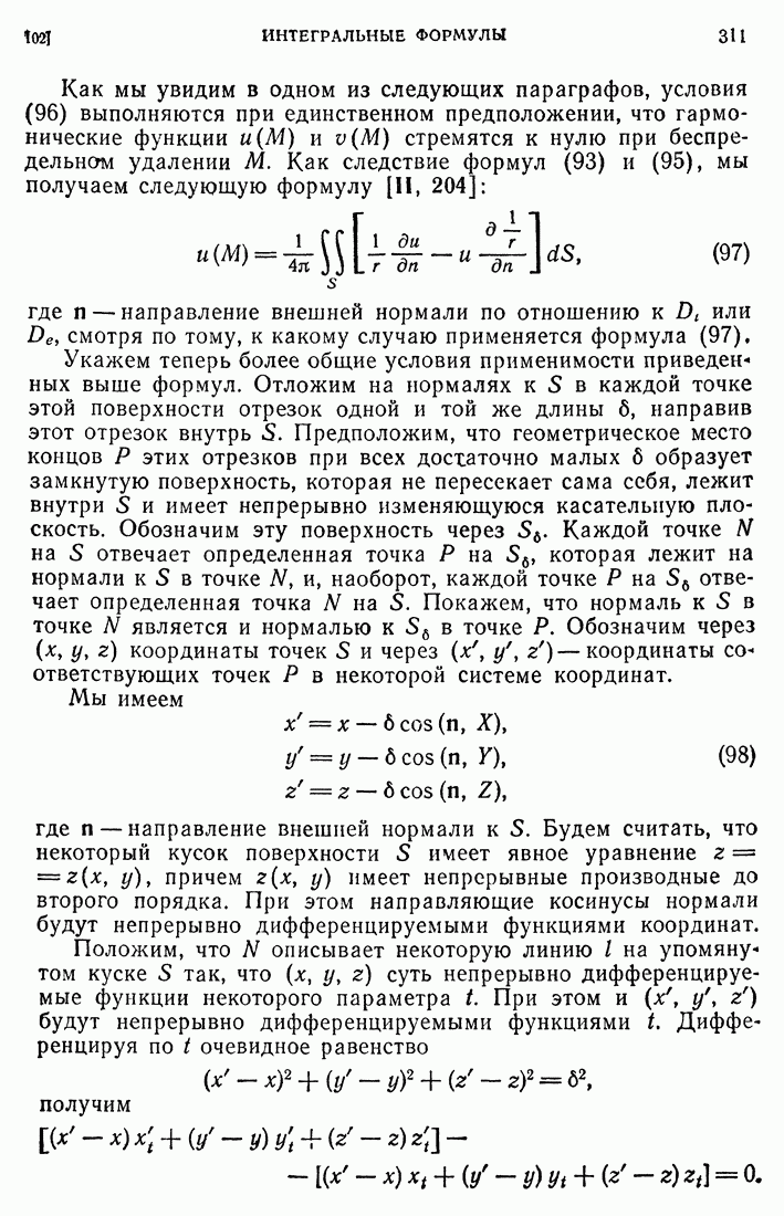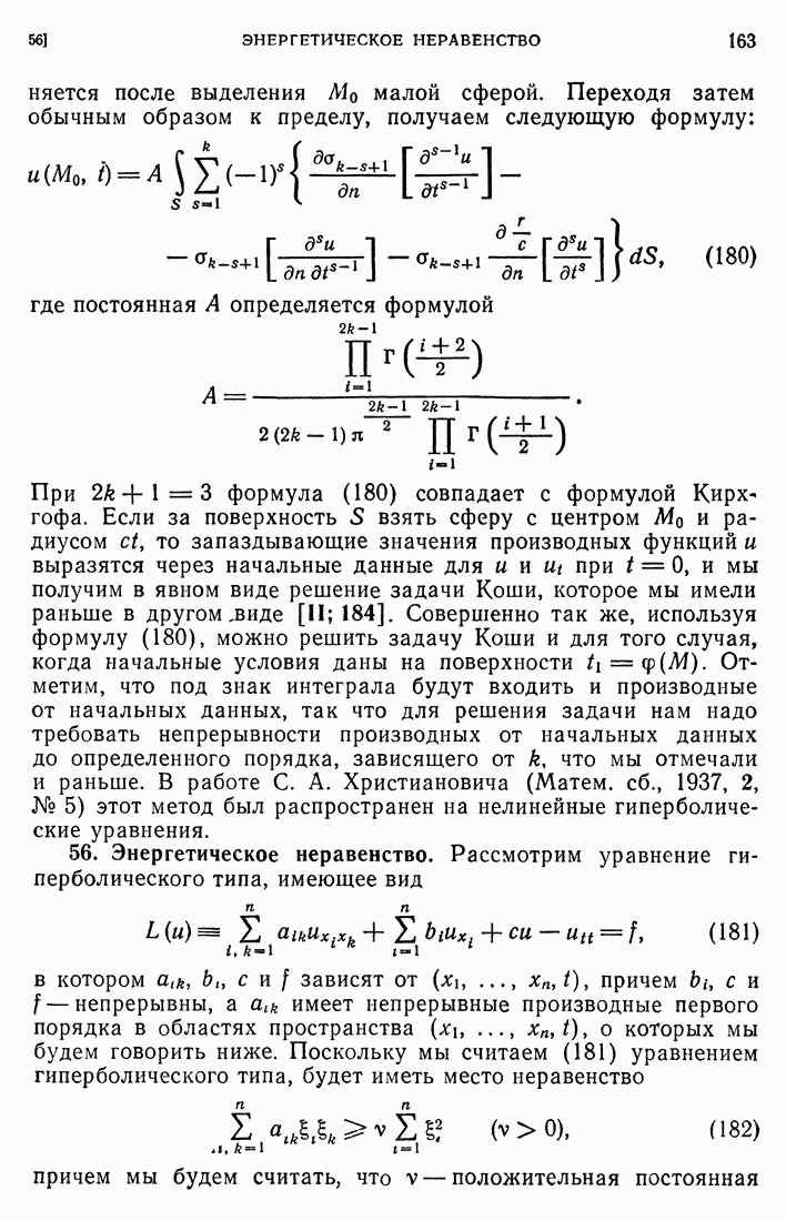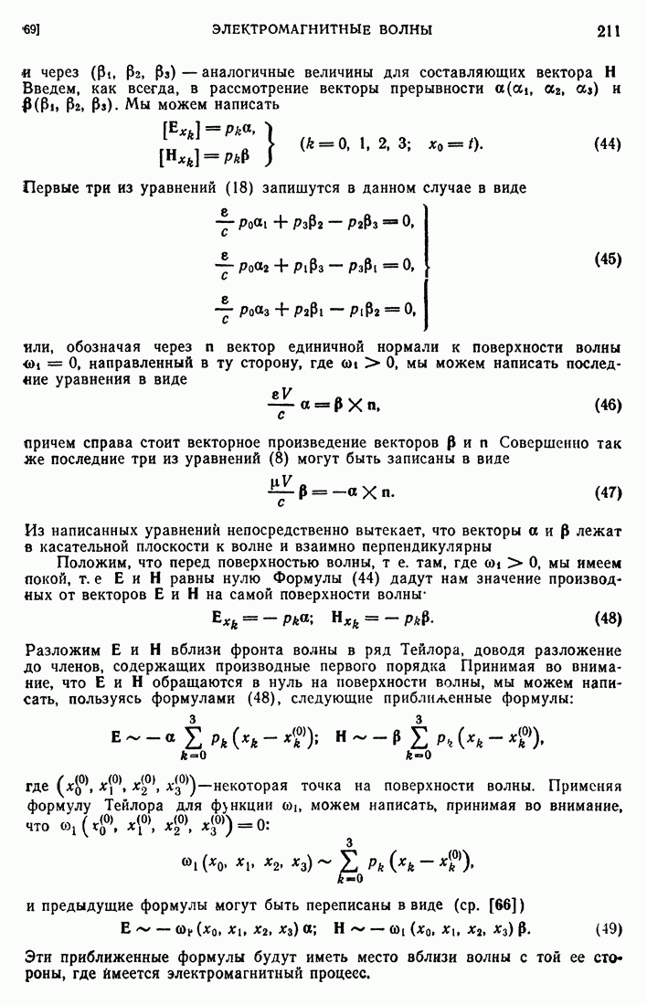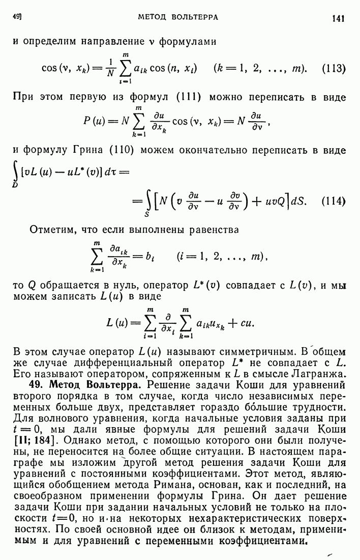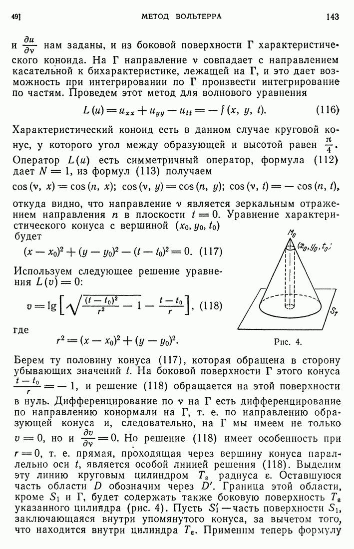 44. Сильные разрывы.При исследовании разрывных решений для уравнений второго порядка мы предполагали, что сама функция и ее производные первого порядка остаются непрерывными при переходе через поверхность разрыва и что разрыв испытывают производные не ниже второго порядка (слабый разрыв). Только при таком предположении мы могли утверждать, то поверхность разрыва должна быть характеристической поверхностью. Мы переходим теперь к исследованию сильных разрывов. Это значит, что в случае уравнения второго порядка, разрыв имеют уже производные первого порядка. Нашей целью является выяснение тех обстоятельств, при которых поверхностью разрыва по-прежнему является обязательно характеристическая поверхность. Мы рассмотрим волновое уравнение с тремя независимыми переменными. Введем в рассмотрение оператор, стоящий в левсй части упомянутого уравнения: