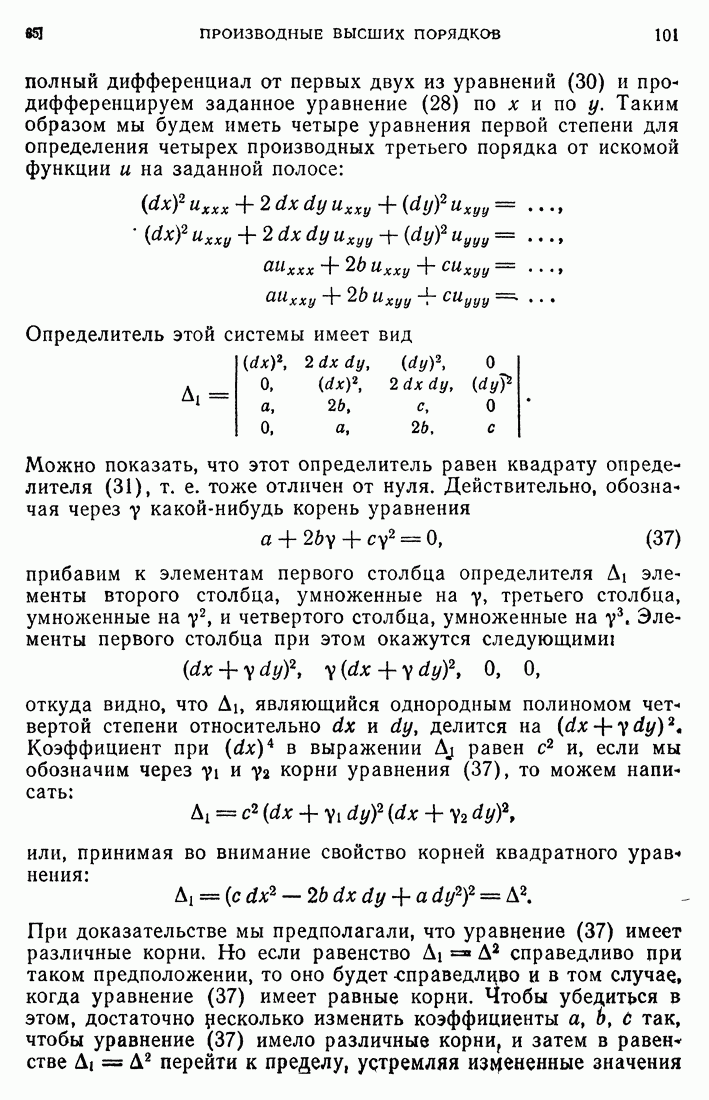 Будем рассматривать уравнения (80) и (81) как четыре уравнения первой степени относительно их, разрыва. Таким образом, мы можем утверждать, что ранг упомянутой таблицы коэффициентов должен быть меньше трех, т. е. все определители третьего порядка таблицы
