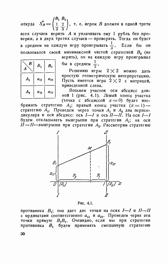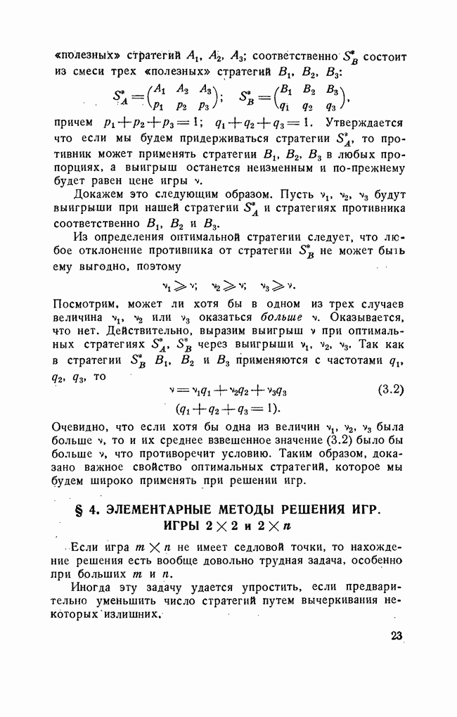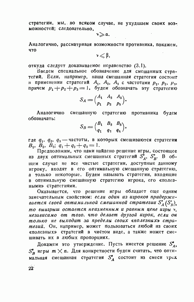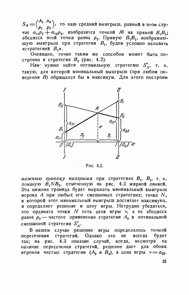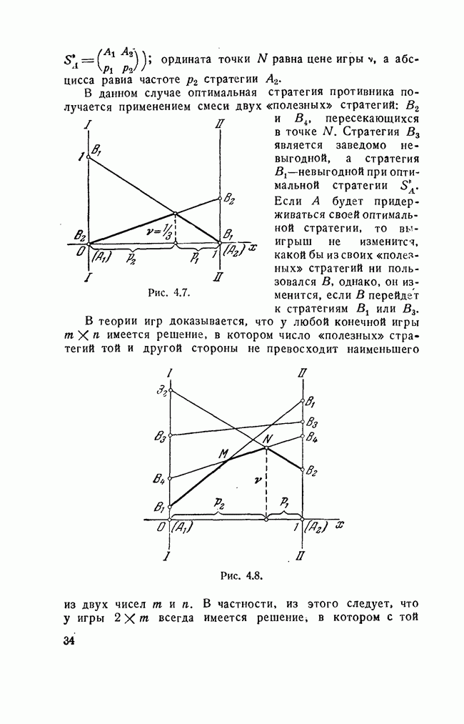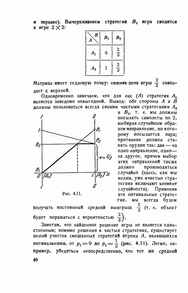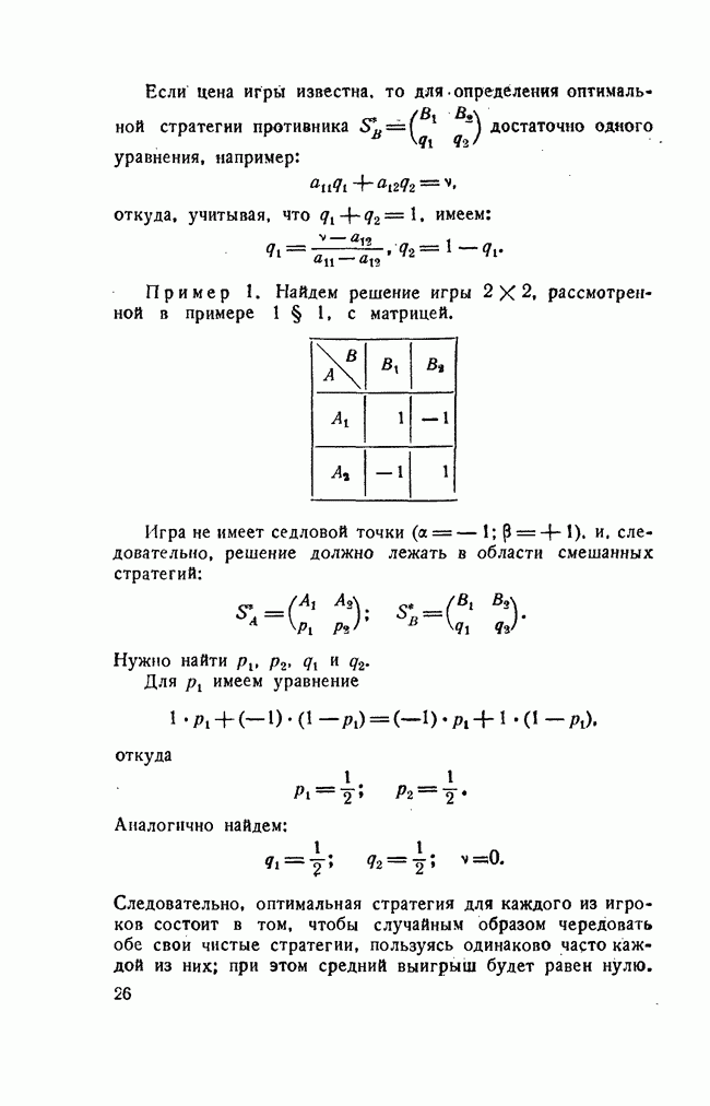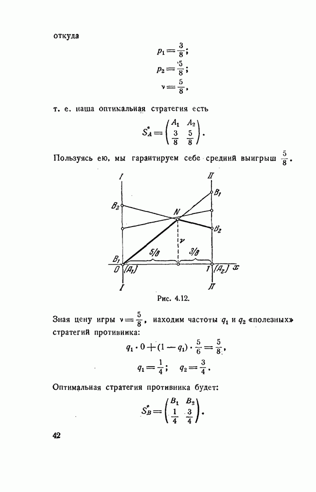 Она отличается тем свойством, что, каковы бы ни были действия противника (если только он не выходит за пределы своих «полезных» стратегий), выигрыш будет равен цене игры v. В игре 2X2 обе стратегии противника являются «полезными», — иначе игра имела бы решение в области чистых стратегий (седловую точку). Значит, если мы придерживаемся своей оптимальной стратегии
