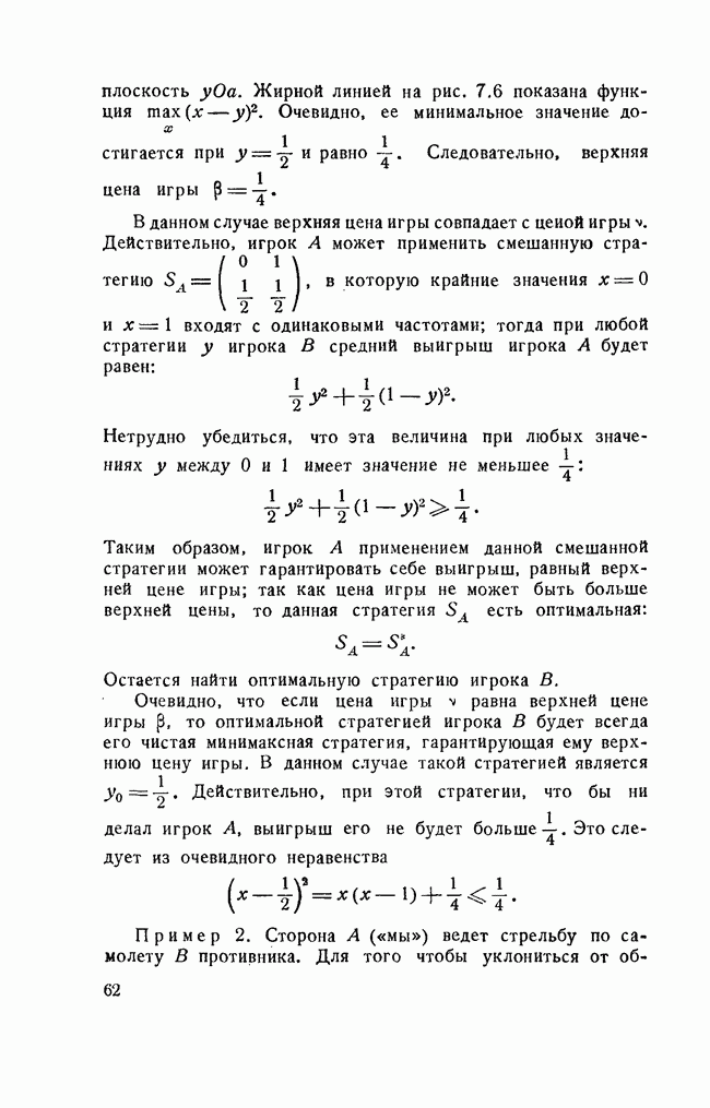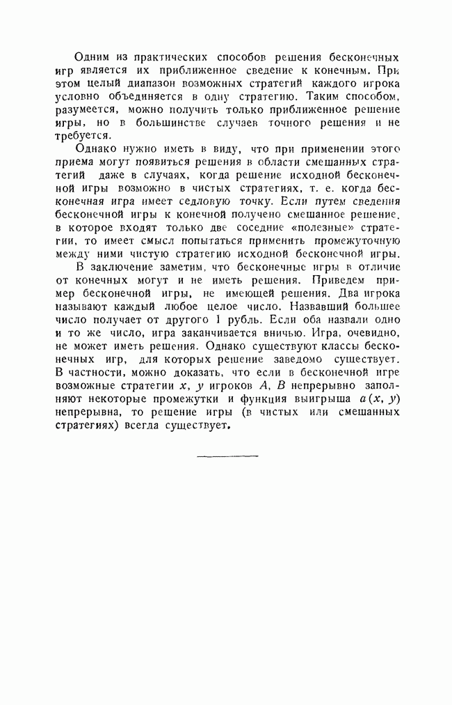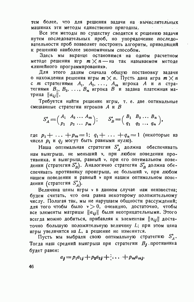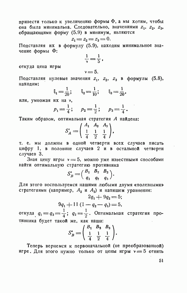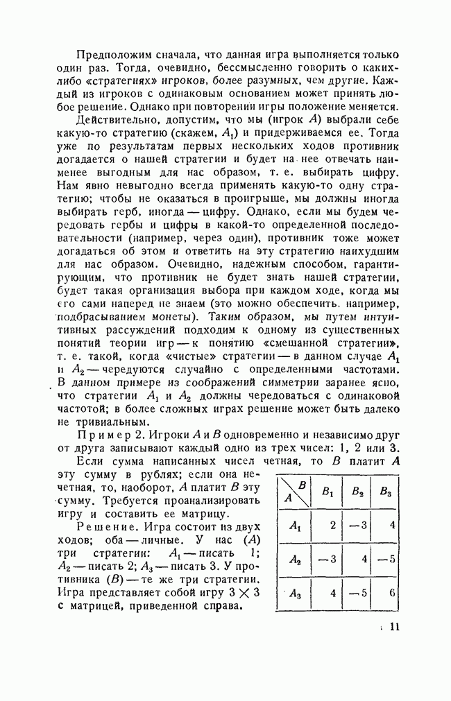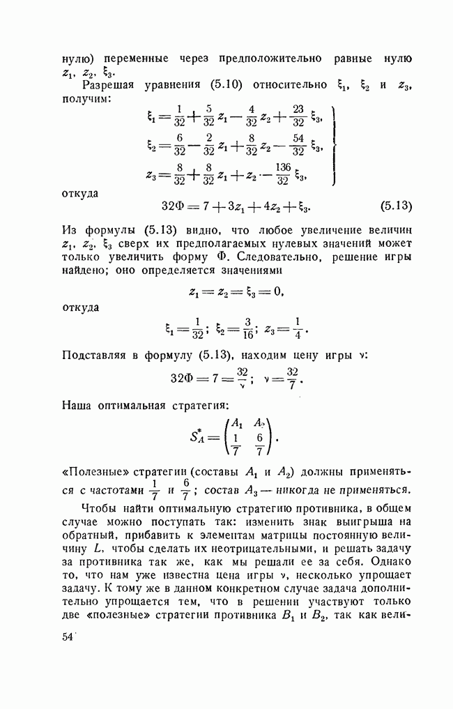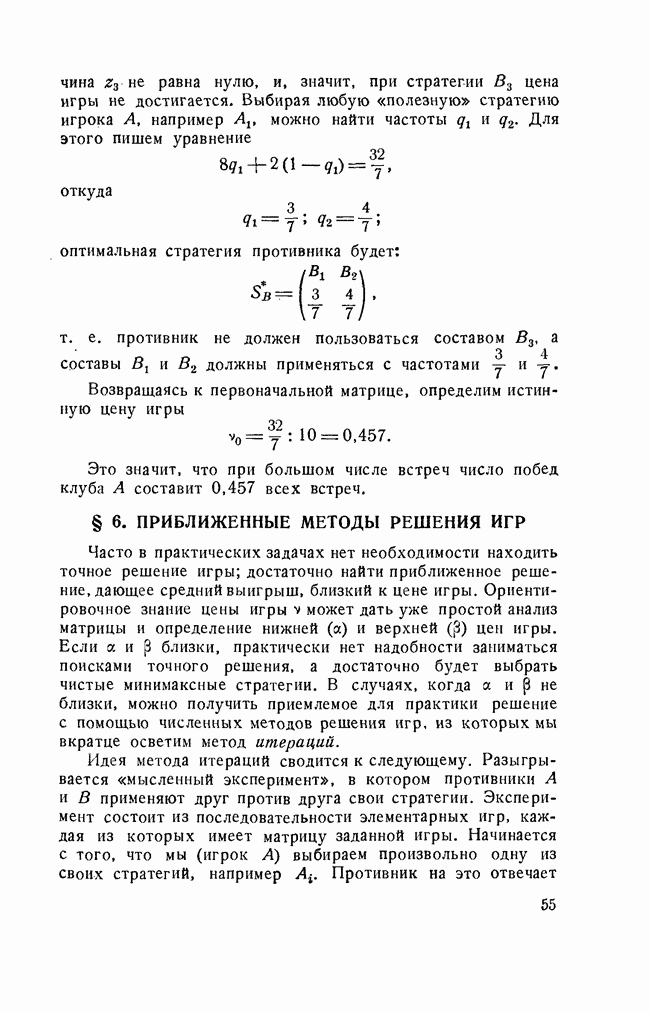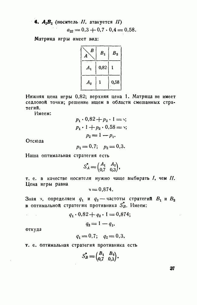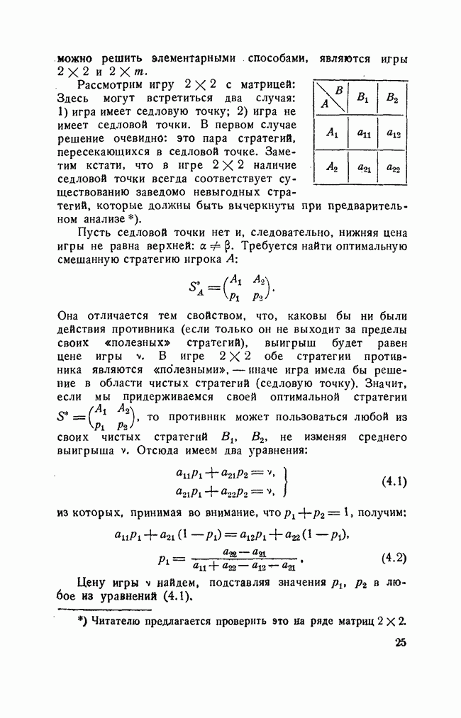 Она отличается тем свойством, что, каковы бы ни были действия противника (если только он не выходит за пределы своих «полезных» стратегий), выигрыш будет равен цене игры v. В игре 2X2 обе стратегии противника являются «полезными», — иначе игра имела бы решение в области чистых стратегий (седловую точку). Значит, если мы придерживаемся своей оптимальной стратегии