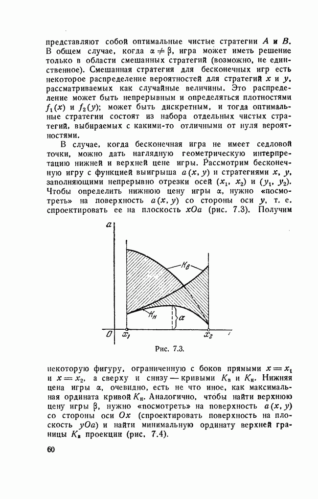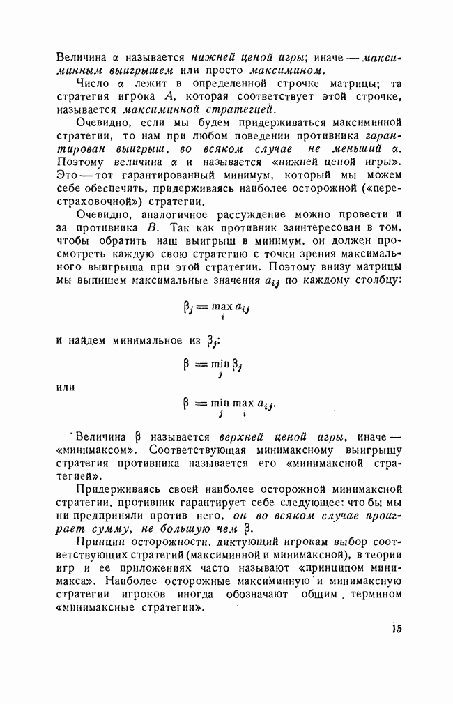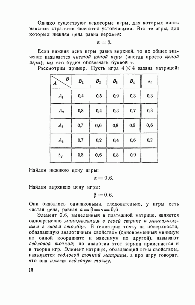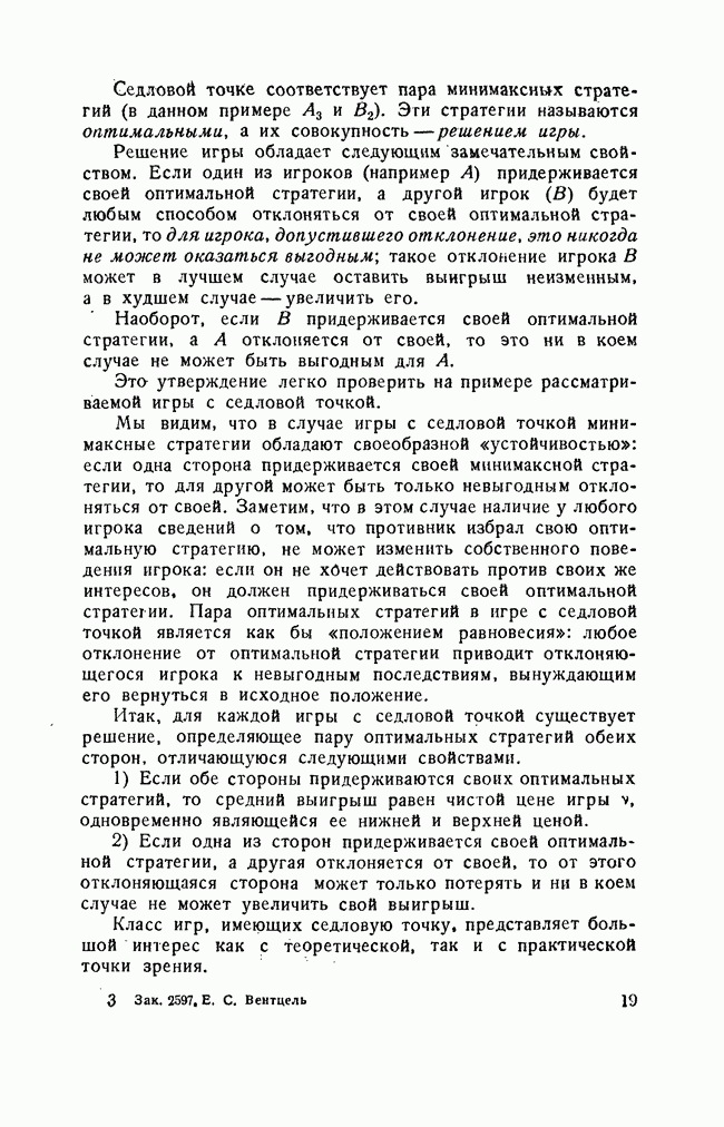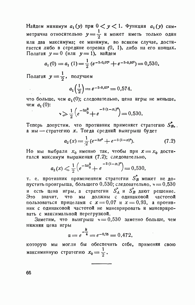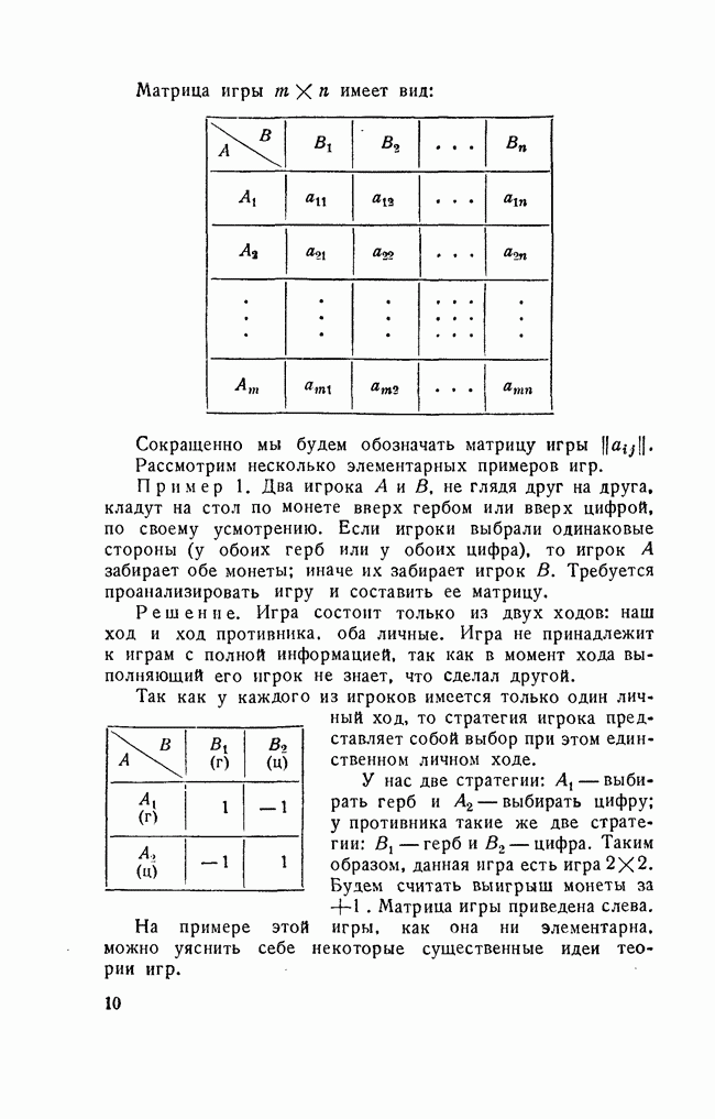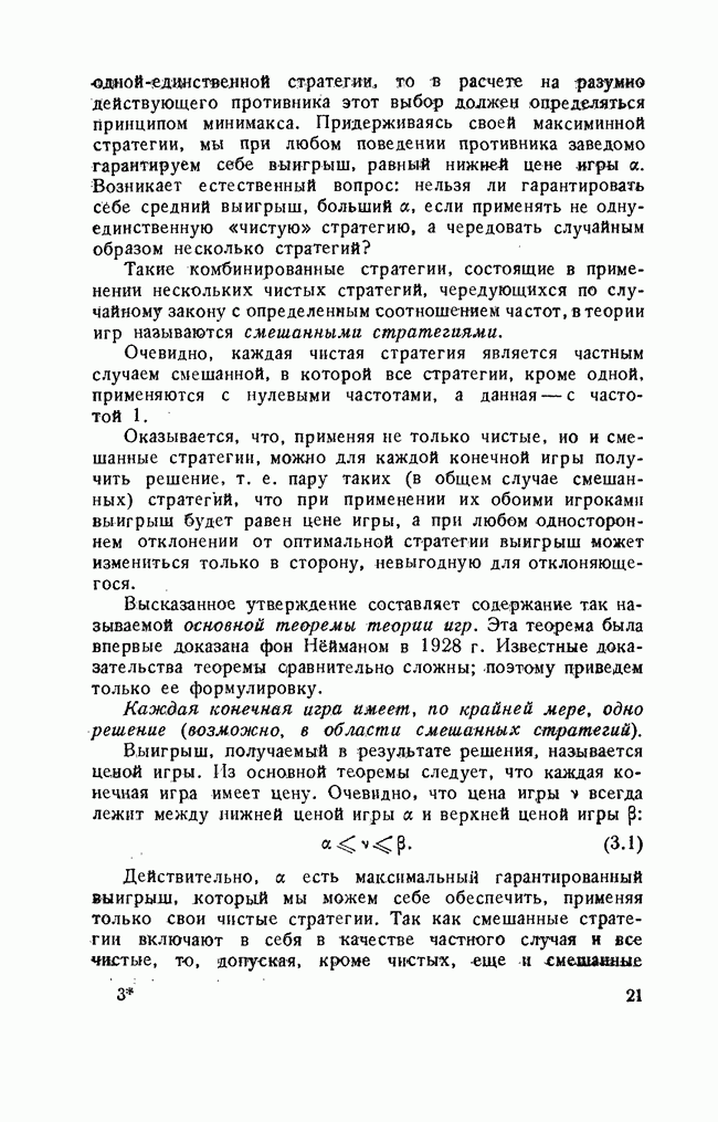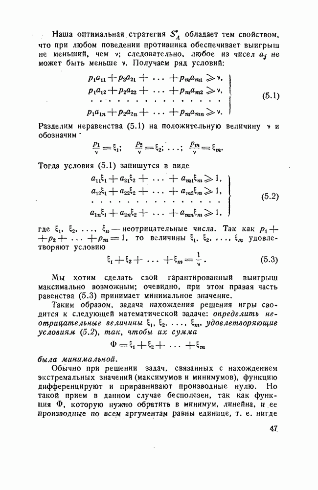 Она отличается тем свойством, что, каковы бы ни были действия противника (если только он не выходит за пределы своих «полезных» стратегий), выигрыш будет равен цене игры v. В игре 2X2 обе стратегии противника являются «полезными», — иначе игра имела бы решение в области чистых стратегий (седловую точку). Значит, если мы придерживаемся своей оптимальной стратегии
