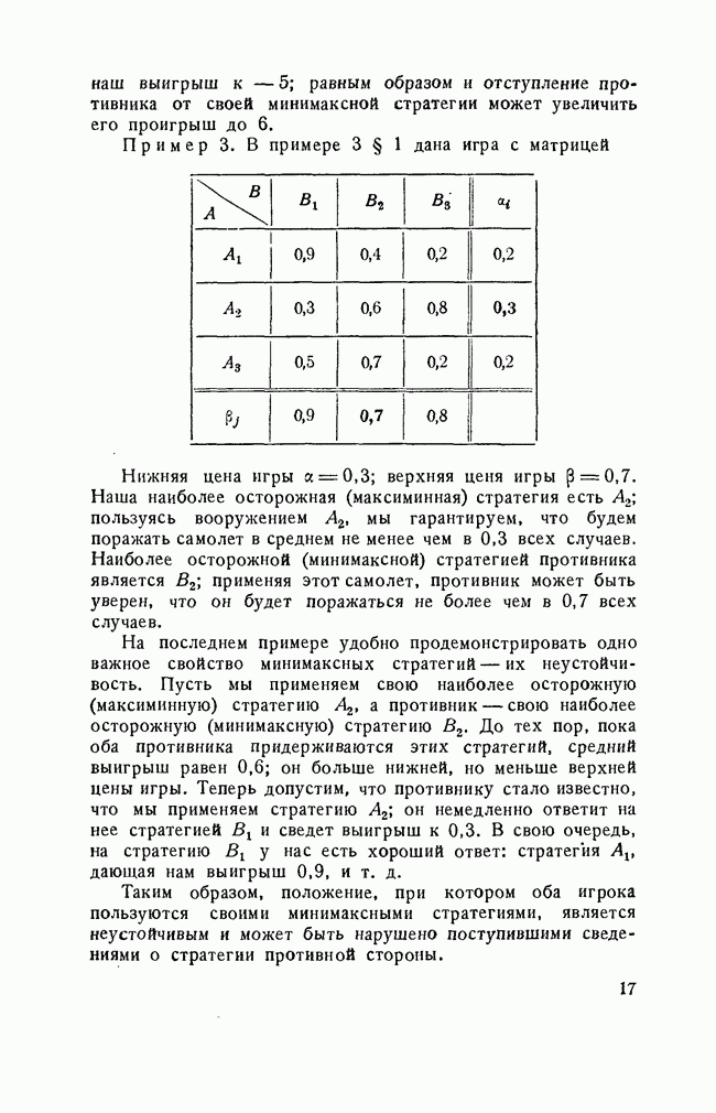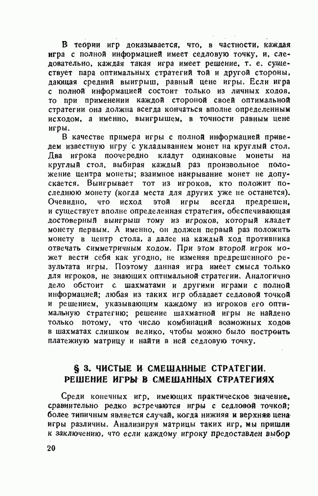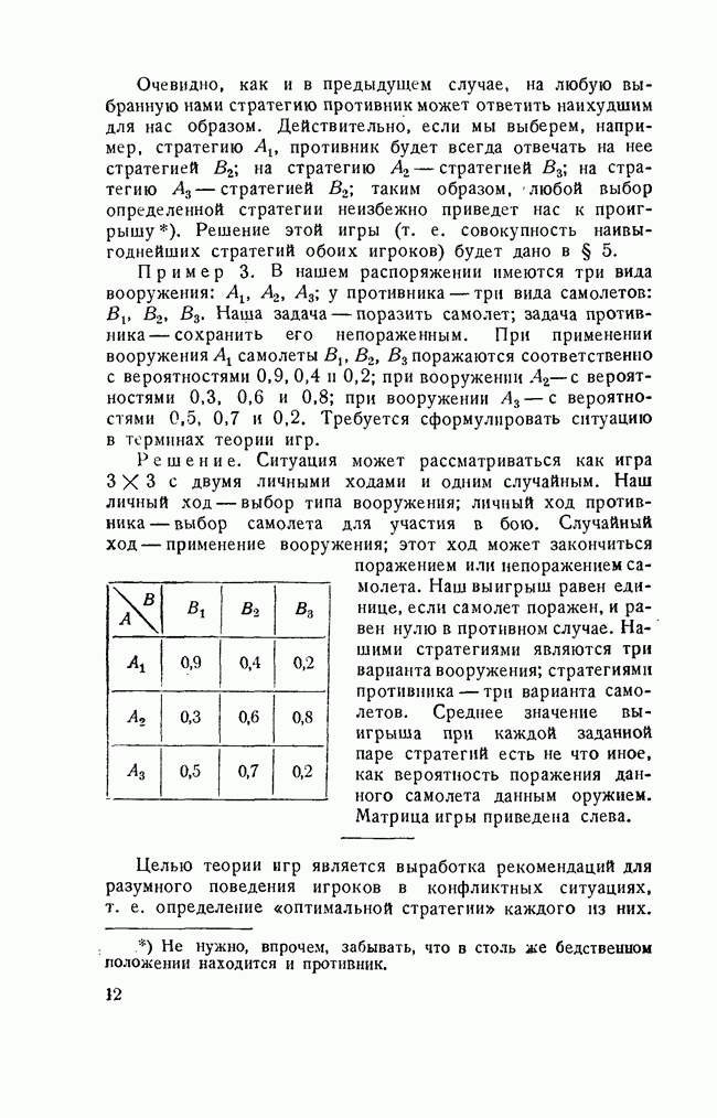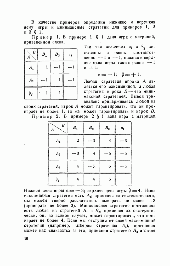 т. е. игрок А должен в одной трети всех случаев пользоваться своей первой стратегией (обманывать), а в двух третях — второй (не обманывать). При этом он будет выигрывать в среднем цену игры