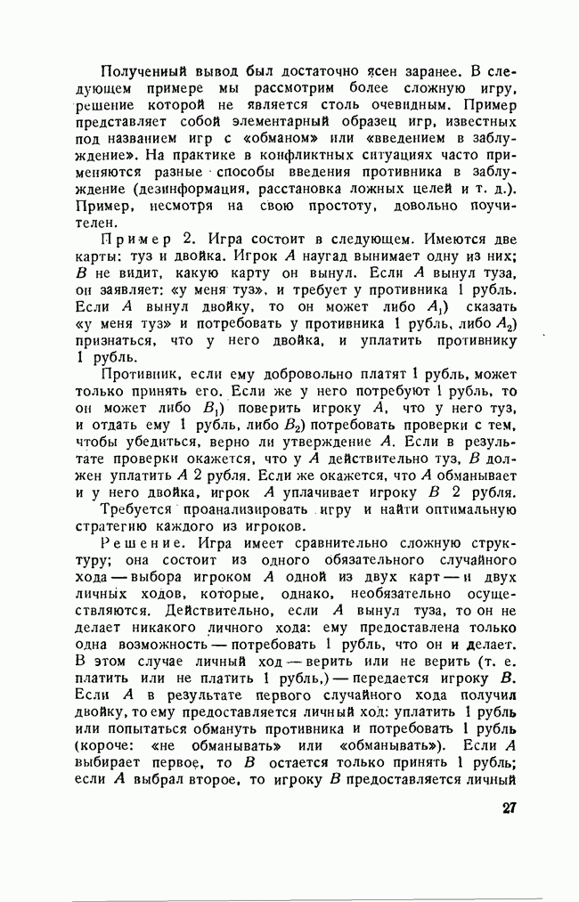Следовательно, оптимальная стратегия для каждого из игроков состоит в том, чтобы случайным образом чередовать обе свои чистые стратегии, пользуясь одинаково часто каждой из них; при этом средний выигрыш будет равен нулю. Полученный вывод был достаточно ясен заранее. В следующем примере мы рассмотрим более сложную игру, решение которой не является столь очевидным. Пример представляет собой элементарный образец игр, известных под названием игр с «обманом» или «введением в заблуждение». На практике в конфликтных ситуациях часто применяются разные - способы введения противника в заблуждение (дезинформация, расстановка ложных целей и т. д.). Пример, несмотря на свою простоту, довольно поучителен. Пример 2. Игра состоит в следующем. Имеются две карты: туз и двойка. Игрок А наугад вынимает одну из них; В не видит, какую карту он вынул. Если А вынул туза, он заявляет: «у меня туз», и требует у противника 1 рубль. Если А вынул двойку, то он может либо Противник, если ему добровольно платят 1 рубль, может только принять его. Если же у него потребуют 1 рубль, то он может либо Требуется проанализировать игру и найти оптимальную стратегию каждого из игроков. Решение. Игра имеет сравнительно сложную структуру; она состоит из одного обязательного случайного хода — выбора игроком А одной из двух карт — и двух личных ходов, которые, однако, необязательно осуществляются. Действительно, если А вынул туза, то он не делает никакого личного хода: ему предоставлена только одна возможность — потребовать 1 рубль, что он и делает. В этом случае личный ход — верить или не верить (т. е. платить или не платить 1 рубль,) — передается игроку В. Если А в результате первого случайного хода получил двойку, то ему предоставляется личный ход: уплатить 1 рубль или попытаться обмануть противника и потребовать 1 рубль (короче: «не обманывать» или «обманывать»). Если А выбирает первое, то В остается только принять 1 рубль; если А выбрал второе, то игроку В предоставляется личный ход: верить или не верить А (т. е. уплатить А 1 рубль или требовать проверки). Стратегии каждого из игроков представляют собой правила, указывающие, как поступить игроку, когда ему предоставляется личный ход. Очевидно, у А только две стратегии: