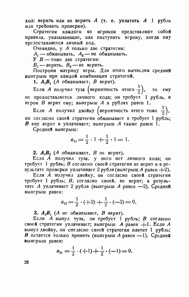 2. Если А получил туза, у него нет личного хода; он требует 1 рубль; В согласно своей стратегии не верит и в результате проверки уплачивает 2 рубля (выигрыш А равен Если А получил двойку, он согласно своей стратегии требует 1 рубль; В, согласно своей, не верит; в результате А уплачивает 2 рубля (выигрыш А равен —2). Средний выигрыш равен:
