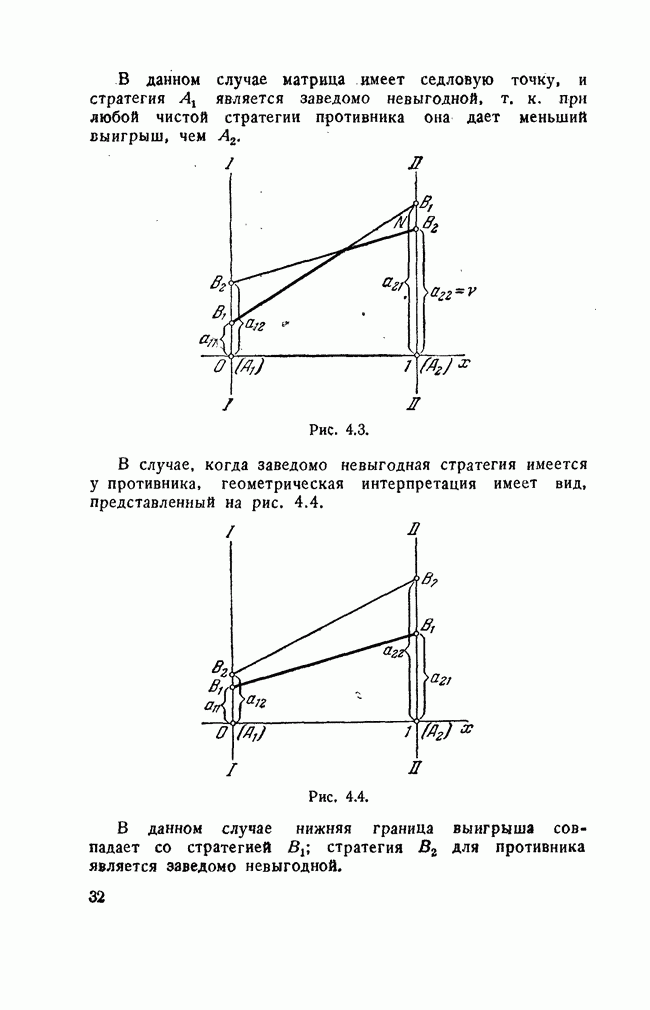 Рис. 4.2. Для этого построим нижнюю границу выигрыша при стратегиях В нашем случае решение игры определялось точкой пересечения стратегий. Однако это не всегда будет так; на рис. 4.3 показан случай, когда, несмотря на наличие пересечения стратегий, решение дает для обоих игроков чистые стратегии В данном случае матрица имеет седловую точку, и стратегия