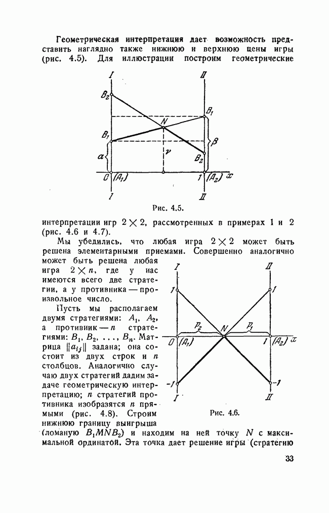 Рис. 4.8. В частности, из этого следует, что у игры и другой стороны участвует не более двух «полезных» стратегий. Пользуясь геометрической интерпретацией, можно дать простой способ решения любой игры 2 X m. Непосредственно по чертежу находим пару «полезных» стратегий противника