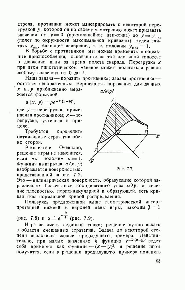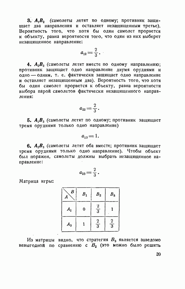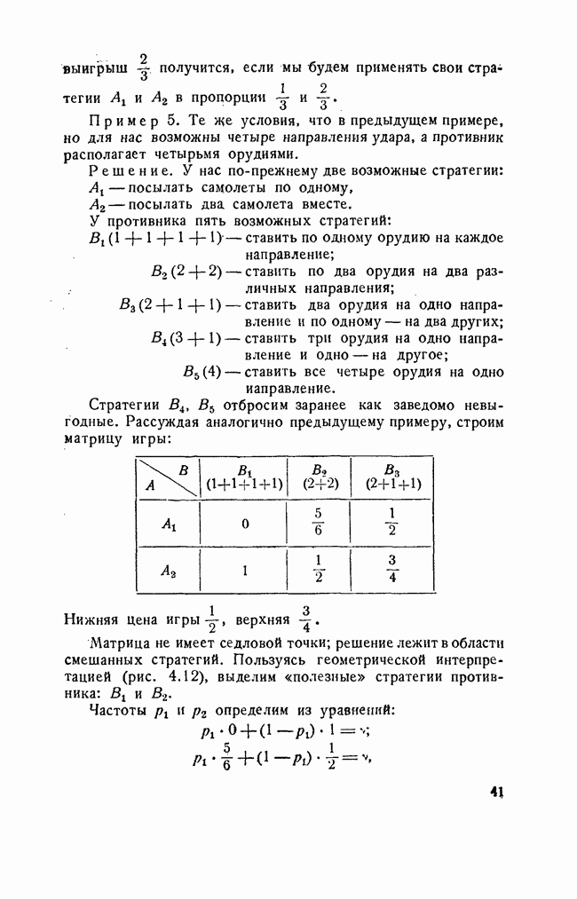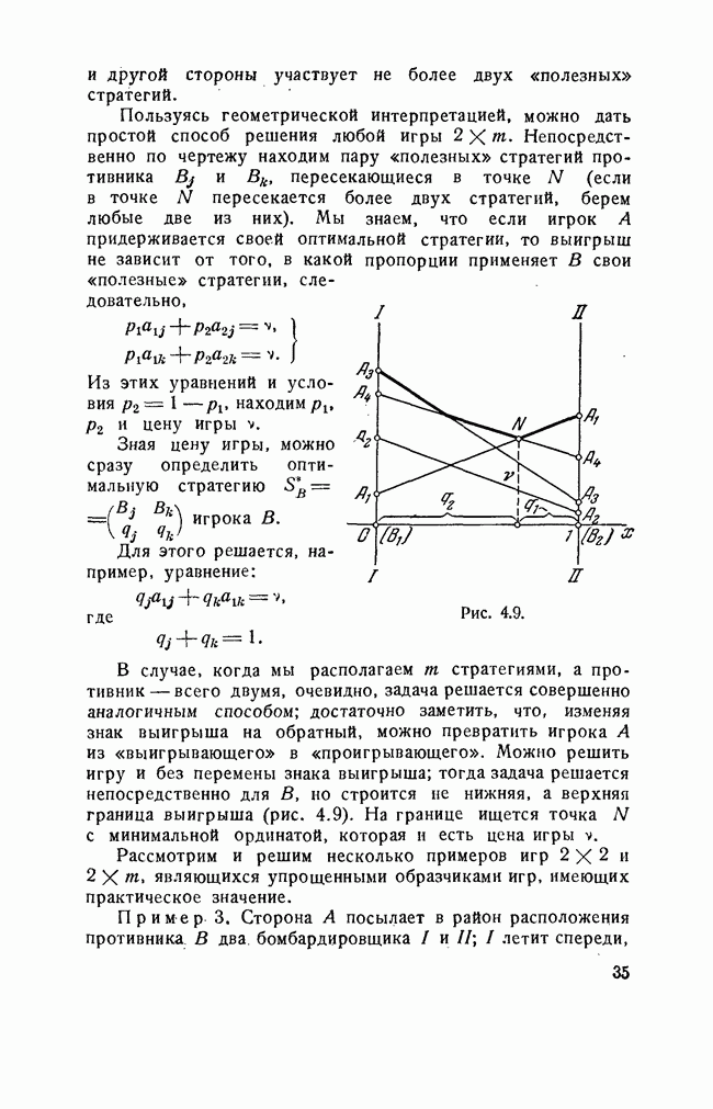 В случае, когда мы располагаем т. стратегиями, а противник — всего двумя, очевидно, задача решается совершенно аналогичным способом; достаточно заметить, что, изменяя знак выигрыша на обратный, можно превратить игрока А из «выигрывающего» в «проигрывающего». Можно решить игру и без перемены знака выигрыша; тогда задача решается непосредственно для В, но строится не нижняя, а верхняя граница выигрыша (рис. 4.9). На границе ищется точка Рассмотрим и решим несколько примеров игр Пример 3. Сторона А посылает в район расположения противника В два бомбардировщика