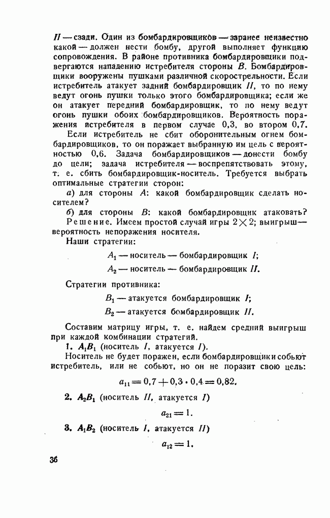 Рис. 4.9. II — сзади. Один из бомбардировщиков — заранее неизвестно какой — должен нести бомбу, другой выполняет функцию сопровождения. В районе противника бомбардировщики подвергаются нападению истребителя стороны В. Бомбардировщики вооружены пушками различной скорострельности. Если истребитель атакует задний бомбардировщик II, то по нему ведут огонь пушки только этого бомбардировщика; если же он атакует передний бомбардировщик, то по нему ведут огонь пушки обоих бомбардировщиков. Вероятность поражения истребителя в первом случае 0,3, во втором 0,7. Если истребитель не сбит оборонительным огнем бомбардировщиков, то он поражает выбранную им цель с вероятностью 0,6. Задача бомбардировщиков — донести бомбу до цели; задача истребителя — воспрепятствовать этому, т. е. сбить бомбардировщик-носитель. Требуется выбрать оптимальные стратегии сторон: а) для стороны А: какой бомбардировщик сделать носителем? б) для стороны В: какой бомбардировщик атаковать? Решение. Имеем простой случай игры 2X2; выигрыш — вероятность непоражения носителя. Наши стратегии: