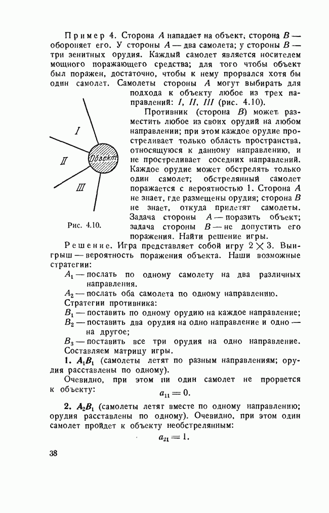 Пример 4. Сторона А нападает на объект, сторона В — обороняет его. У стороны А — два самолета; у стороны В — три зенитных орудия. Каждый самолет является носителем мощного поражающего средства; для того чтобы объект был поражен, достаточно, чтобы к нему прорвался хотя бы один самолет. Самолеты стороны А могут выбирать для подхода к объекту любое из трех направлений: I, II, III (рис. 4.10). Противник (сторона В) может разместить любое из своих орудий на любом направлении; при этом каждое орудие простреливает только область пространства, относящуюся к данному направлению, и не простреливает соседних направлений. Каждое орудие может обстрелять только один самолет; обстрелянный самолет поражается с вероятностью 1. Сторона А не знает, где размещены орудия; сторона В не знает, откуда прилетят самолеты. Задача стороны А — поразить объект; задача стороны В — не допустить его поражения. Найти решение игры. Решение. Игра представляет собой игру 2X3. Выигрыш — вероятность поражения объекта. Наши возможные стратегии: