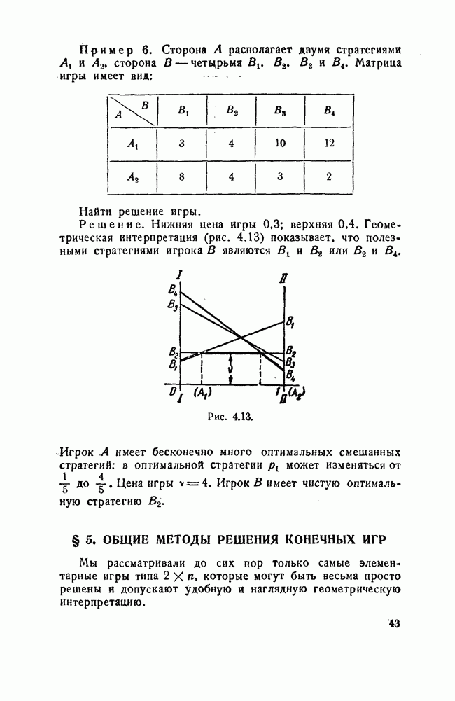 Найти решение игры. Решение. Нижняя цена игры 0,3; верхняя 0,4. Геометрическая интерпретация (рис. 4.13) показывает, что полезными стратегиями игрока В являются и