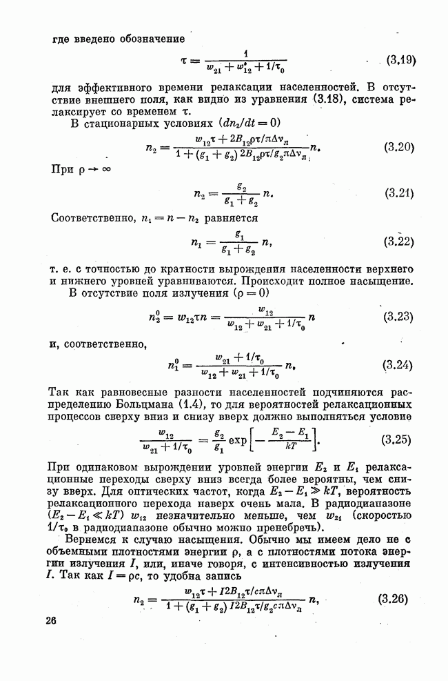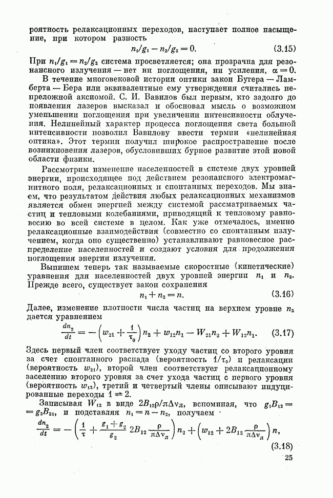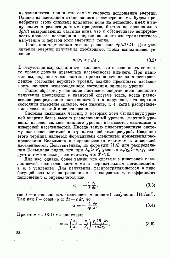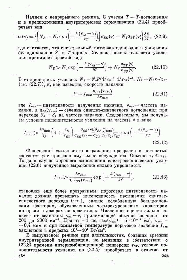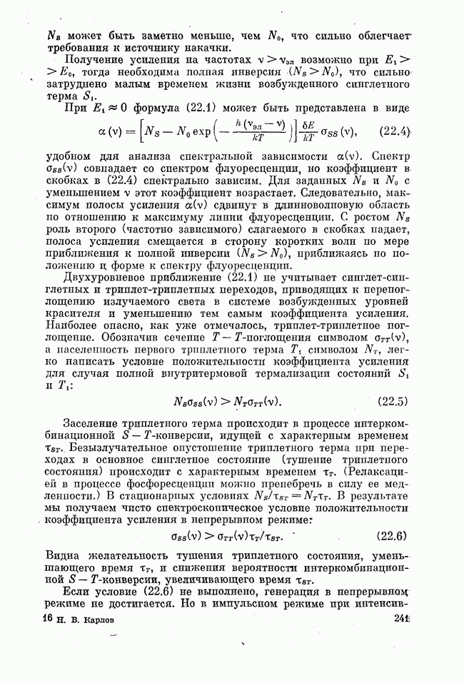 меняются во времени при невыполнении (22.6). Простую оценку можно сделать в трехуровневом приближении (основной и возбужденный синглетные и триплетный уровни) и в пренебрежении индуцированным излучением на частоте усиления с помощью скоростных уравнений: