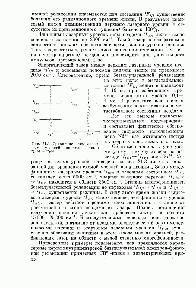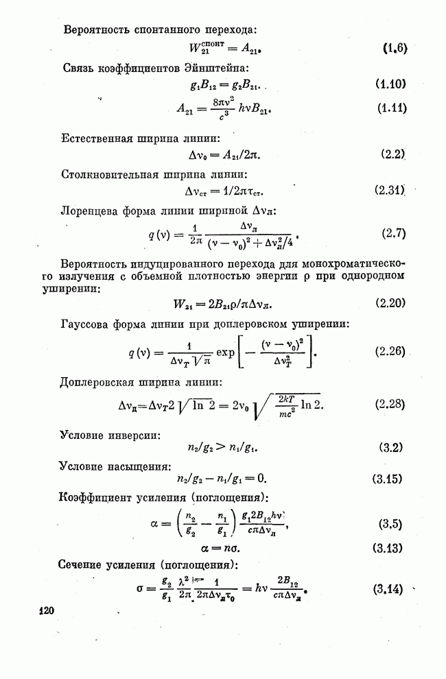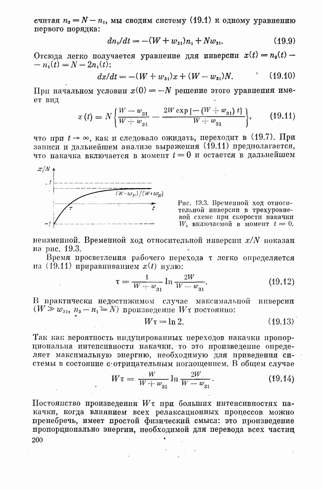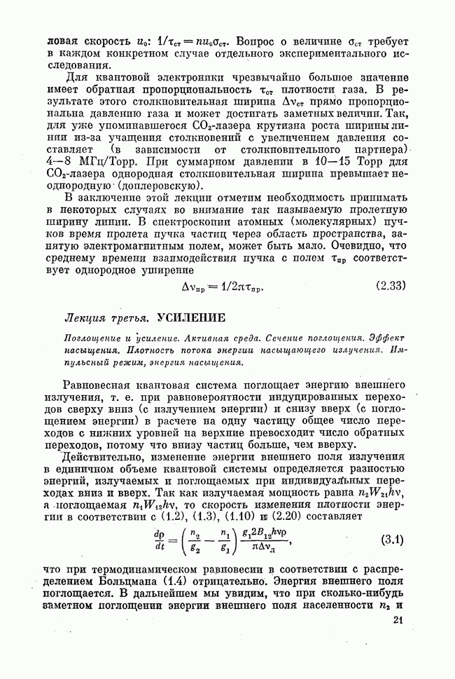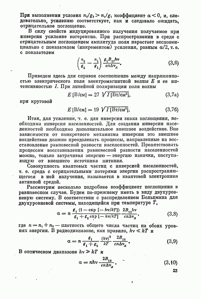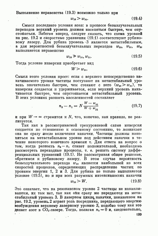 меняются во времени при невыполнении (22.6). Простую оценку можно сделать в трехуровневом приближении (основной и возбужденный синглетные и триплетный уровни) и в пренебрежении индуцированным излучением на частоте усиления с помощью скоростных уравнений: