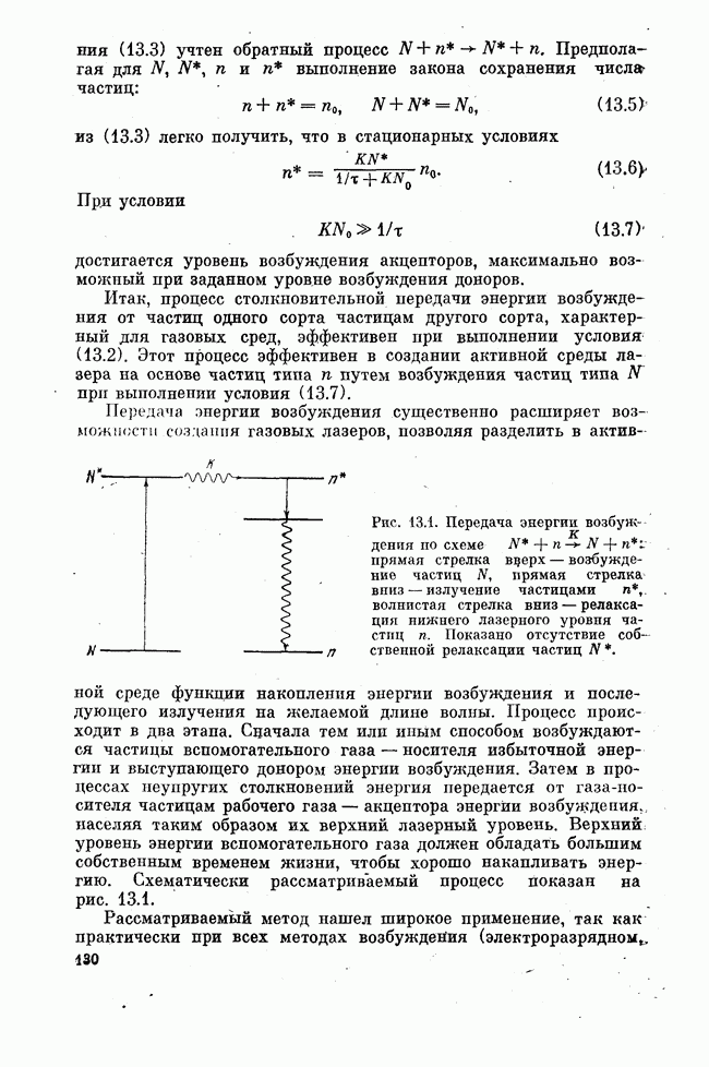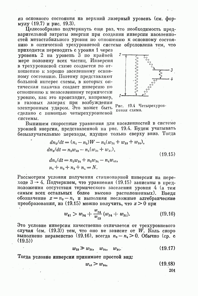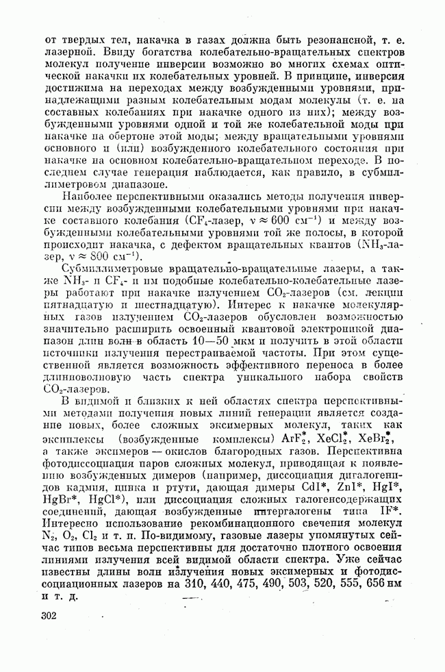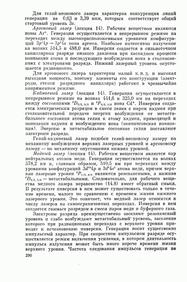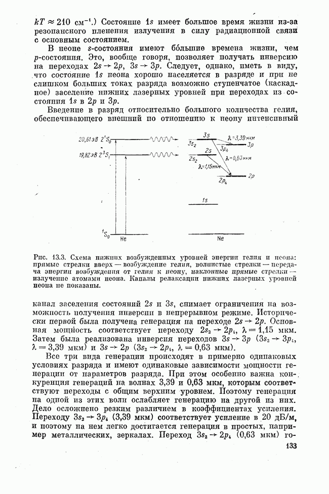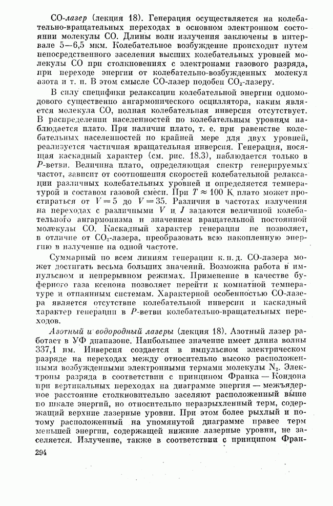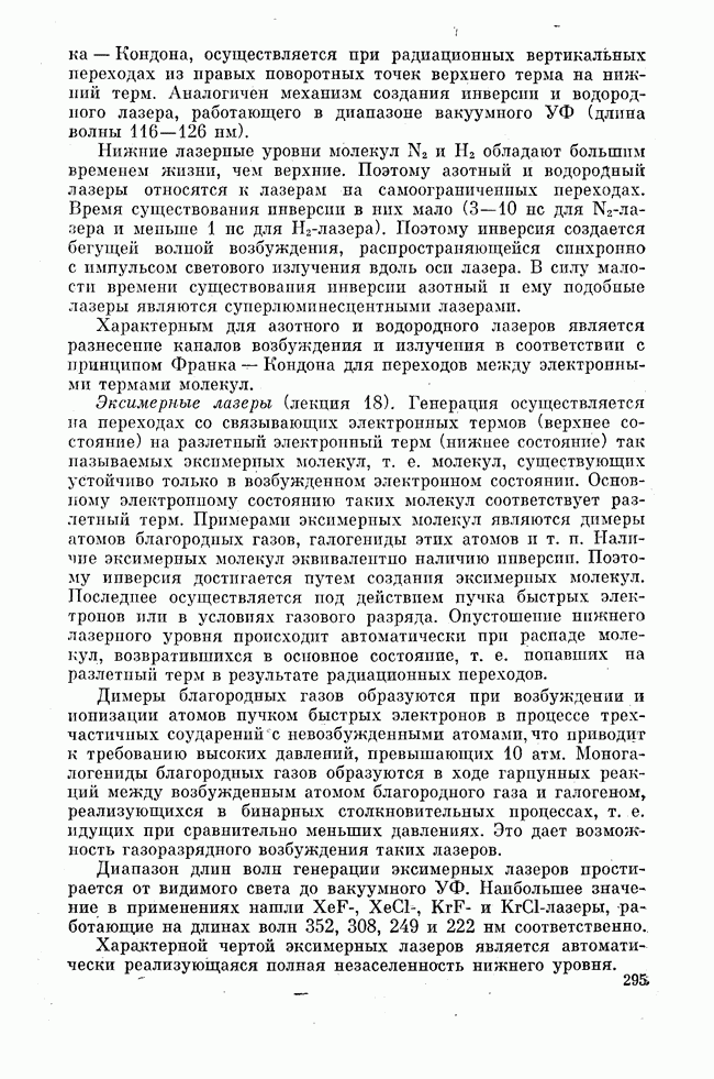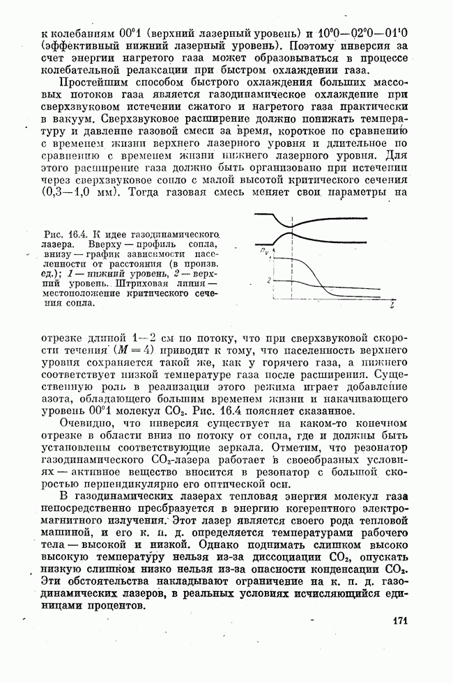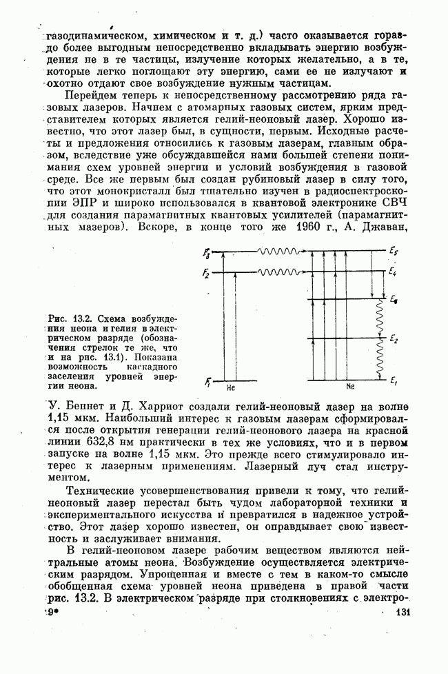 -состояниях, происходит по четырехуровневой схеме, подробно обсуждавшейся ранее применительно к твердотельным лазерам. Это, как мы хорошо знаем, существенно облегчает условия достижения инверсии.
