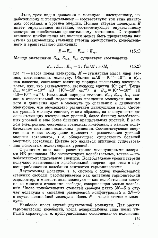 В отличие от газовых лазеров на атомах и (небольших) молекулах, а также от твердотельных лазеров на примесных ионах, в случае лазера на молекулах органических красителей (молекулярная масса 200-600, 20-60 атомов в молекуле) точную схему энергетических уровней изобразить невозможно. Волновые функции различных конфигураций столь многоатомных молекул, обладающих богатейшей комбинацией разрешенных электронных, колебательных и вращательных состояний, неизвестны. Типичное число колебательных степеней свободы этих молекул (см. лекцию пятнадцатую) составляет величину, превышающую 102. Поэтому потенциальные ямы электронных термов, колебательные и вращательные уровни энергии в них должны строиться в весьма