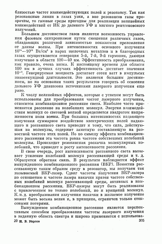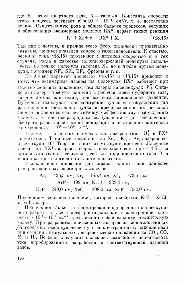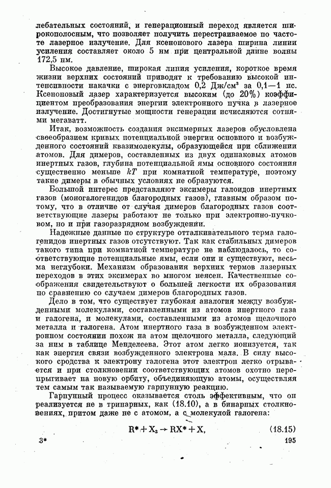 Не останавливаясь на технических деталях, отметим, что накачка красителей излучением импульсных ламп потребовала разработки специальных ламп высокой интенсивности с короткими фронтами включения, не превышающими 0,1-1 мкс. Наилучшие результаты дает, однако, лазерная накачка. В импульсном режиме используются вторая гармоника рубинового лазера (0,347 мкм), вторая (0,53 мкм), третья (0,353 мкм) и четвертая (0,265 мкм) гармоники неодимового лазера, а также излучения медного, азотного и эксимерных лазеров. Последние позволяют получать высокую частоту следования импульсов.
