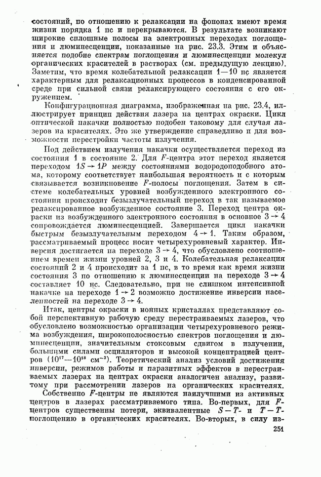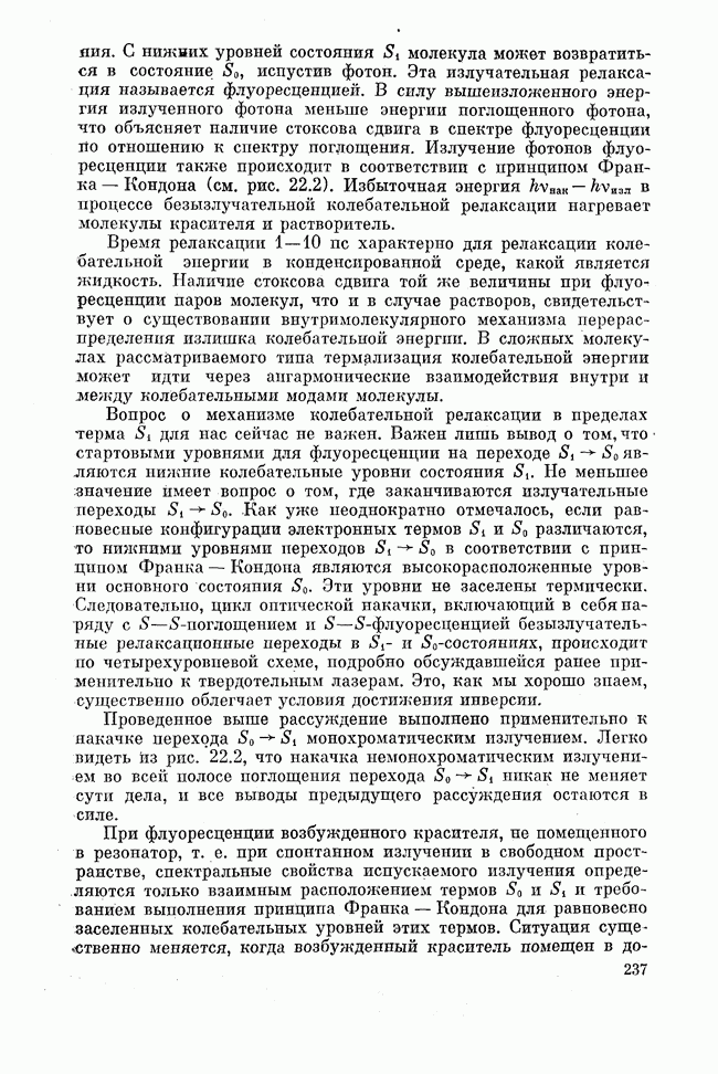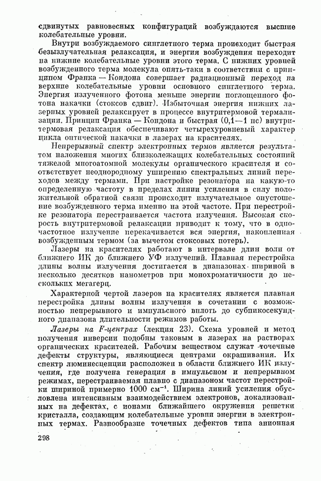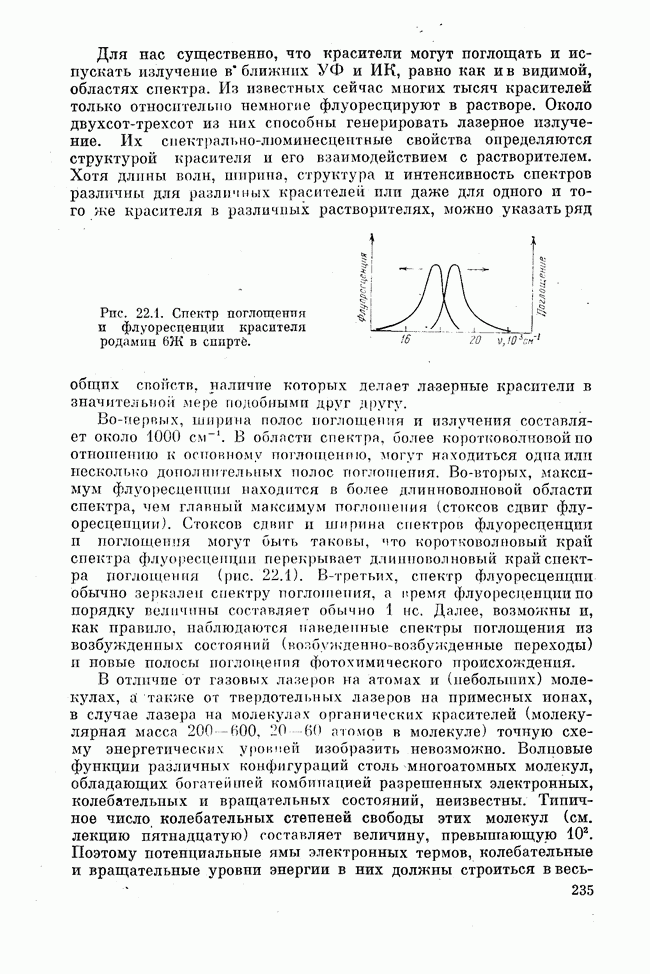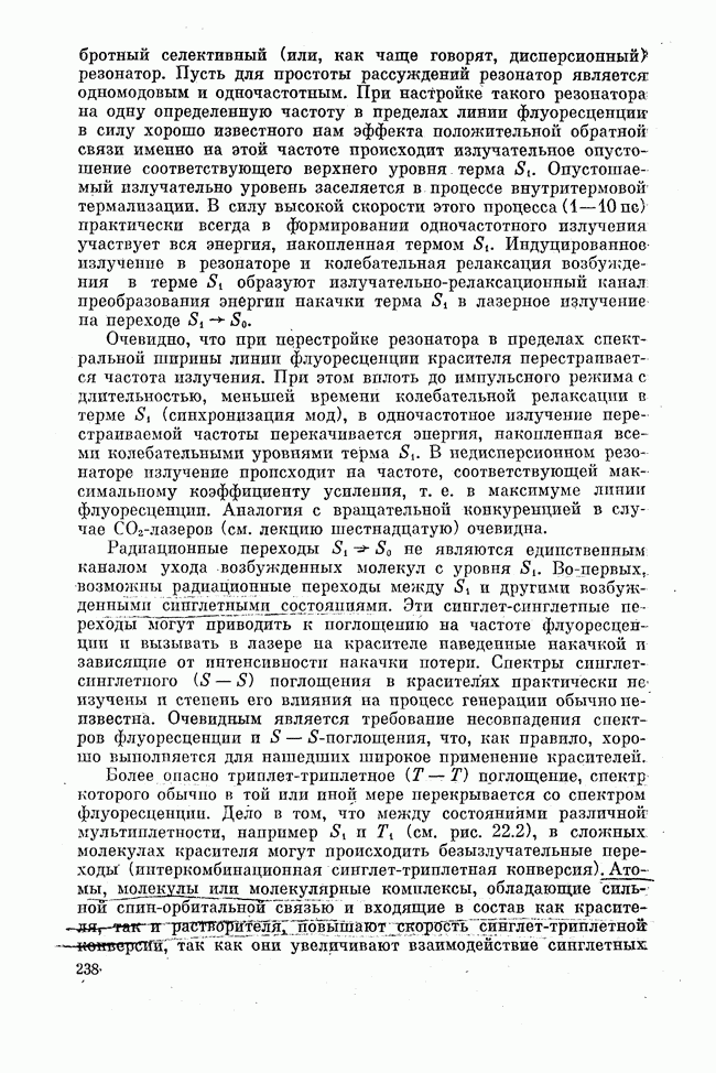 и другими возбужденными синглетными состояниями. Эти синглет-синглетные переходы могут приводить к поглощению на частоте флуоресценции и вызывать в лазере на красителе наведенные накачкой и зависящие от интенсивности накачки потери. Спектры синглет-синглетного