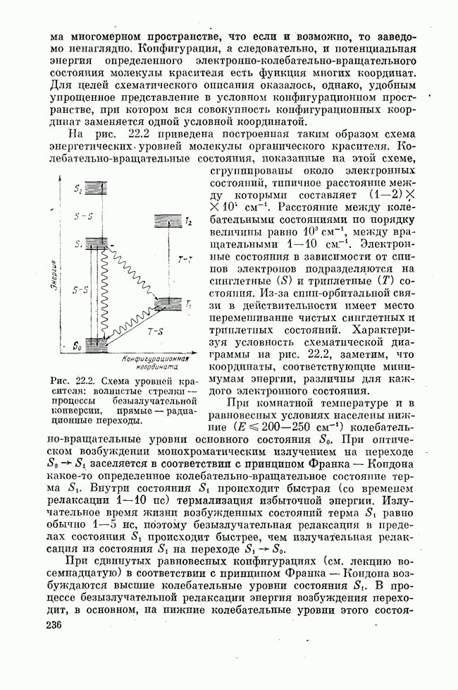 На рис. 22.2 приведена построенная таким образом схема энергетических-уровней молекулы органического красителя. Колебательно-вращательные состояния, показанные на этой схеме, сгруппированы около электронных состояний, типичное расстояние между которыми составляет