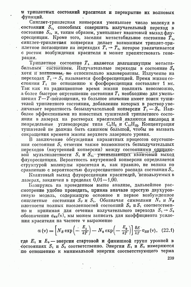 Двухуровневое приближение (22.1) не учитывает синглет-синглетных и триплет-триплетных переходов, приводящих к перепоглощению излучаемого света в системе возбужденных уровней красителя и уменьшению тем самым коэффициента усиления. Наиболее опасно, как уже отмечалось, триплет-триплетное поглощение. Обозначив сечение