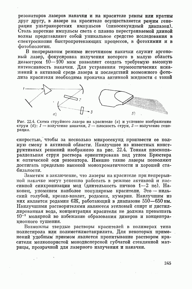 В непрерывном режиме источником накачки служит аргоновый лазер, фокусировка излучения которого в малую область диаметром 10—100 мкм позволяет создать требуемую высокую интенсивность накачки. Для устранения термооптических искажений в активной среде лазера и последствий возможного фотолиза красителя необходима прокачка активной жидкости с такой скоростью, чтобы за несколько микросекунд произвести ее полную смену в активной области. Наилучшее из известных конструктивных решений изображено на рис. 22.4. Тонкая плоскопараллельная струя раствора ориентирована под углом Брюстера к оптической оси резонатора. Именно такие лазеры позволяют достигать предельно высокой монохроматичности и хорошей стабильности.