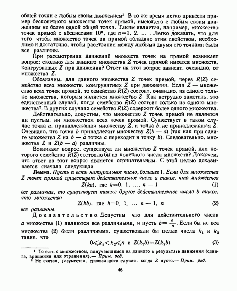 общей точки с любым своим движением. В то же время легко привести пример бесконечного множества точек прямой, имеющего с любым своим движением не более одной общей точки. Таким является, например, множество точек прямой с абсциссами