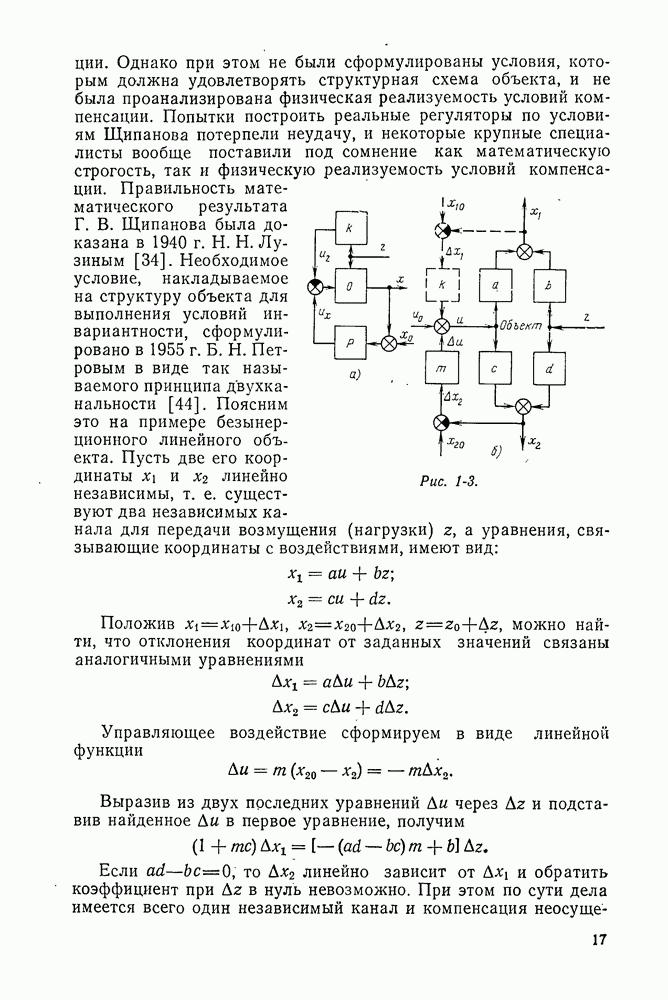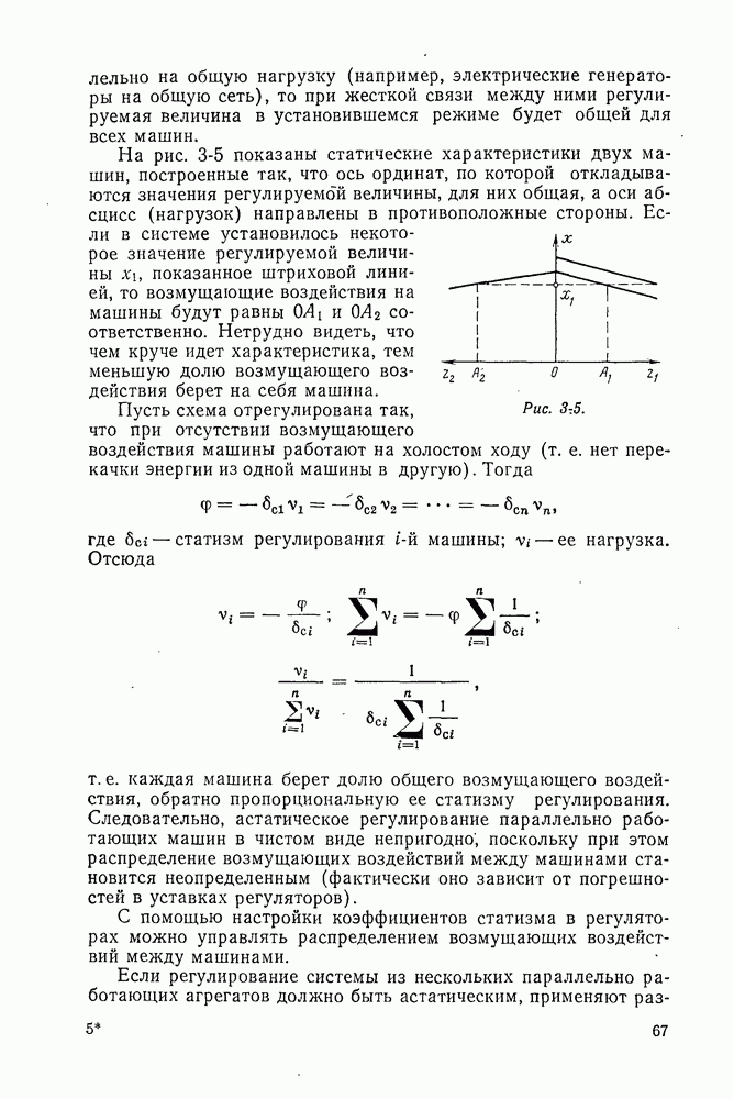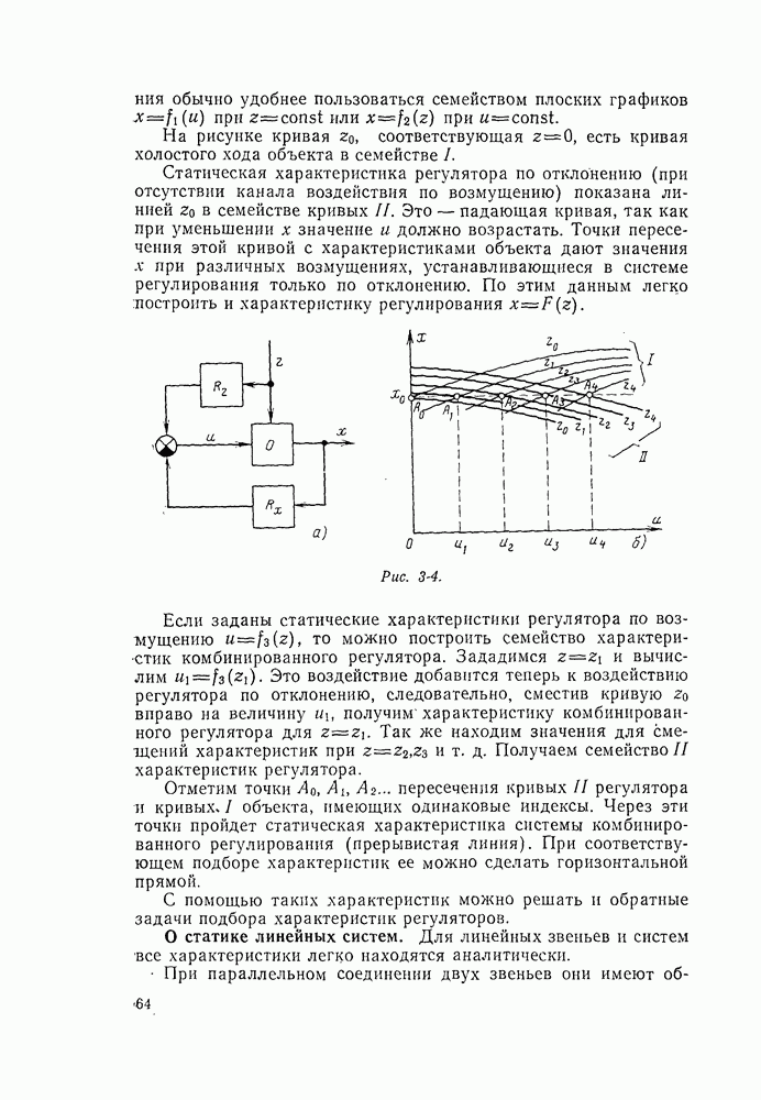 Рассмотрим обобщенную схему комбинированного регулирования одной величины (рис. 3-4, а). На объект О действуют возмущающее воздействие z (нагрузка) и управление и. Регулятор представлен в виде двух частей: реагирующей на отклонение реагирующей на возмущение z. Статические характеристики объекта представлены на рис. 3-4, б семейством кривых I, обозначенных