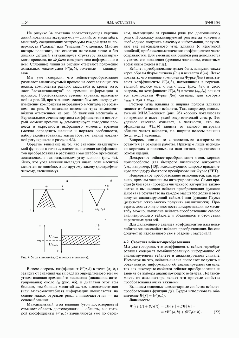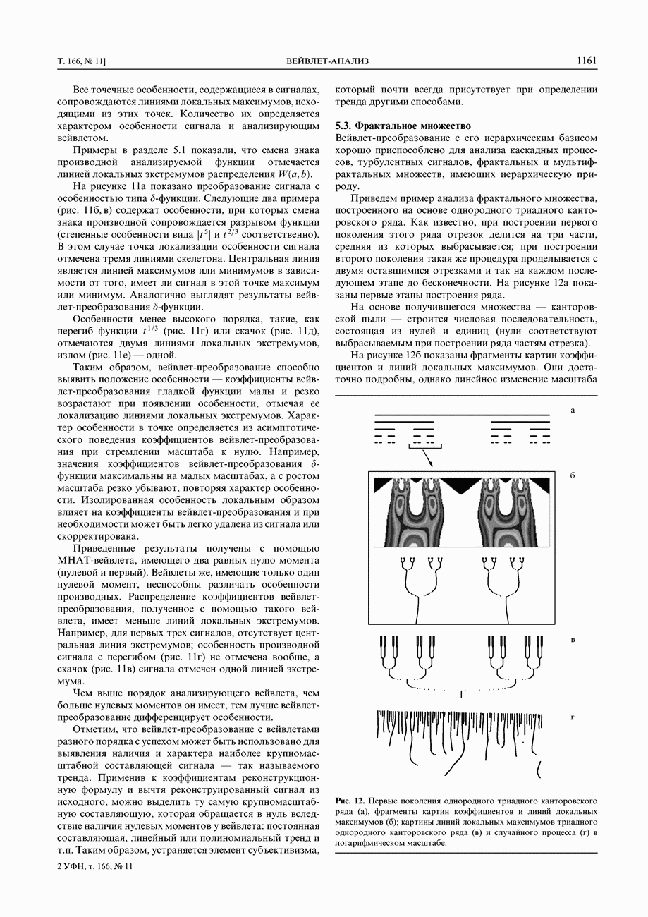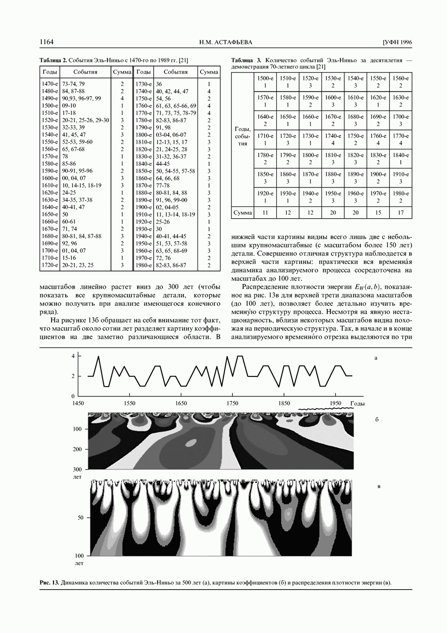 Рис. 14. Среднемесячные значения индекса Южного Колебания (а), картина коэффициентов (б), картина распределения плотности энергии (в), а также картина коэффициентов (г) для фрагмента, взятого в рамку на рис. б. положительных экстремумов между ними. Ствол дерева и две его почти одновременно начинающиеся ветви выделяют два практически одинаковых периода — между Эль-Ниньо на границах дерева и в его середине по 39,8 лет (что согласуется с масштабом около 40 лет для 500-летних данных и свидетельствует в пользу существования 75-80-летнего цикла). Распределение плотности энергии (рис. 14в) показывает, что мелкомасштабная часть процесса демонстрирует наличие диапазонов локальных периодичностей и, кроме того, качественное отличие структуры процесса в отрезки времени, принадлежащие и не принадлежащие дереву. Внутренняя часть дерева содержит, в основном, детали с характерными масштабами около 30 и 12 месяцев, а внешние части дерева составлены, в основном, из деталей с масштабом около 18 месяцев. Возможно, наличием эпох с разной временной структурой можно объяснить отмечаемое многими авторами изменение характера сценариев Эль-Ниньо после середины 70-х годов. В этой связи следует сказать, что при изучении процесса ЮКЭН (и, возможно, не только ЮКЭН) не следует делать слишком категорических выводов, опираясь в анализе на наблюдения в течение последних нескольких десятилетий. Необходим анализ гораздо более представительных данных (в нашем случае, например, ряды наблюдений за последние 30 лет оказались бы недостаточными). Однако вернемся к структуре картины коэффициентов. Два крупномасштабных минимума на границах дерева и один между его ветвями соответствуют интенсивным и продолжительным явлениям Эль-Ниньо 1899-1902,1940-1941 и 1982-1983 годов. При сравнении с 500-летними данными можно убедиться, что эти сильнейшие за последнее столетие Эль-Ниньо являются вполне ординарными событиями. Несмотря на то что 500-летние данные не содержат информации об интенсивности процесса и усреднены по 12 месяцам, детали картин хорошо согласуются. Можно считать, что реконструированная за последние 500 лет хронология событий Эль-Ниньо неплохо описывает динамику Южного Колебания на больших временах (порядка нескольких десятилетий). Более подробно ветви дерева показаны на рис. 14г: здесь масштаб растет до 29 лет. Картины коэффициентов (и линий локальных максимумов) демонстрируют непростую иерархическую структуру. Если в основании дерева мы отметили укрупнение масштаба в виде удвоения периода, то уже две главные ветви дерева ветвятся по-разному — левая на три, а правая на две ветви. На более мелких масштабах продолжается, как кажется, нерегулярное чередование удвоения и утроения линий локальных максимумов. Встречаются и ветвления типа водораздела, когда в главную линию локальных максимумов по мере роста масштаба вливаются последовательно несколько побочных. Внешне похожие ветвления можно смоделировать канторовским множеством, когда из единичного отрезка (у нас это примерно 80 лет) удаляется средняя треть, из оставшихся частей также удаляются средние трети и т.д. (модель удвоения линий локальных максимумов); или удаляются две из пяти частей единичного отрезка и т.д. в каждом следующем поколении из каждой части (модель утроения). В нашем случае процесс сложнее по крайней мере в двух отно
