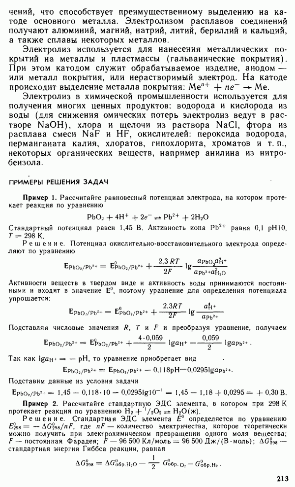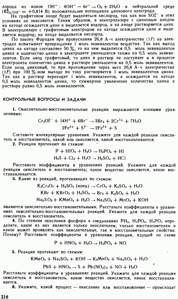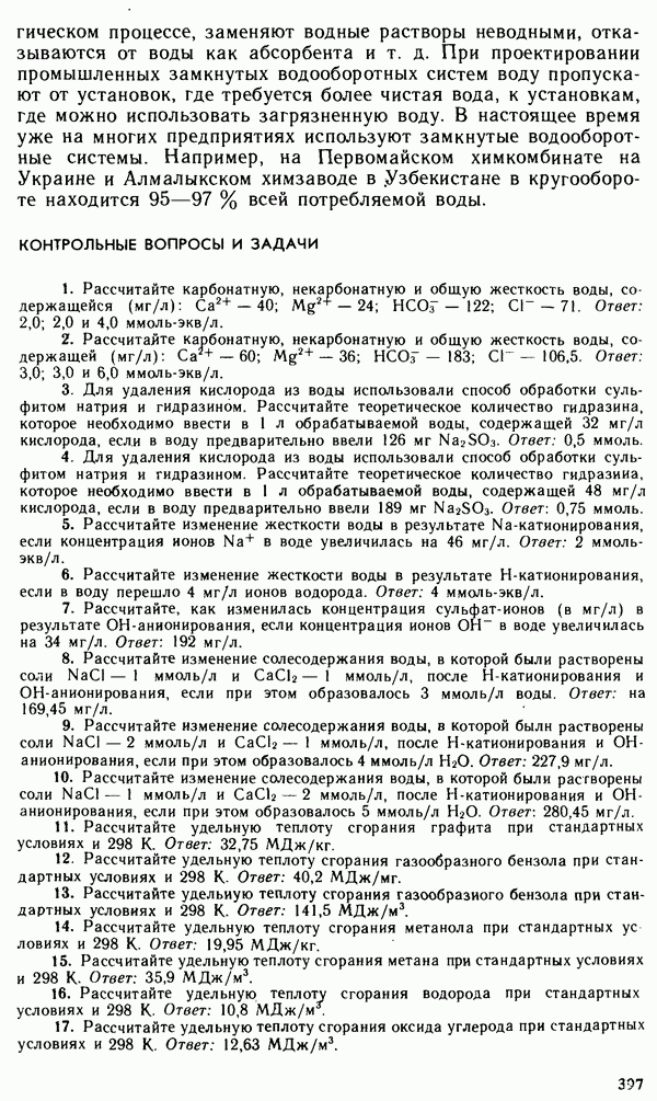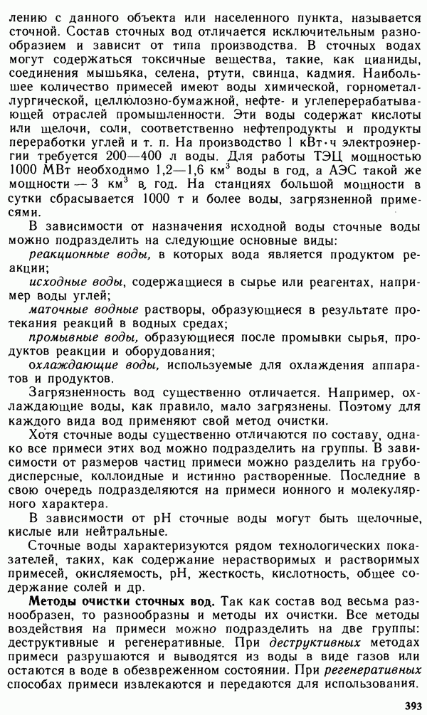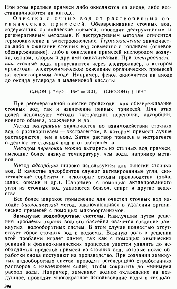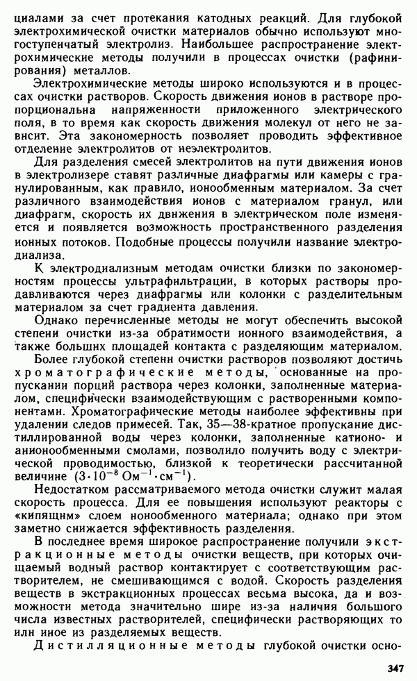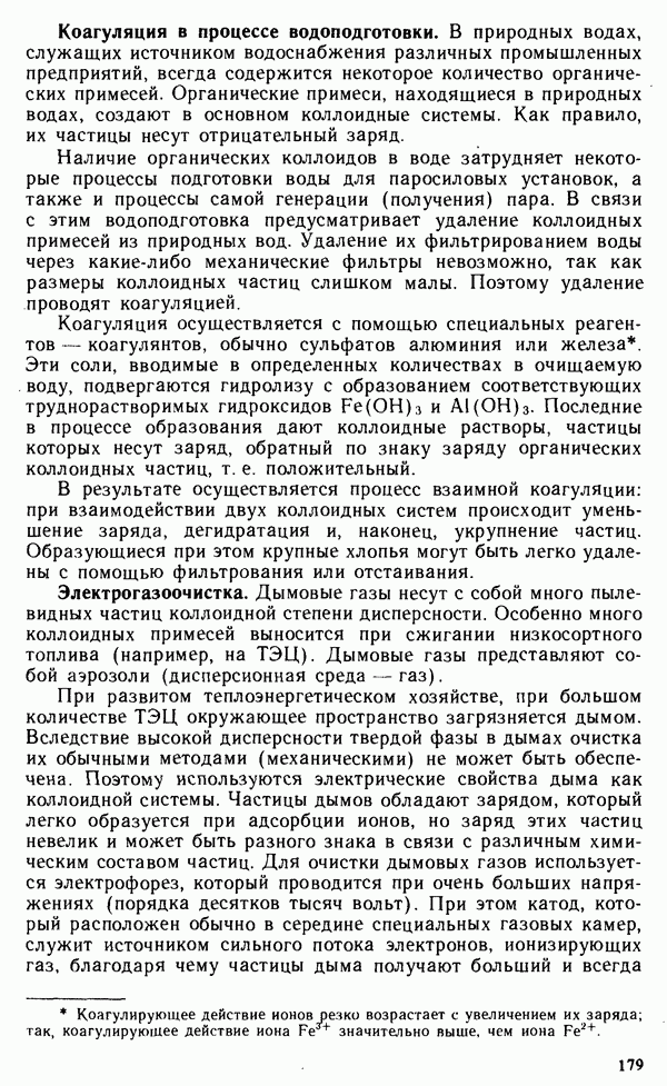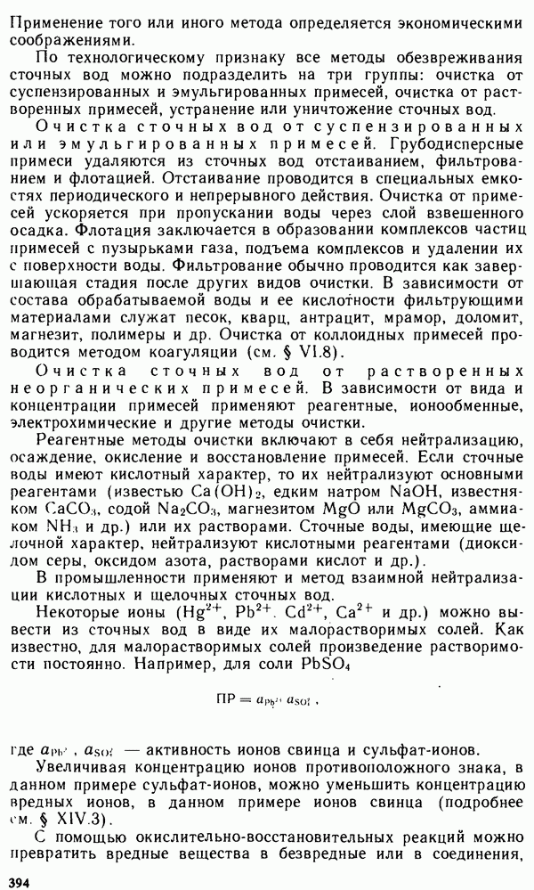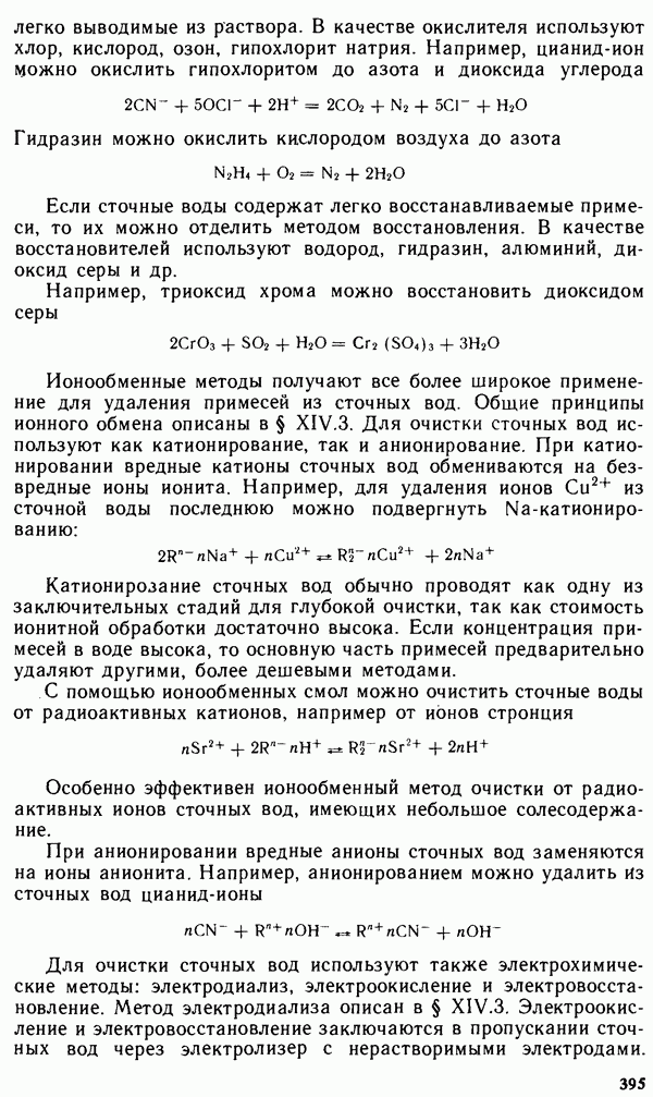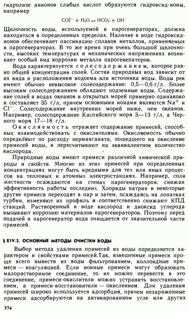 § ХIV.3. ОСНОВНЫЕ МЕТОДЫ ОЧИСТКИ ВОДЫВыбор метода удаления примесей из воды определяется характером и свойствами примесей. Так, взвешенные примеси проще всего вывести из воды фильтрованием, коллоидные примеси — коагуляцией. Если ионные примеси могут образовать малорастворимое соединение, то их можно перевести в это соединение, примеси-окислители можно устранить восстановлением, а примеси-восстановители — окислением. Для удаления примесей широко используется адсорбция, причем незаряженные примеси адсорбируются на активированном угле или других адсорбентах, а ионы — на ионообменных веществах. Заряженные примеси можно также удалить электрохимическими методами. Таким образом, знание состава и свойств примесей позволяет выбрать способ очистки воды. Удаление кислорода из воды.Кислород, растворенный в воде, вызывает коррозию металла парогенераторов электростанций, трубопроводов станций и тепловых сетей, поэтому должен быть удален из воды. Удаление кислорода осуществляется деаэрацией и химическим восстановлением. Деаэрация основана на использовании закона Генри, согласно которому растворимость газа прямо пропорциональна его давлению над жидкостью. Снижая парциальное давление газа над жидкостью, можно снизить растворимость его в жидкости. Парциальное давление можно снизить или уменьшением общего давления газа, или вытеснением данного газа другим газом. В практике используют оба приема. Обычно воду продувают водяным паром, при этом парциальное давление кислорода уменьшается. Однако методом деаэрации не удается обеспечит» глубокое удаление кислорода. Последнее достигается взаимодействием кислорода с химическими восстановителями. Первоначально для этих целей использовался сульфит натрия, который при окислении переходит в сульфат натрия: