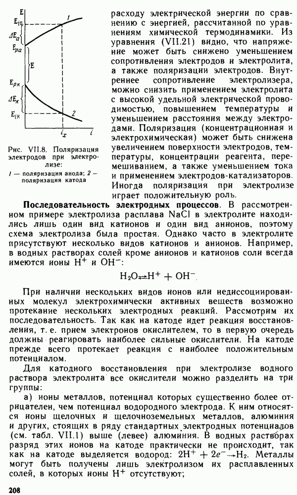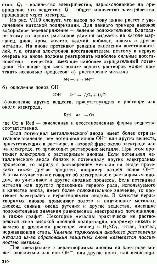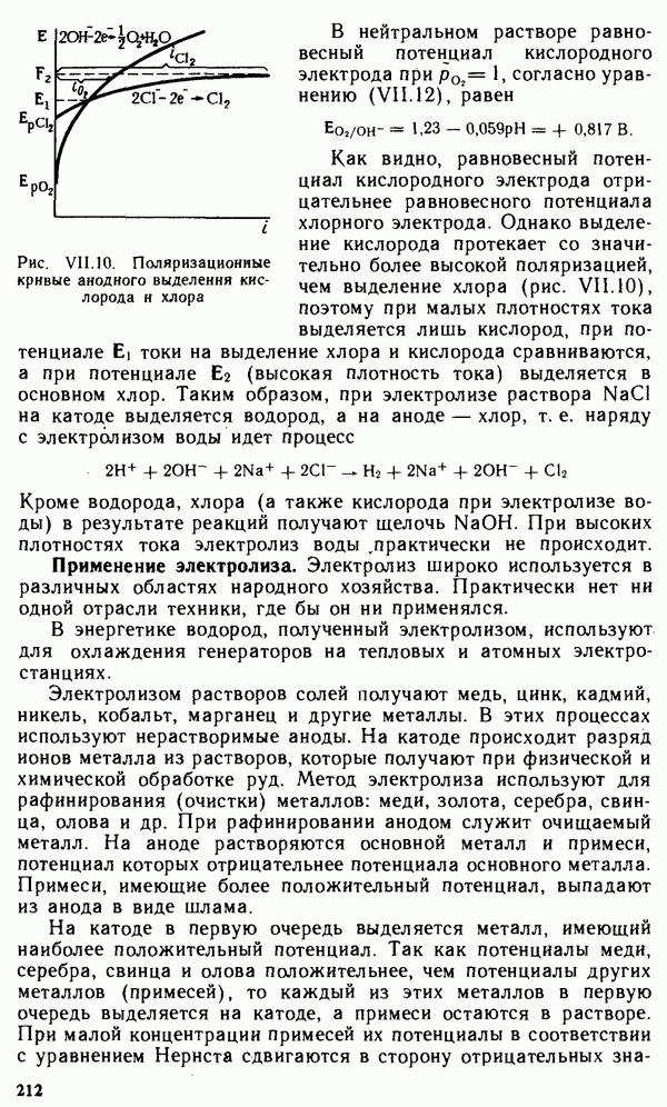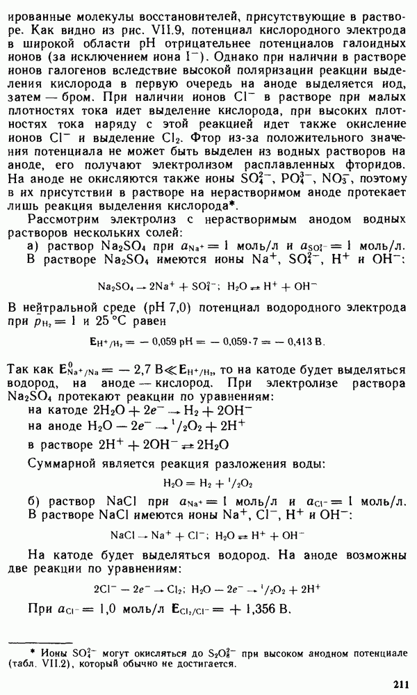В результате в катодном отделении выделяется водород и образуется щелочь. На нерастворимом аноде может разряжаться только гидроксид-ион (см. § VII.3):
