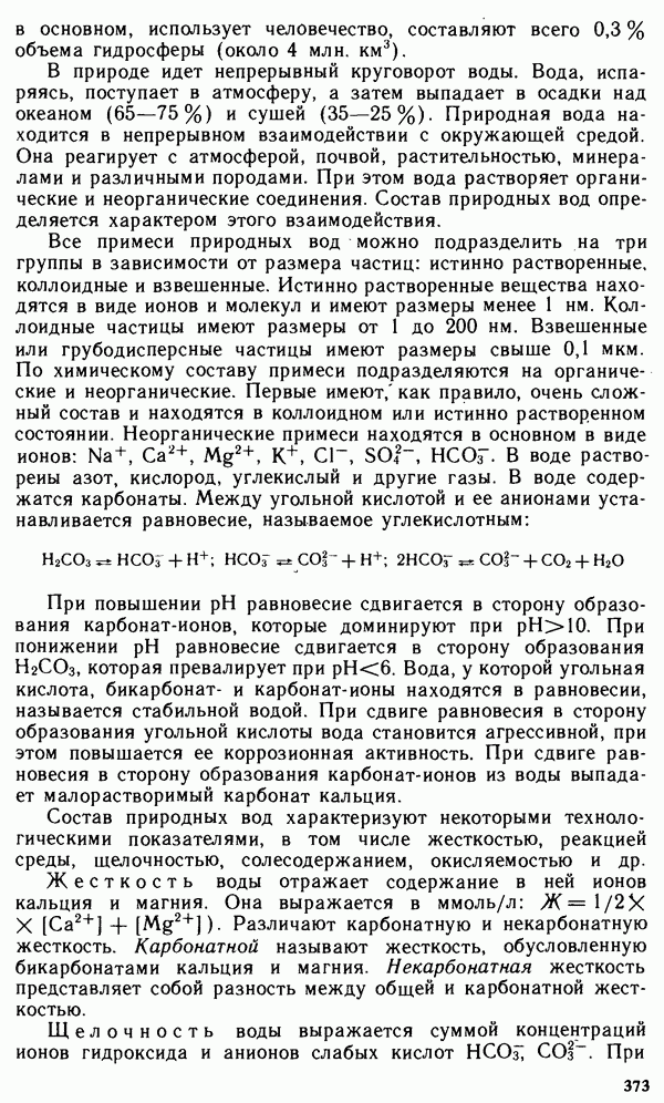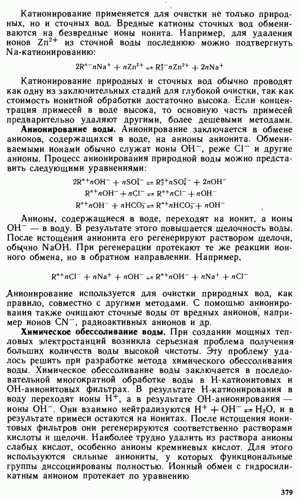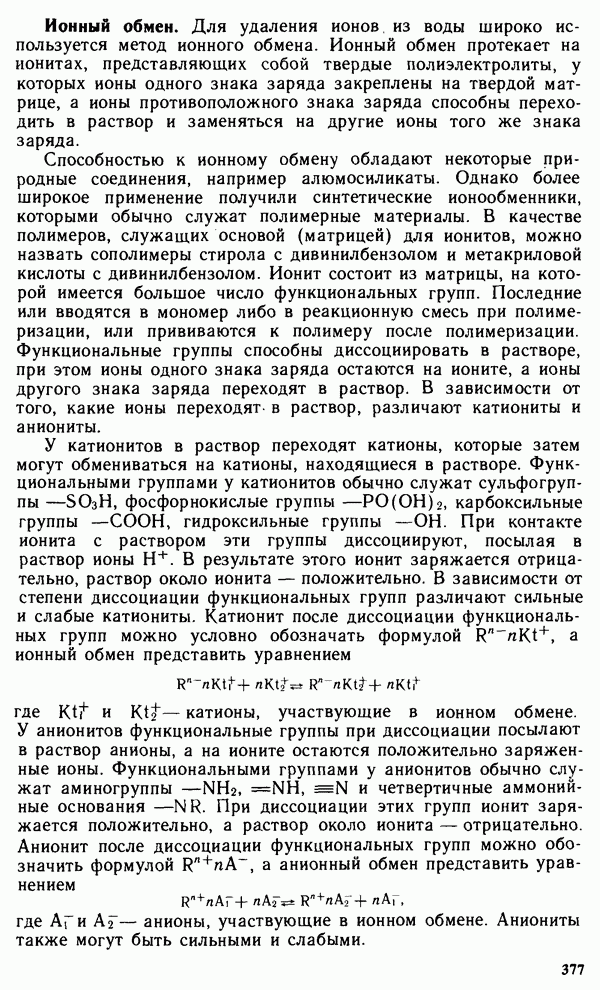 В результате этого увеличивается концентрация карбонат-ионов и достигается произведение растворимости карбоната кальция, который выпадает в осадок. Такой метод умягчения называется термическим. Жесткость, удаляемая методом нагревания, называется временной жесткостью. Термический метод применяется только тогда, когда нет необходимости в глубоком умягчении и кбгда вода должна подогреваться согласно технологии в других аппаратах. Для очистки природных и сточных вод от примесей широко применяются методы катионирования, анионирования и химического обессоливания. Ионный обмен.Для удаления ионов из воды широко используется метод ионного обмена. Ионный обмен протекает на ионитах, представляющих собой твердые полиэлектролиты, у которых ионы одного знака заряда закреплены на твердой матрице, а ионы противоположного знака заряда способны переходить в раствор и заменяться на другие ионы того же знака заряда. Способностью к ионному обмену обладают некоторые природные соединения, например алюмосиликаты. Однако более широкое применение получили синтетические ионообменники, которыми обычно служат полимерные материалы. В качестве полимеров, служащих основой (матрицей) для ионитов, можно назвать сополимеры стирола с дивинилбензолом и метакриловой кислоты с дивинилбензолом. Ионит состоит из матрицы, на которой имеется большое число функциональных групп. Последние или вводятся в мономер либо в реакционную смесь при полимеризации, или прививаются к полимеру после полимеризации. Функциональные группы способны диссоциировать в растворе, при этом ионы одного знака заряда остаются на ионите, а ионы другого знака заряда переходят в раствор. В зависимости от того, какие ионы переходят в раствор, различают катиониты и аниониты. У катионитов в раствор переходят катионы, которые затем могут обмениваться на катионы, находящиеся в растворе. Функциональными группами у катионитов обычно служат сульфогруппы
