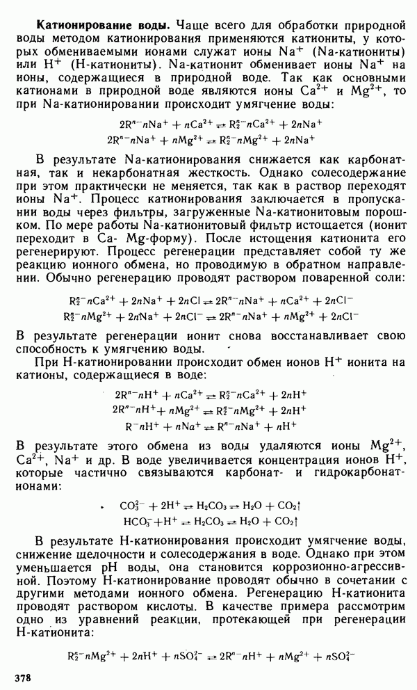 В результате Н-катионирования происходит умягчение воды, снижение щелочности и солесодержания в воде. Однако при этом уменьшается pH воды, она становится коррозионно-агрессивной. Поэтому Н-катионирование проводят обычно в сочетании с другими методами ионного обмена. Регенерацию Н-катионита проводят раствором кислоты. В качестве примера рассмотрим одно из уравнений реакции, протекающей при регенерации Н-катионита: