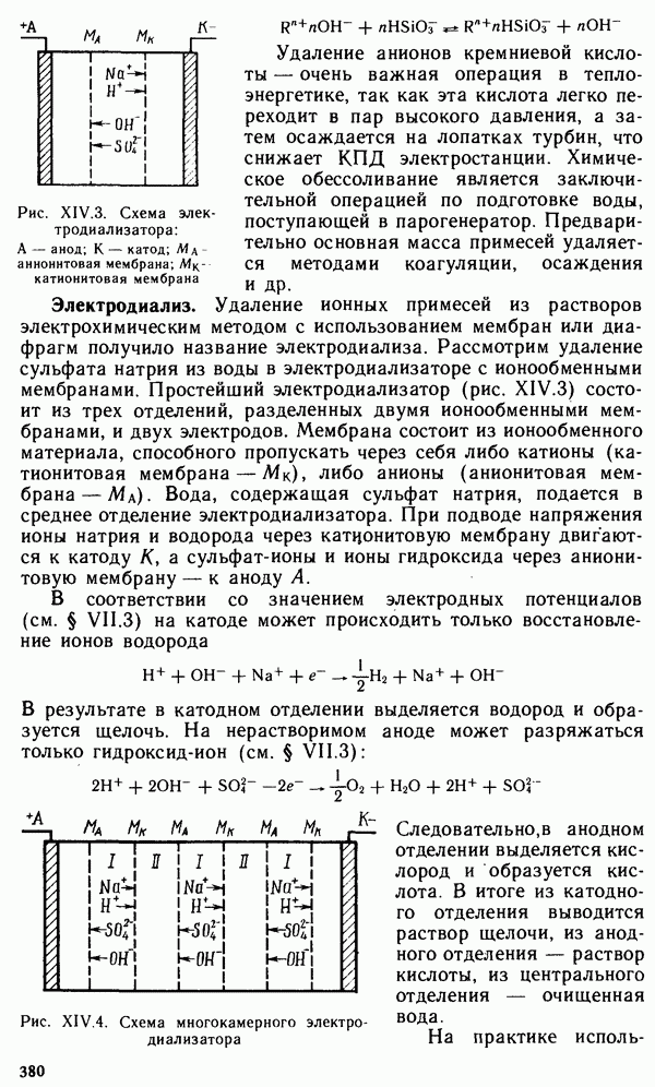 Удаление анионов кремниевой кислоты — очень важная операция в теплоэнергетике, так как эта кислота легко переходит в пар высокого давления, а затем осаждается на лопатках турбин, что снижает КПД электростанции. Химическое обессоливание является заключительной операцией по подготовке воды, поступающей в парогенератор. Предварительно основная масса примесей удаляется методами коагуляции, осаждения и др. Электродиализ.Удаление ионных примесей из растворов электрохимическим методом с использованием мембран или диафрагм получило название электродиализа. Рассмотрим удаление сульфата натрия из воды в электродиализаторе с ионообменными мембранами. Простейший электродиализатор (рис. XIV.3) состоит из трех отделений, разделенных двумя ионообменными мембранами, и двух электродов. Мембрана состоит из ионообменного материала, способного пропускать через себя либо катионы (катионитовая мембрана — В соответствии со значением электродных потенциалов (см. § VII.3) на катоде может происходить только восстановление ионов водорода