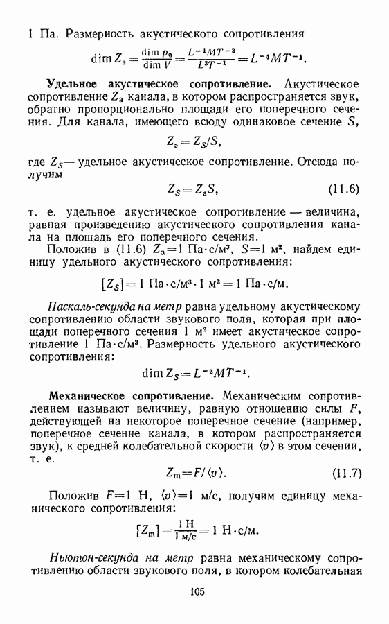 Удельное акустическое сопротивление. Единицу удельного акустического сопротивления найдем по формуле (11.6), положив в ней