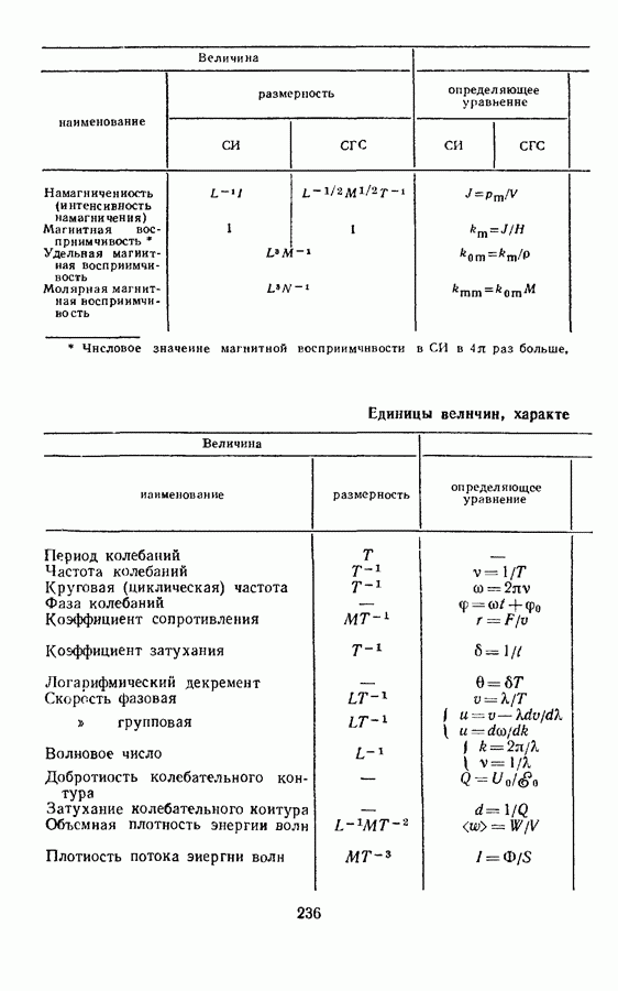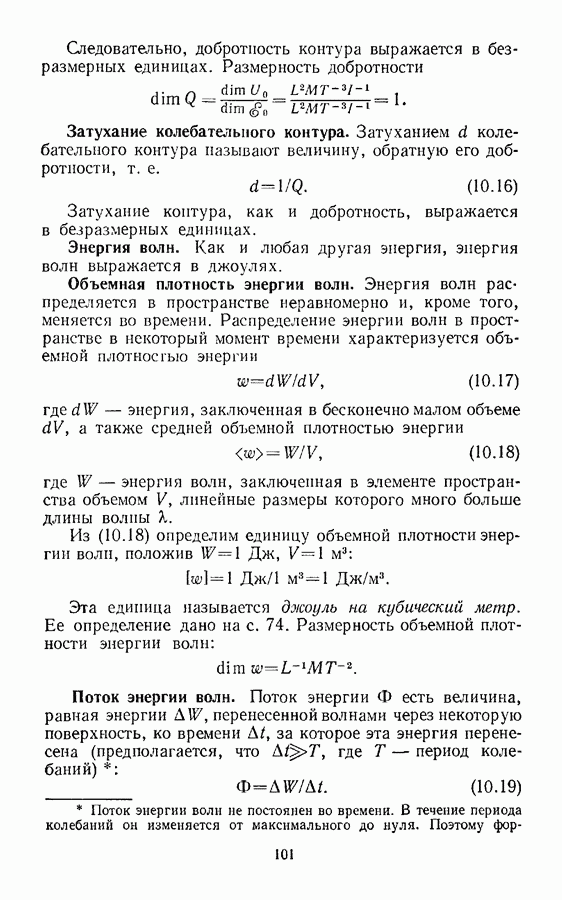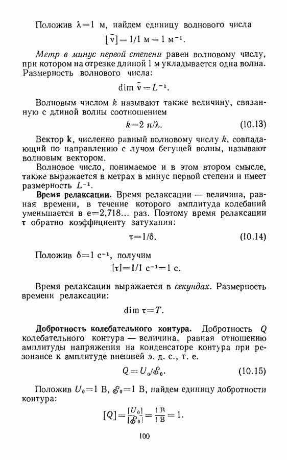 Логарифмический декремент, добротность колебательного контура, затухание контура — величины безразмерные и поэтому выражаются в безразмерных единицах (см. также § 10). Период колебаний, частота колебаний, круговая частота, фаза, коэффициент затухания, время релаксации в системе СГС выражаются в тех же единицах, что и в СИ (см. § 10). Единицы остальных величин, характеризующих колебания и волны, рекомендуется получить самому читателю при помощи соответствующих определяющих уравнений, приведенных в § 10, 11.
