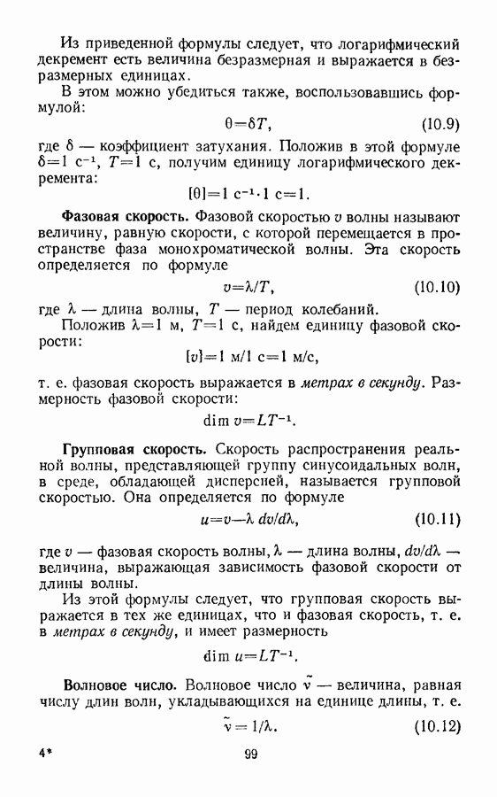 Скорость волны (фазовая и групповая). Как и скорость тел, скорость волны (фазовая и групповая) выражается в сантиметрах в секунду. Это следует и из формул (10.10) и (10.11). Волновое число. Единицу волнового числа найдем по формуле (10.12). Положив в ней