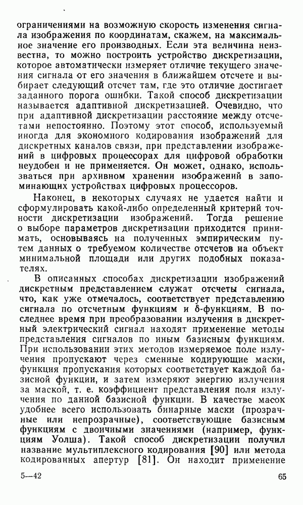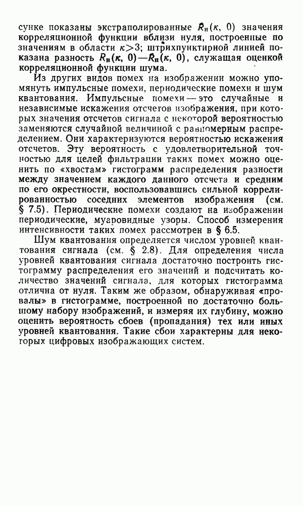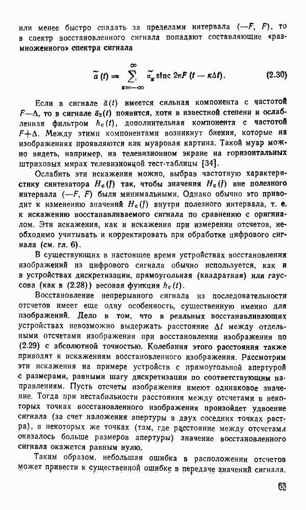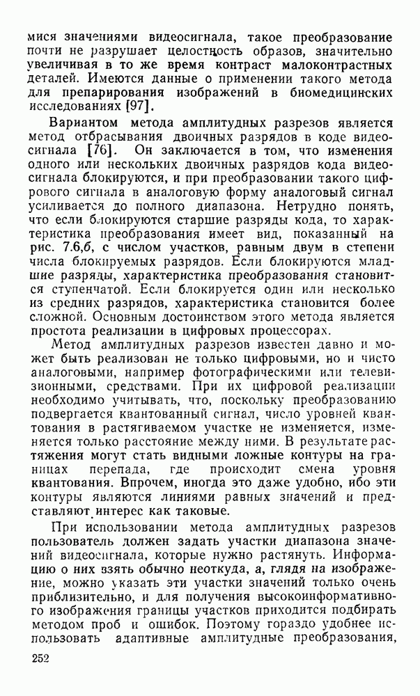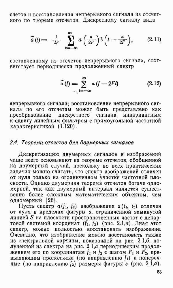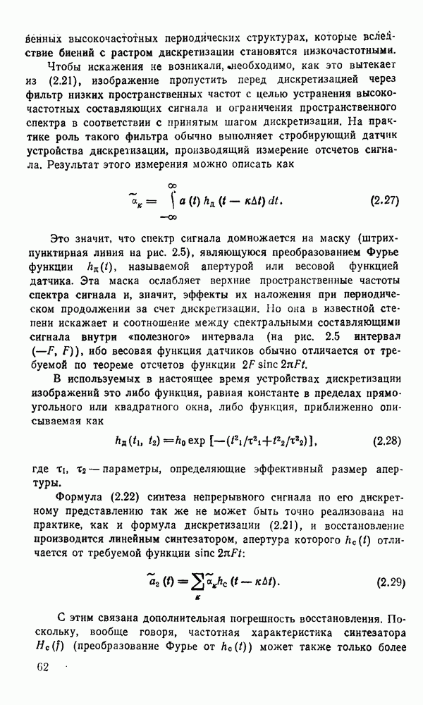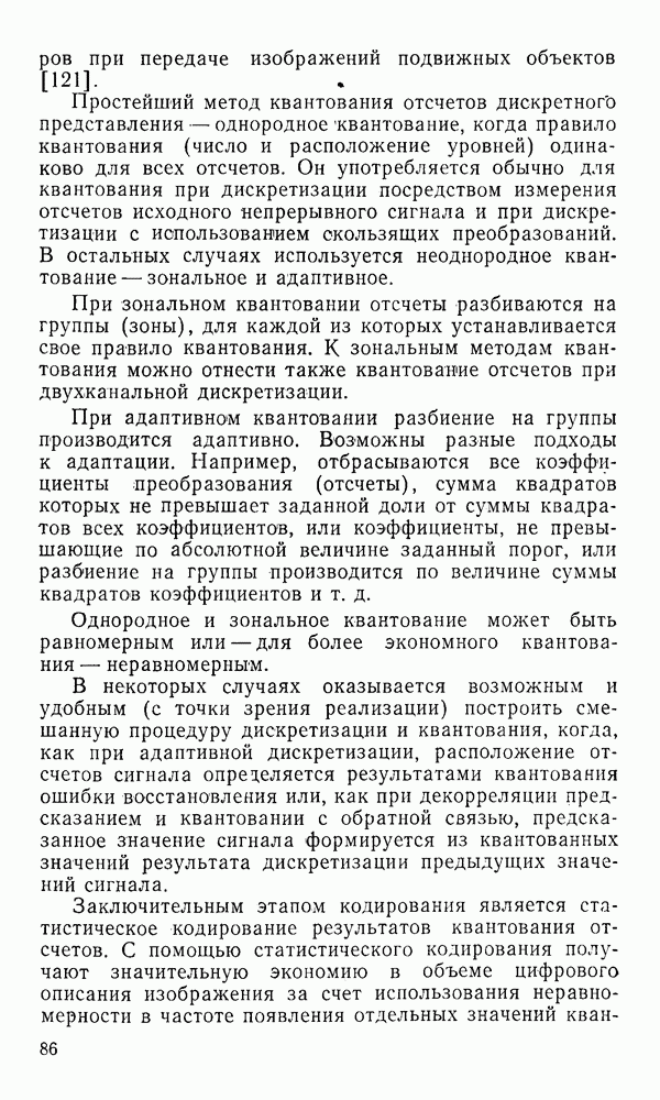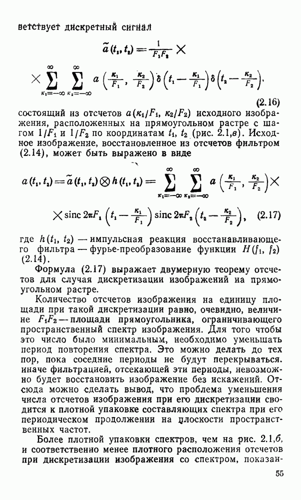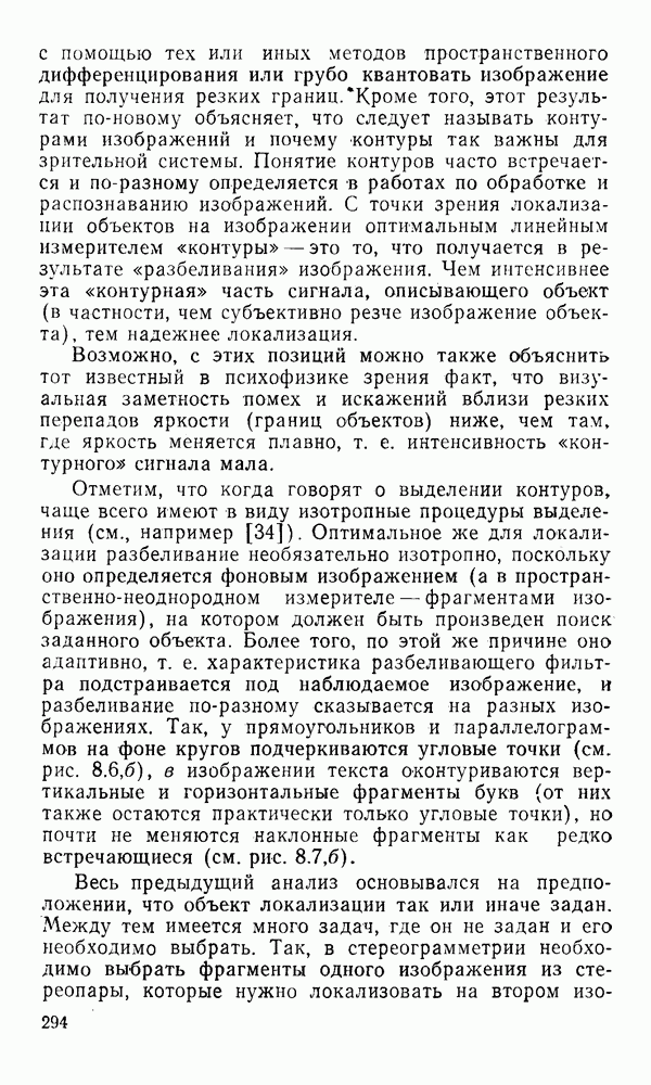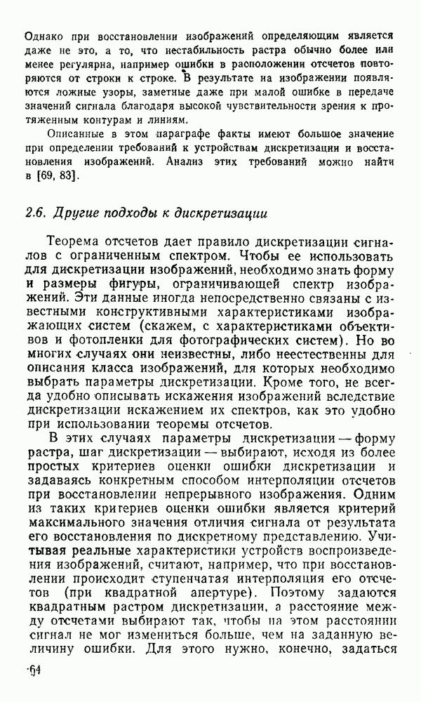 2.6. Другие подходы к дискретизацииТеорема отсчетов дает правило дискретизации сигналов с ограниченным спектром. Чтобы ее использовать для дискретизации изображений, необходимо знать форму и размеры фигуры, ограничивающей спектр изображений. Эти данные иногда непосредственно связаны с известными конструктивными характеристиками изображающих систем (скажем, с характеристиками объективов и фотопленки для фотографических систем). Но во многих случаях они неизвестны, либо неестественны для описания класса изображений, для которых необходимо выбрать параметры дискретизации. Кроме того, не всегда удобно описывать искажения изображений вследствие дискретизации искажением их спектров, как это удобно при использовании теоремы отсчетов. В этих случаях параметры дискретизации — форму растра, шаг дискретизации — выбирают, исходя из более простых критериев оценки ошибки дискретизации и задаваясь конкретным способом интерполяции отсчетов при восстановлении непрерывного изображения. Одним из таких критериев оценки ошибки является критерий максимального значения отличия сигнала от результата его восстановления по дискретному представлению. Учитывая реальные характеристики устройств воспроизведения изображений, считают, например, что при восстановлении происходит ступенчатая интерполяция его отсчетов (при квадратной апертуре). Поэтому задаются квадратным растром дискретизации, а расстояние между отсчетами выбирают так, чтобы на этом расстоянии сигнал не мог измениться больше, чем на заданную величину ошибки. Для этого нужно, конечно, задаться ограничениями на возможную скорость изменения сигнала изображения по координатам, скажем, на максимальное значение его производных. Если эта величина неизвестна, то можно построить устройство дискретизации, которое автоматически измеряет отличие текущего значения сигнала от его значения в ближайшем отсчете и выбирает следующий отсчет там, где это отличие достигает заданного порога ошибки. Такой способ дискретизации называется адаптивной дискретизацией. Очевидно, что при адаптивной дискретизации расстояние между отсчетами непостоянно. Поэтому этот способ, используемый иногда для экономного кодирования изображений для дискретных каналов связи, при представлении изображений в цифровых процессорах для цифровой обработки неудобен и не применяется. Он может, однако, использоваться при архивном хранении изображений в запоминающих устройствах цифровых процессоров. Наконец, в некоторых случаях не удается найти и сформулировать какой-либо определенный критерий точности дискретизации изображений. Тогда решение о выборе параметров дискретизации приходится принимать, основываясь на полученных эмпирическим путем данных о требуемом количестве отсчетов на объект минимальной площади или других подобных показателях. В описанных способах дискретизации изображений дискретным представлением служат отсчеты сигнала, что, как уже отмечалось, соответствует представлению сигнала по отсчетным функциям и в устройствах измерения и дискретизации слабых излучений (радиоактивного, рентгеновского, инфракрасного и т. п.) для увеличения чувствительности датчиков. Краткий обзор этих методов можно найти в [125, 126].