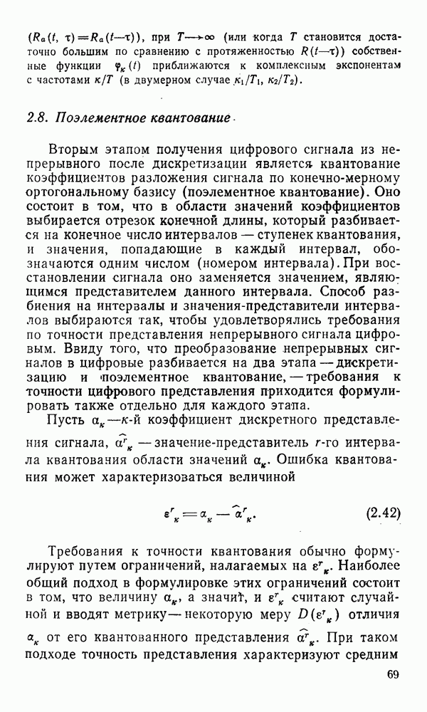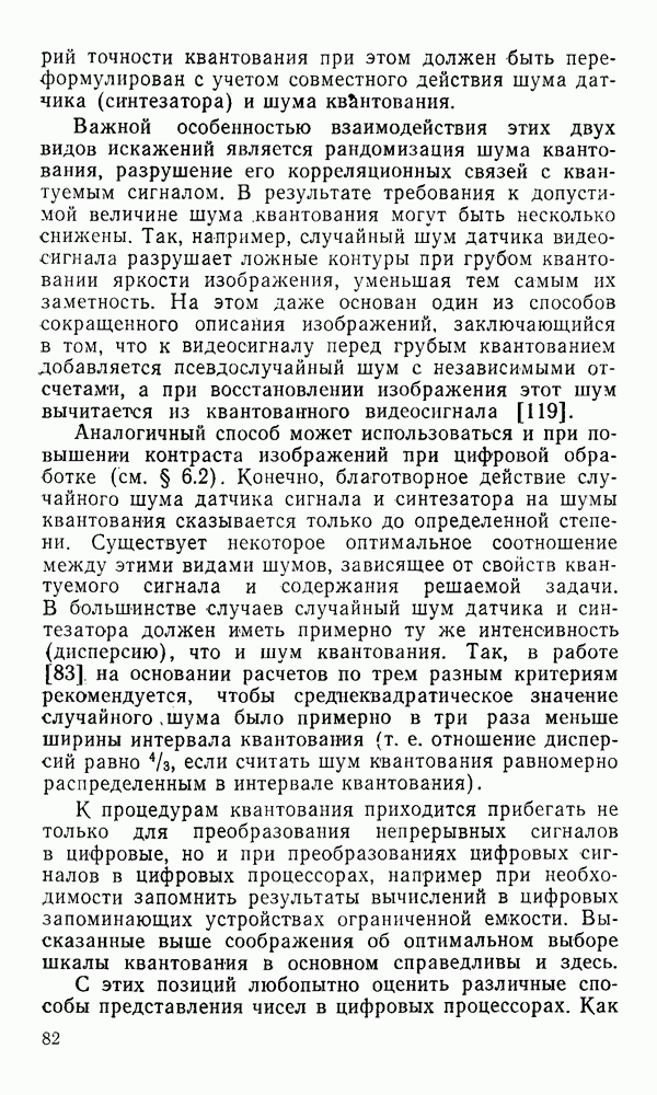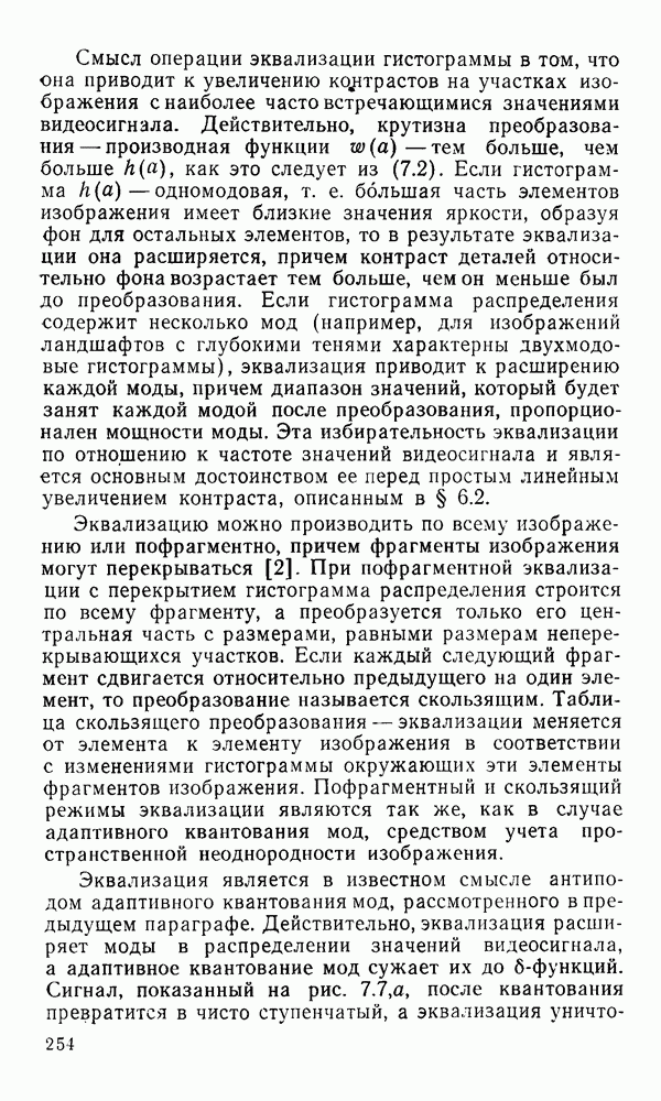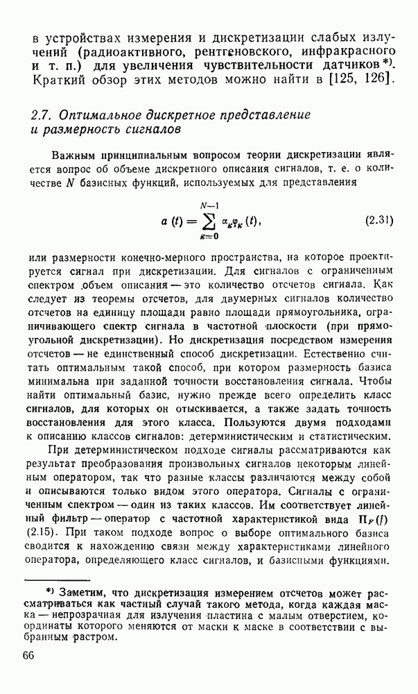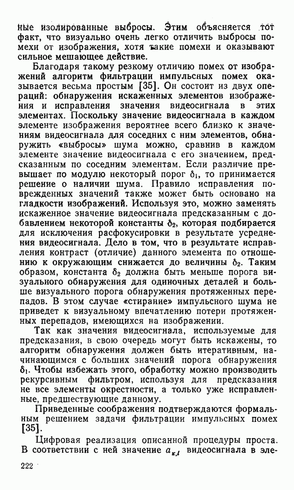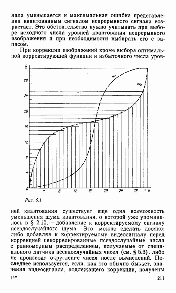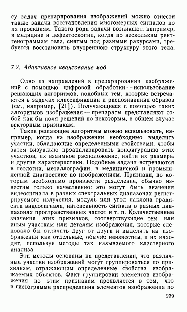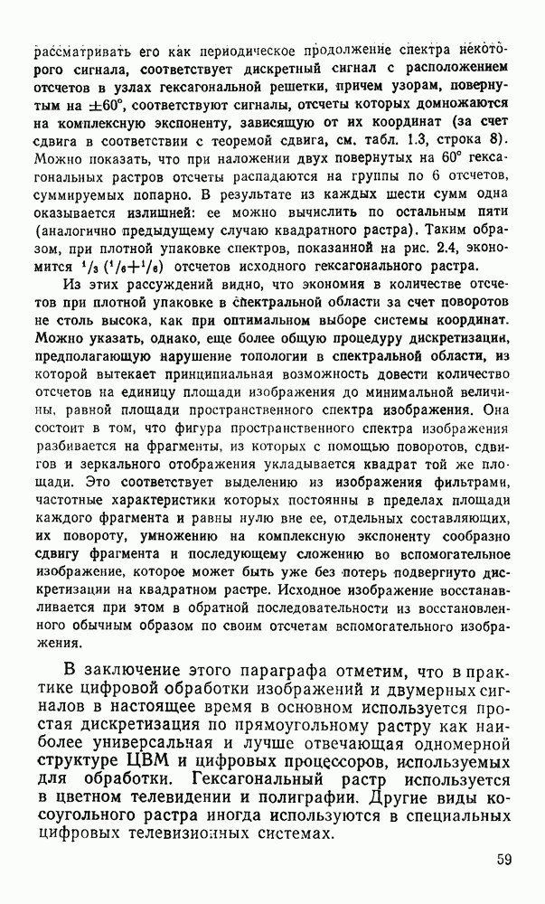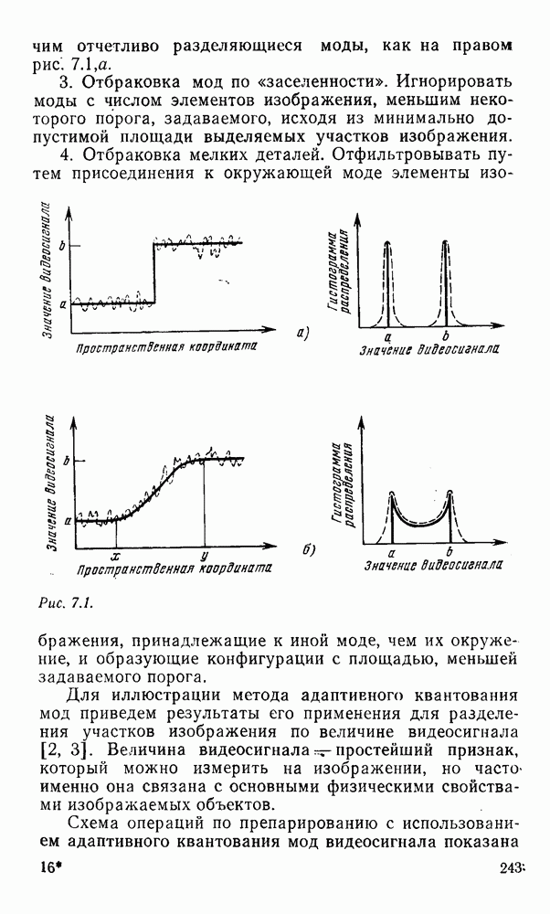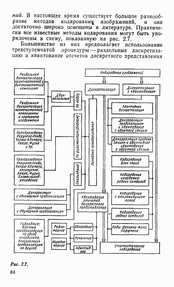 2.6. Другие подходы к дискретизацииТеорема отсчетов дает правило дискретизации сигналов с ограниченным спектром. Чтобы ее использовать для дискретизации изображений, необходимо знать форму и размеры фигуры, ограничивающей спектр изображений. Эти данные иногда непосредственно связаны с известными конструктивными характеристиками изображающих систем (скажем, с характеристиками объективов и фотопленки для фотографических систем). Но во многих случаях они неизвестны, либо неестественны для описания класса изображений, для которых необходимо выбрать параметры дискретизации. Кроме того, не всегда удобно описывать искажения изображений вследствие дискретизации искажением их спектров, как это удобно при использовании теоремы отсчетов. В этих случаях параметры дискретизации — форму растра, шаг дискретизации — выбирают, исходя из более простых критериев оценки ошибки дискретизации и задаваясь конкретным способом интерполяции отсчетов при восстановлении непрерывного изображения. Одним из таких критериев оценки ошибки является критерий максимального значения отличия сигнала от результата его восстановления по дискретному представлению. Учитывая реальные характеристики устройств воспроизведения изображений, считают, например, что при восстановлении происходит ступенчатая интерполяция его отсчетов (при квадратной апертуре). Поэтому задаются квадратным растром дискретизации, а расстояние между отсчетами выбирают так, чтобы на этом расстоянии сигнал не мог измениться больше, чем на заданную величину ошибки. Для этого нужно, конечно, задаться ограничениями на возможную скорость изменения сигнала изображения по координатам, скажем, на максимальное значение его производных. Если эта величина неизвестна, то можно построить устройство дискретизации, которое автоматически измеряет отличие текущего значения сигнала от его значения в ближайшем отсчете и выбирает следующий отсчет там, где это отличие достигает заданного порога ошибки. Такой способ дискретизации называется адаптивной дискретизацией. Очевидно, что при адаптивной дискретизации расстояние между отсчетами непостоянно. Поэтому этот способ, используемый иногда для экономного кодирования изображений для дискретных каналов связи, при представлении изображений в цифровых процессорах для цифровой обработки неудобен и не применяется. Он может, однако, использоваться при архивном хранении изображений в запоминающих устройствах цифровых процессоров. Наконец, в некоторых случаях не удается найти и сформулировать какой-либо определенный критерий точности дискретизации изображений. Тогда решение о выборе параметров дискретизации приходится принимать, основываясь на полученных эмпирическим путем данных о требуемом количестве отсчетов на объект минимальной площади или других подобных показателях. В описанных способах дискретизации изображений дискретным представлением служат отсчеты сигнала, что, как уже отмечалось, соответствует представлению сигнала по отсчетным функциям и в устройствах измерения и дискретизации слабых излучений (радиоактивного, рентгеновского, инфракрасного и т. п.) для увеличения чувствительности датчиков. Краткий обзор этих методов можно найти в [125, 126].