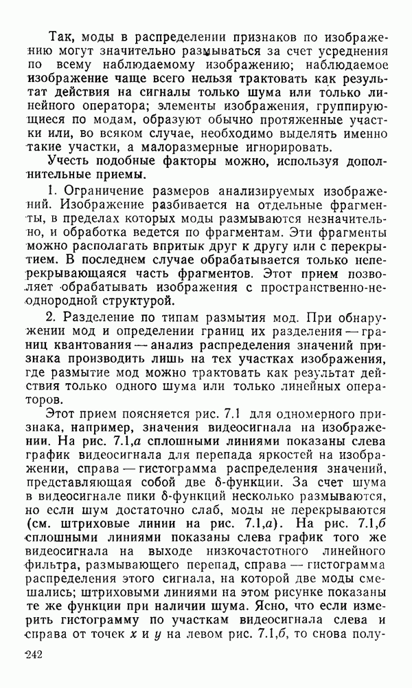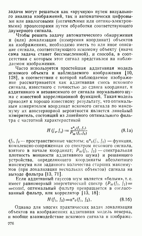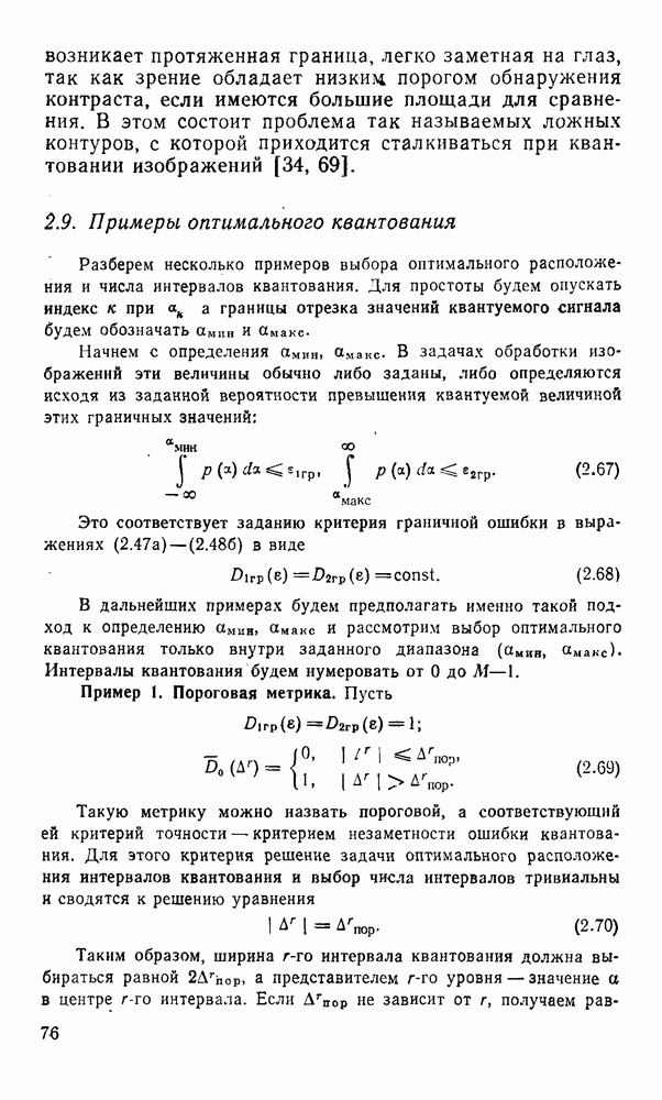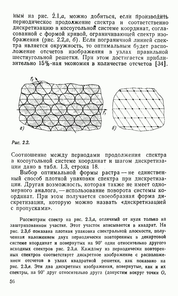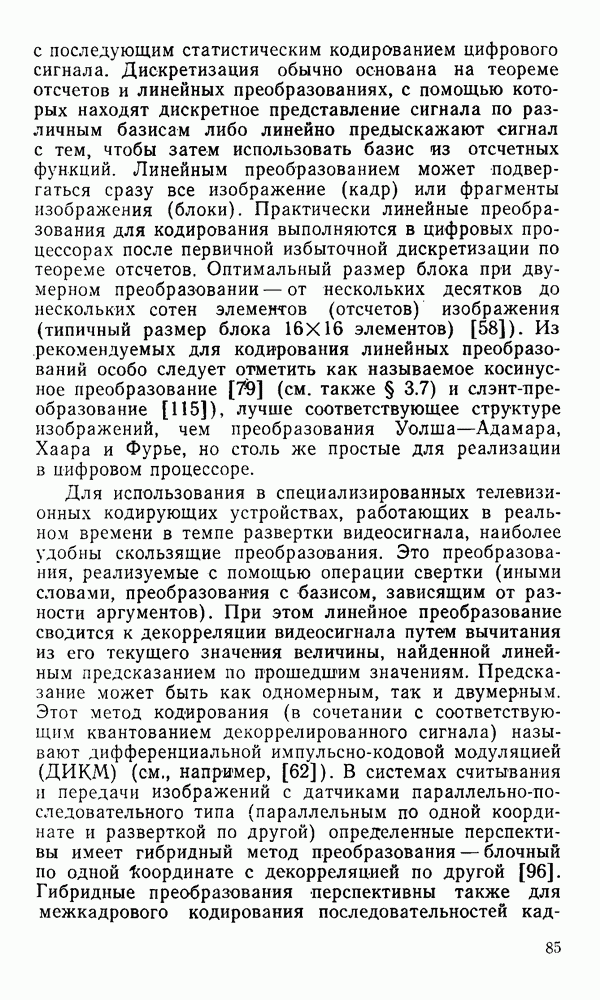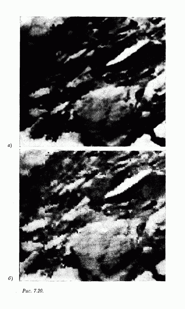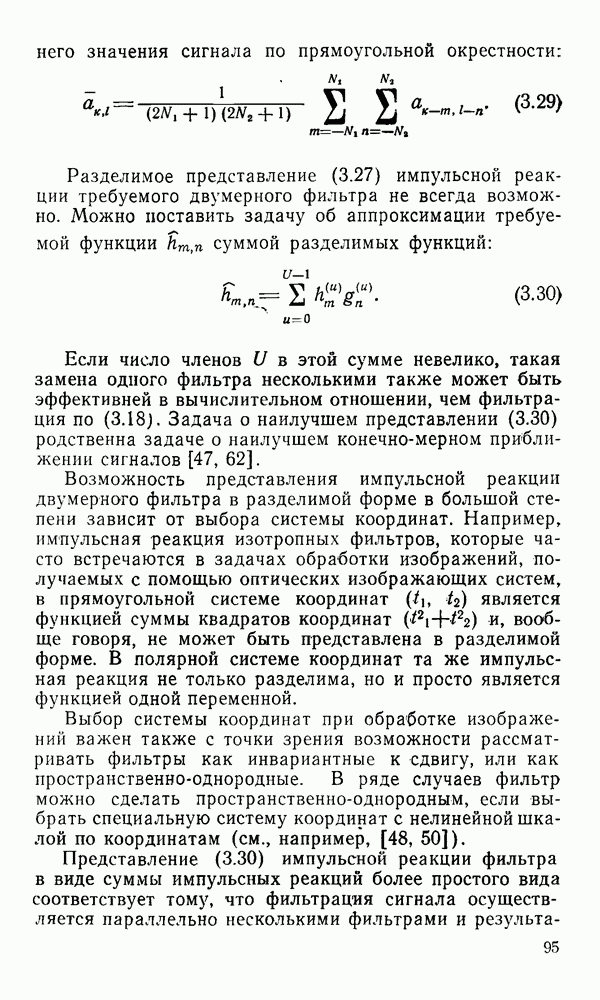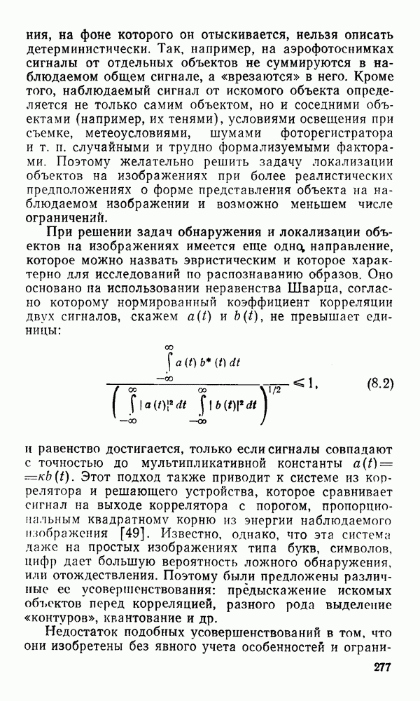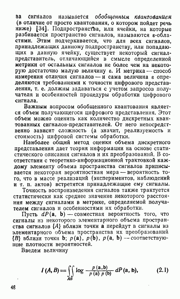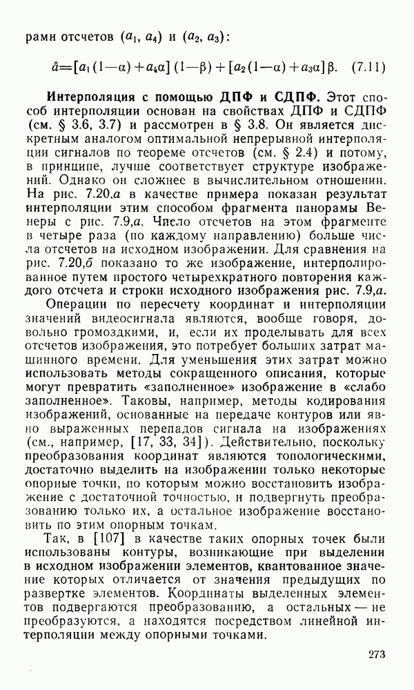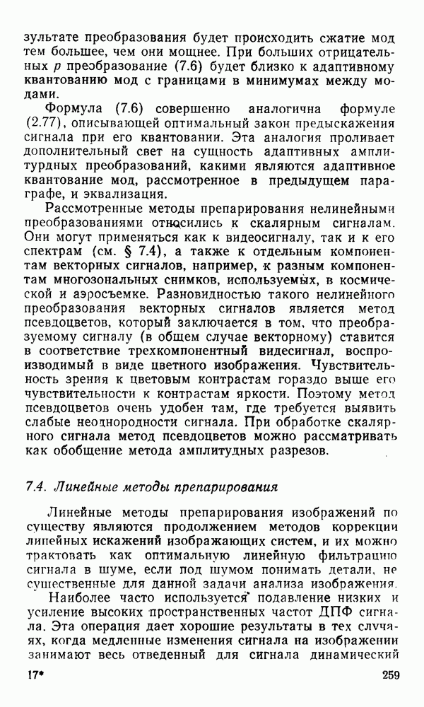 2.6. Другие подходы к дискретизацииТеорема отсчетов дает правило дискретизации сигналов с ограниченным спектром. Чтобы ее использовать для дискретизации изображений, необходимо знать форму и размеры фигуры, ограничивающей спектр изображений. Эти данные иногда непосредственно связаны с известными конструктивными характеристиками изображающих систем (скажем, с характеристиками объективов и фотопленки для фотографических систем). Но во многих случаях они неизвестны, либо неестественны для описания класса изображений, для которых необходимо выбрать параметры дискретизации. Кроме того, не всегда удобно описывать искажения изображений вследствие дискретизации искажением их спектров, как это удобно при использовании теоремы отсчетов. В этих случаях параметры дискретизации — форму растра, шаг дискретизации — выбирают, исходя из более простых критериев оценки ошибки дискретизации и задаваясь конкретным способом интерполяции отсчетов при восстановлении непрерывного изображения. Одним из таких критериев оценки ошибки является критерий максимального значения отличия сигнала от результата его восстановления по дискретному представлению. Учитывая реальные характеристики устройств воспроизведения изображений, считают, например, что при восстановлении происходит ступенчатая интерполяция его отсчетов (при квадратной апертуре). Поэтому задаются квадратным растром дискретизации, а расстояние между отсчетами выбирают так, чтобы на этом расстоянии сигнал не мог измениться больше, чем на заданную величину ошибки. Для этого нужно, конечно, задаться ограничениями на возможную скорость изменения сигнала изображения по координатам, скажем, на максимальное значение его производных. Если эта величина неизвестна, то можно построить устройство дискретизации, которое автоматически измеряет отличие текущего значения сигнала от его значения в ближайшем отсчете и выбирает следующий отсчет там, где это отличие достигает заданного порога ошибки. Такой способ дискретизации называется адаптивной дискретизацией. Очевидно, что при адаптивной дискретизации расстояние между отсчетами непостоянно. Поэтому этот способ, используемый иногда для экономного кодирования изображений для дискретных каналов связи, при представлении изображений в цифровых процессорах для цифровой обработки неудобен и не применяется. Он может, однако, использоваться при архивном хранении изображений в запоминающих устройствах цифровых процессоров. Наконец, в некоторых случаях не удается найти и сформулировать какой-либо определенный критерий точности дискретизации изображений. Тогда решение о выборе параметров дискретизации приходится принимать, основываясь на полученных эмпирическим путем данных о требуемом количестве отсчетов на объект минимальной площади или других подобных показателях. В описанных способах дискретизации изображений дискретным представлением служат отсчеты сигнала, что, как уже отмечалось, соответствует представлению сигнала по отсчетным функциям и в устройствах измерения и дискретизации слабых излучений (радиоактивного, рентгеновского, инфракрасного и т. п.) для увеличения чувствительности датчиков. Краткий обзор этих методов можно найти в [125, 126].