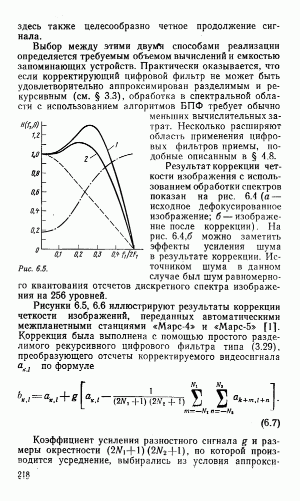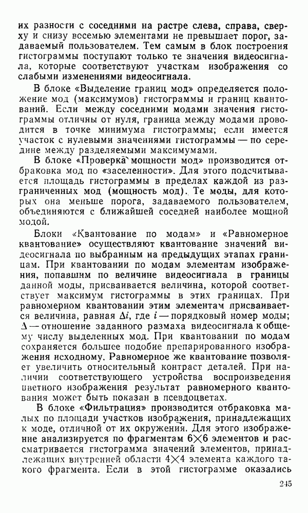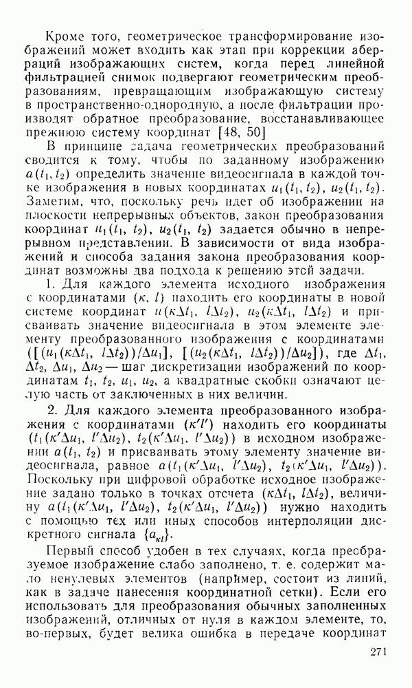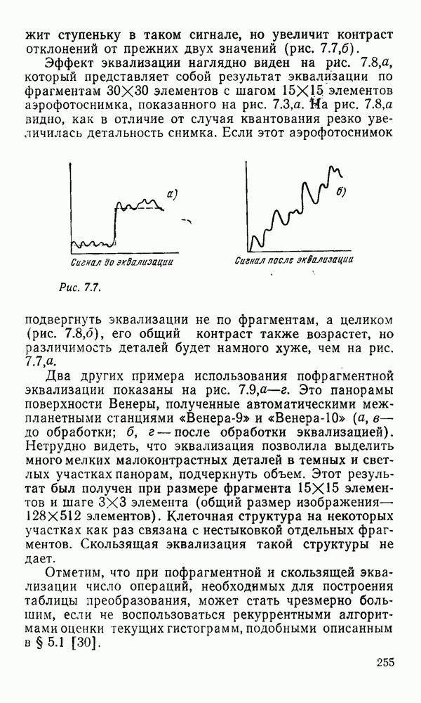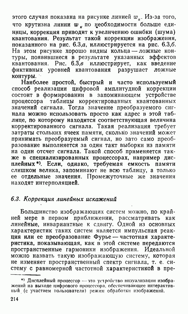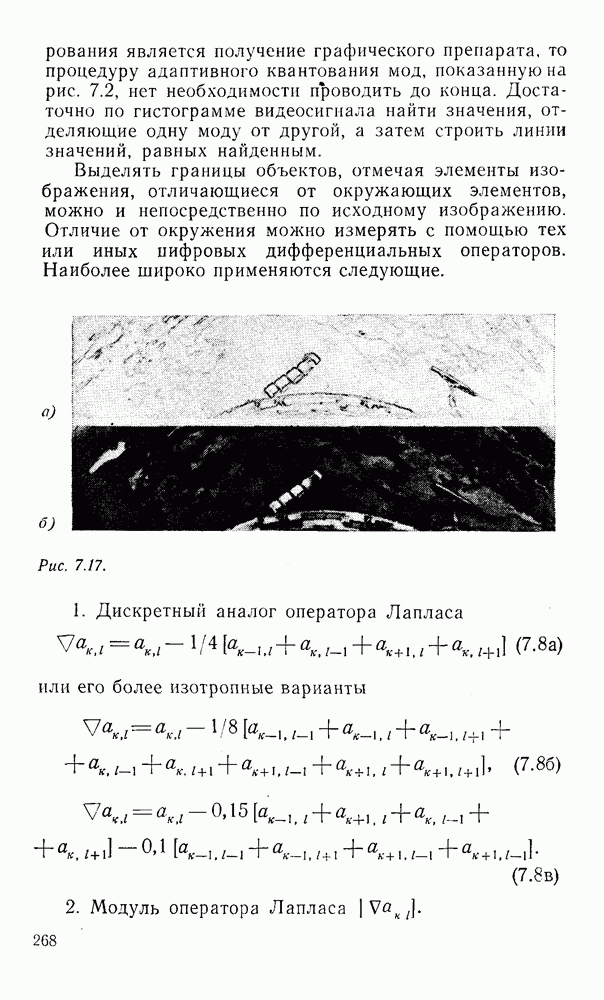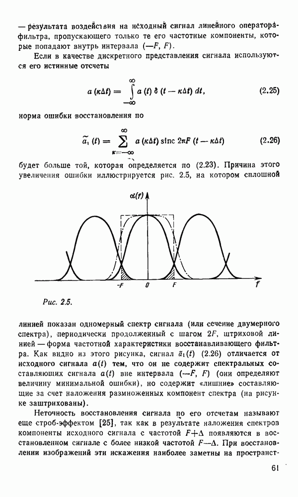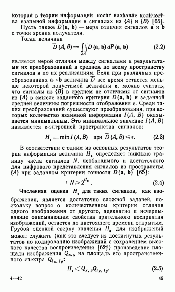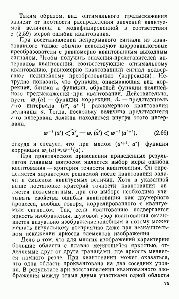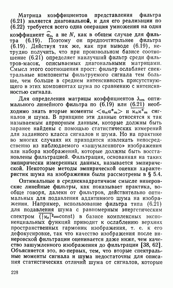 2.6. Другие подходы к дискретизацииТеорема отсчетов дает правило дискретизации сигналов с ограниченным спектром. Чтобы ее использовать для дискретизации изображений, необходимо знать форму и размеры фигуры, ограничивающей спектр изображений. Эти данные иногда непосредственно связаны с известными конструктивными характеристиками изображающих систем (скажем, с характеристиками объективов и фотопленки для фотографических систем). Но во многих случаях они неизвестны, либо неестественны для описания класса изображений, для которых необходимо выбрать параметры дискретизации. Кроме того, не всегда удобно описывать искажения изображений вследствие дискретизации искажением их спектров, как это удобно при использовании теоремы отсчетов. В этих случаях параметры дискретизации — форму растра, шаг дискретизации — выбирают, исходя из более простых критериев оценки ошибки дискретизации и задаваясь конкретным способом интерполяции отсчетов при восстановлении непрерывного изображения. Одним из таких критериев оценки ошибки является критерий максимального значения отличия сигнала от результата его восстановления по дискретному представлению. Учитывая реальные характеристики устройств воспроизведения изображений, считают, например, что при восстановлении происходит ступенчатая интерполяция его отсчетов (при квадратной апертуре). Поэтому задаются квадратным растром дискретизации, а расстояние между отсчетами выбирают так, чтобы на этом расстоянии сигнал не мог измениться больше, чем на заданную величину ошибки. Для этого нужно, конечно, задаться ограничениями на возможную скорость изменения сигнала изображения по координатам, скажем, на максимальное значение его производных. Если эта величина неизвестна, то можно построить устройство дискретизации, которое автоматически измеряет отличие текущего значения сигнала от его значения в ближайшем отсчете и выбирает следующий отсчет там, где это отличие достигает заданного порога ошибки. Такой способ дискретизации называется адаптивной дискретизацией. Очевидно, что при адаптивной дискретизации расстояние между отсчетами непостоянно. Поэтому этот способ, используемый иногда для экономного кодирования изображений для дискретных каналов связи, при представлении изображений в цифровых процессорах для цифровой обработки неудобен и не применяется. Он может, однако, использоваться при архивном хранении изображений в запоминающих устройствах цифровых процессоров. Наконец, в некоторых случаях не удается найти и сформулировать какой-либо определенный критерий точности дискретизации изображений. Тогда решение о выборе параметров дискретизации приходится принимать, основываясь на полученных эмпирическим путем данных о требуемом количестве отсчетов на объект минимальной площади или других подобных показателях. В описанных способах дискретизации изображений дискретным представлением служат отсчеты сигнала, что, как уже отмечалось, соответствует представлению сигнала по отсчетным функциям и в устройствах измерения и дискретизации слабых излучений (радиоактивного, рентгеновского, инфракрасного и т. п.) для увеличения чувствительности датчиков. Краткий обзор этих методов можно найти в [125, 126].