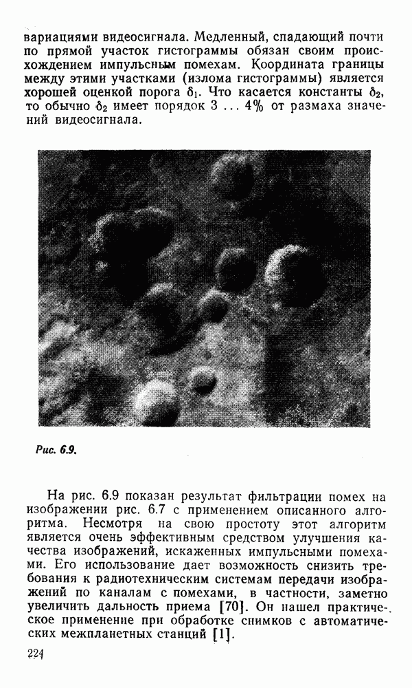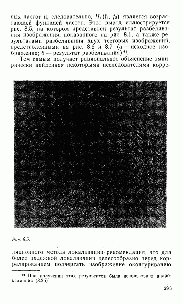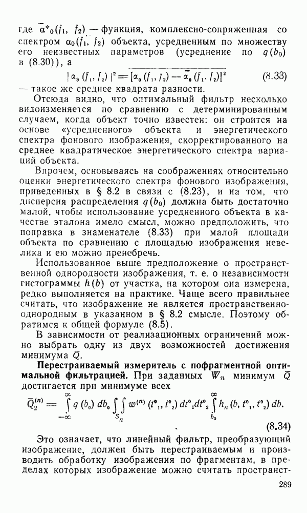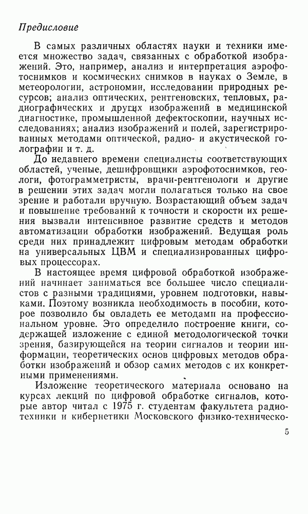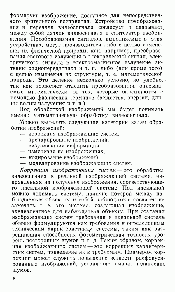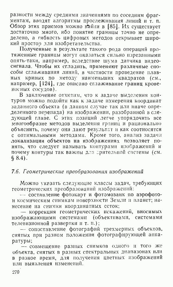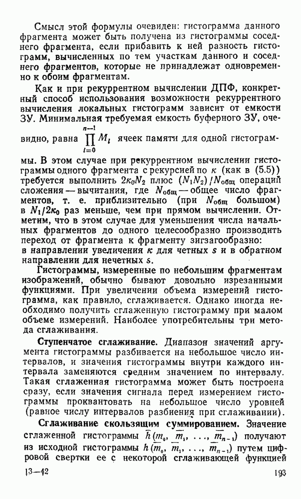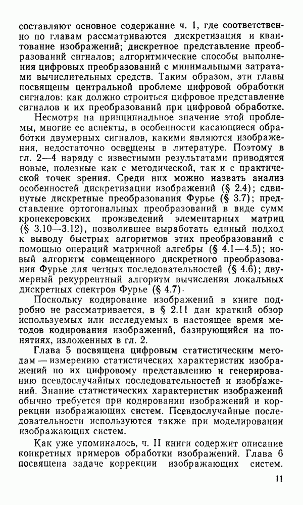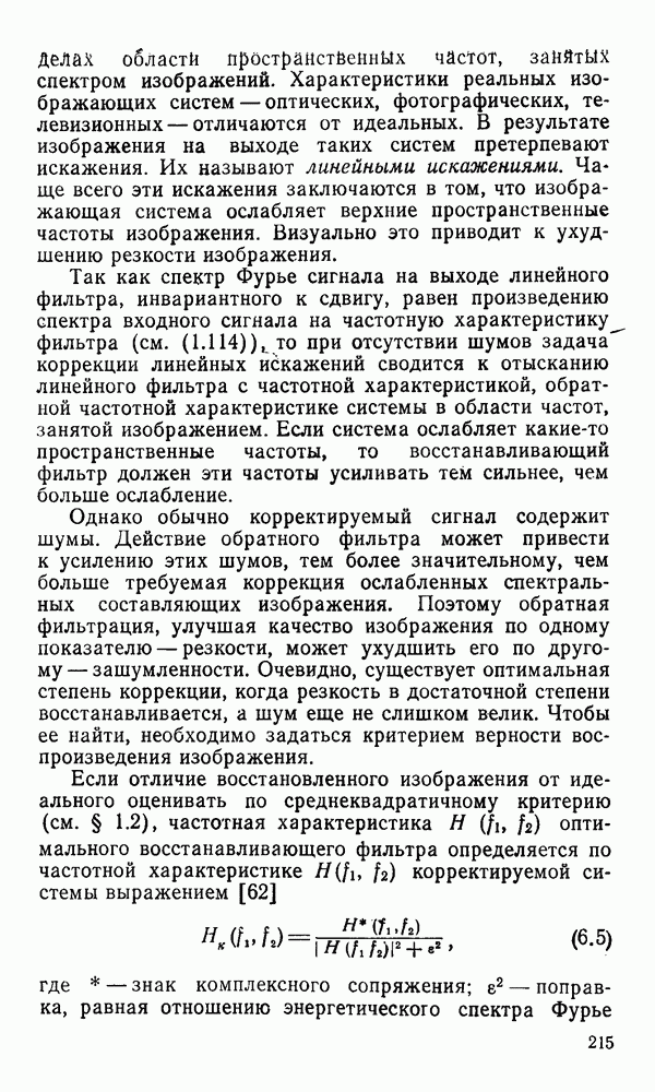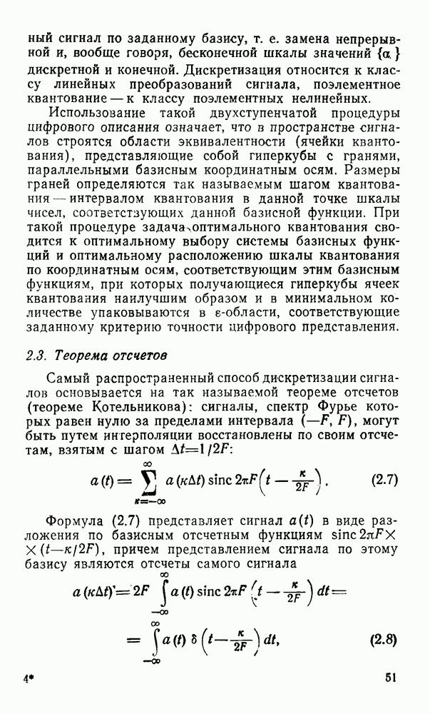 2.6. Другие подходы к дискретизацииТеорема отсчетов дает правило дискретизации сигналов с ограниченным спектром. Чтобы ее использовать для дискретизации изображений, необходимо знать форму и размеры фигуры, ограничивающей спектр изображений. Эти данные иногда непосредственно связаны с известными конструктивными характеристиками изображающих систем (скажем, с характеристиками объективов и фотопленки для фотографических систем). Но во многих случаях они неизвестны, либо неестественны для описания класса изображений, для которых необходимо выбрать параметры дискретизации. Кроме того, не всегда удобно описывать искажения изображений вследствие дискретизации искажением их спектров, как это удобно при использовании теоремы отсчетов. В этих случаях параметры дискретизации — форму растра, шаг дискретизации — выбирают, исходя из более простых критериев оценки ошибки дискретизации и задаваясь конкретным способом интерполяции отсчетов при восстановлении непрерывного изображения. Одним из таких критериев оценки ошибки является критерий максимального значения отличия сигнала от результата его восстановления по дискретному представлению. Учитывая реальные характеристики устройств воспроизведения изображений, считают, например, что при восстановлении происходит ступенчатая интерполяция его отсчетов (при квадратной апертуре). Поэтому задаются квадратным растром дискретизации, а расстояние между отсчетами выбирают так, чтобы на этом расстоянии сигнал не мог измениться больше, чем на заданную величину ошибки. Для этого нужно, конечно, задаться ограничениями на возможную скорость изменения сигнала изображения по координатам, скажем, на максимальное значение его производных. Если эта величина неизвестна, то можно построить устройство дискретизации, которое автоматически измеряет отличие текущего значения сигнала от его значения в ближайшем отсчете и выбирает следующий отсчет там, где это отличие достигает заданного порога ошибки. Такой способ дискретизации называется адаптивной дискретизацией. Очевидно, что при адаптивной дискретизации расстояние между отсчетами непостоянно. Поэтому этот способ, используемый иногда для экономного кодирования изображений для дискретных каналов связи, при представлении изображений в цифровых процессорах для цифровой обработки неудобен и не применяется. Он может, однако, использоваться при архивном хранении изображений в запоминающих устройствах цифровых процессоров. Наконец, в некоторых случаях не удается найти и сформулировать какой-либо определенный критерий точности дискретизации изображений. Тогда решение о выборе параметров дискретизации приходится принимать, основываясь на полученных эмпирическим путем данных о требуемом количестве отсчетов на объект минимальной площади или других подобных показателях. В описанных способах дискретизации изображений дискретным представлением служат отсчеты сигнала, что, как уже отмечалось, соответствует представлению сигнала по отсчетным функциям и в устройствах измерения и дискретизации слабых излучений (радиоактивного, рентгеновского, инфракрасного и т. п.) для увеличения чувствительности датчиков. Краткий обзор этих методов можно найти в [125, 126].