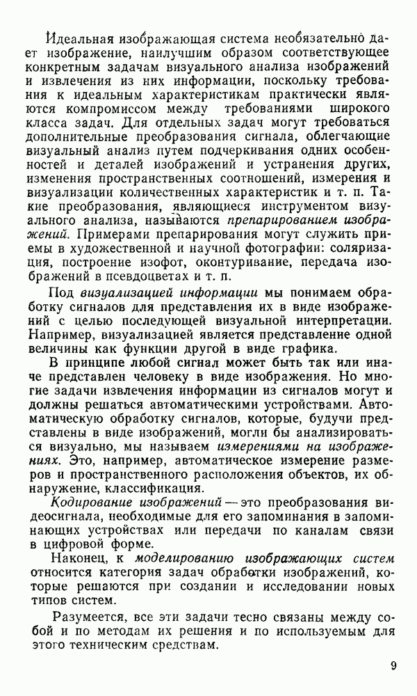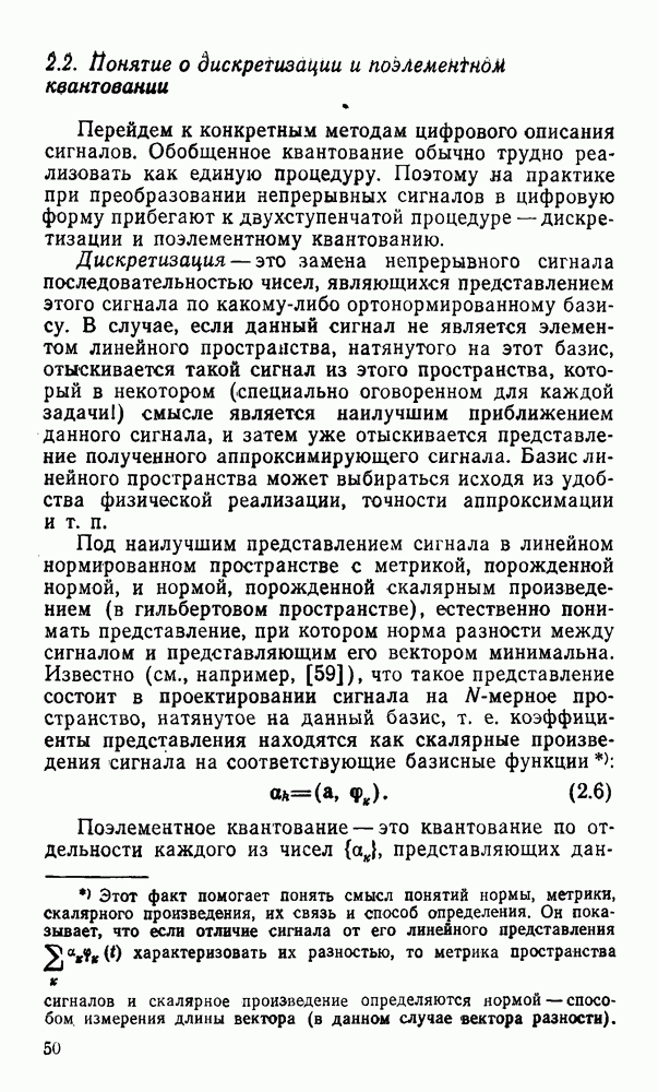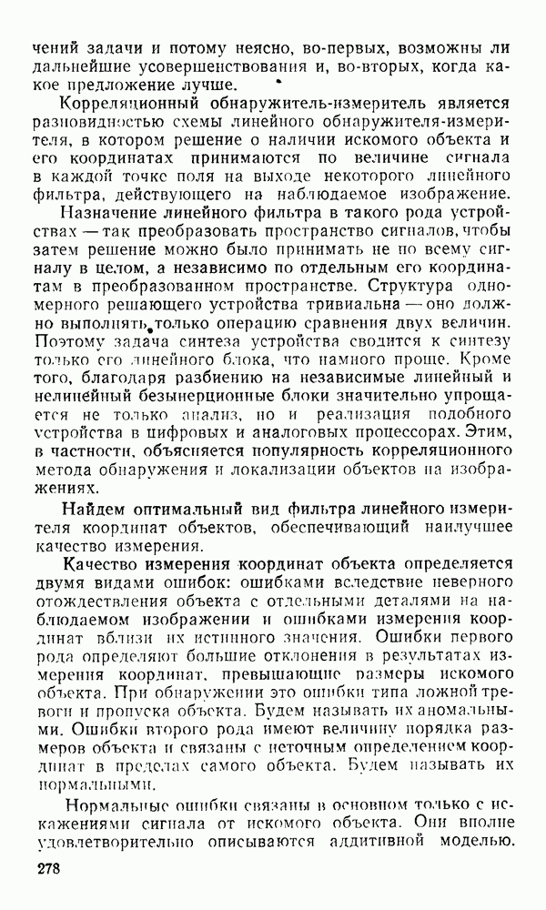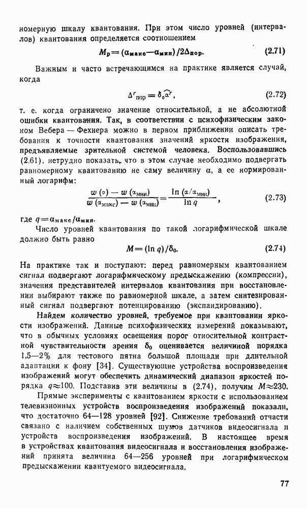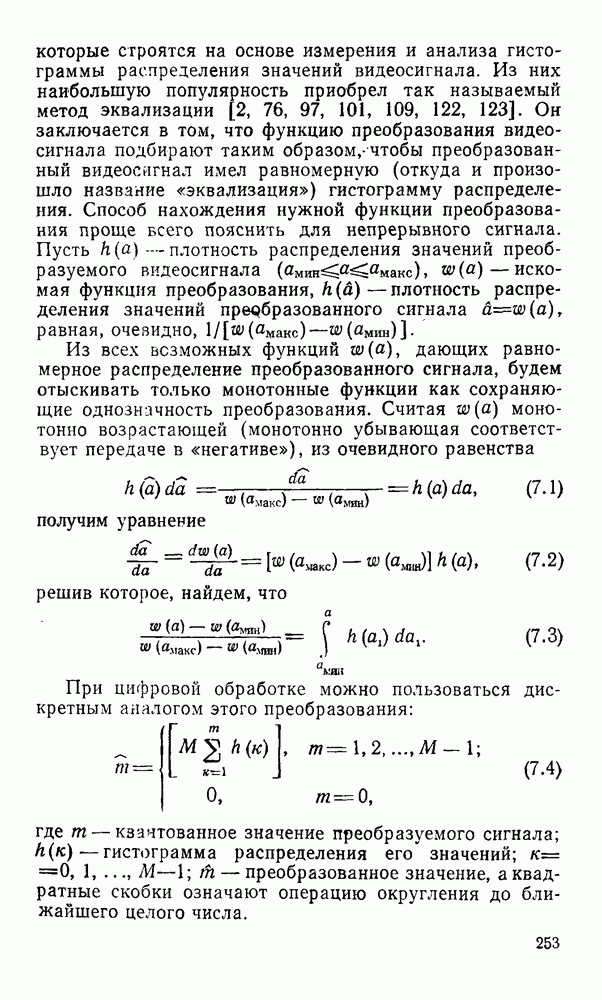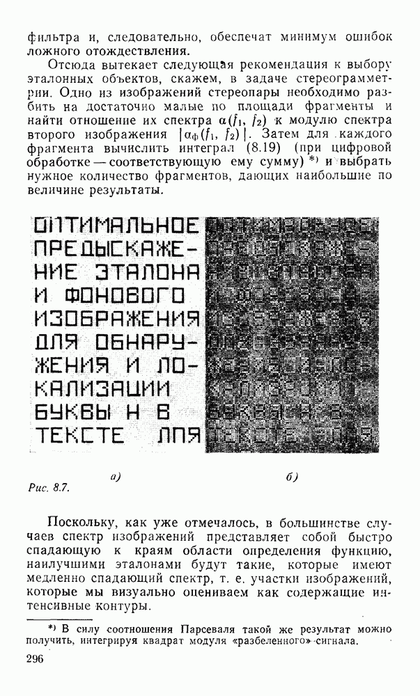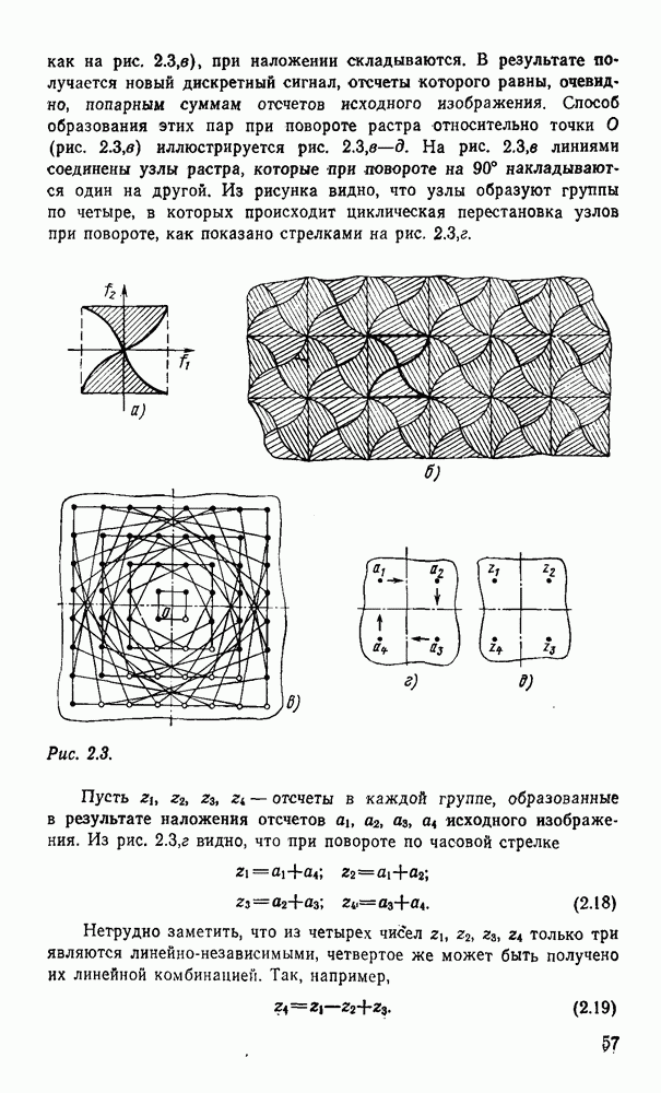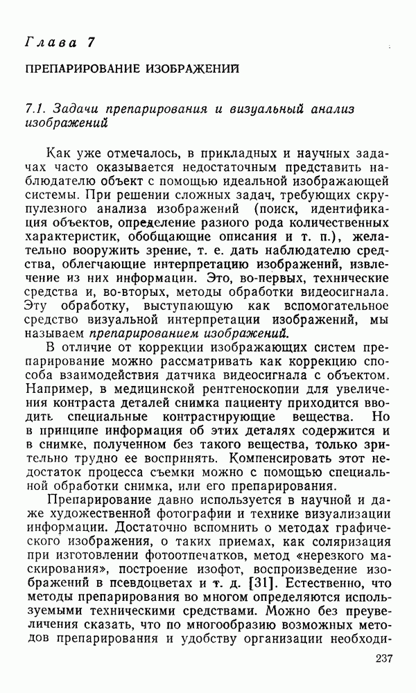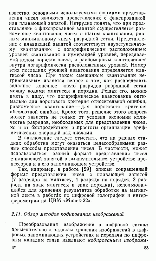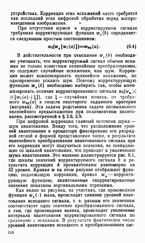 2.6. Другие подходы к дискретизацииТеорема отсчетов дает правило дискретизации сигналов с ограниченным спектром. Чтобы ее использовать для дискретизации изображений, необходимо знать форму и размеры фигуры, ограничивающей спектр изображений. Эти данные иногда непосредственно связаны с известными конструктивными характеристиками изображающих систем (скажем, с характеристиками объективов и фотопленки для фотографических систем). Но во многих случаях они неизвестны, либо неестественны для описания класса изображений, для которых необходимо выбрать параметры дискретизации. Кроме того, не всегда удобно описывать искажения изображений вследствие дискретизации искажением их спектров, как это удобно при использовании теоремы отсчетов. В этих случаях параметры дискретизации — форму растра, шаг дискретизации — выбирают, исходя из более простых критериев оценки ошибки дискретизации и задаваясь конкретным способом интерполяции отсчетов при восстановлении непрерывного изображения. Одним из таких критериев оценки ошибки является критерий максимального значения отличия сигнала от результата его восстановления по дискретному представлению. Учитывая реальные характеристики устройств воспроизведения изображений, считают, например, что при восстановлении происходит ступенчатая интерполяция его отсчетов (при квадратной апертуре). Поэтому задаются квадратным растром дискретизации, а расстояние между отсчетами выбирают так, чтобы на этом расстоянии сигнал не мог измениться больше, чем на заданную величину ошибки. Для этого нужно, конечно, задаться ограничениями на возможную скорость изменения сигнала изображения по координатам, скажем, на максимальное значение его производных. Если эта величина неизвестна, то можно построить устройство дискретизации, которое автоматически измеряет отличие текущего значения сигнала от его значения в ближайшем отсчете и выбирает следующий отсчет там, где это отличие достигает заданного порога ошибки. Такой способ дискретизации называется адаптивной дискретизацией. Очевидно, что при адаптивной дискретизации расстояние между отсчетами непостоянно. Поэтому этот способ, используемый иногда для экономного кодирования изображений для дискретных каналов связи, при представлении изображений в цифровых процессорах для цифровой обработки неудобен и не применяется. Он может, однако, использоваться при архивном хранении изображений в запоминающих устройствах цифровых процессоров. Наконец, в некоторых случаях не удается найти и сформулировать какой-либо определенный критерий точности дискретизации изображений. Тогда решение о выборе параметров дискретизации приходится принимать, основываясь на полученных эмпирическим путем данных о требуемом количестве отсчетов на объект минимальной площади или других подобных показателях. В описанных способах дискретизации изображений дискретным представлением служат отсчеты сигнала, что, как уже отмечалось, соответствует представлению сигнала по отсчетным функциям и в устройствах измерения и дискретизации слабых излучений (радиоактивного, рентгеновского, инфракрасного и т. п.) для увеличения чувствительности датчиков. Краткий обзор этих методов можно найти в [125, 126].