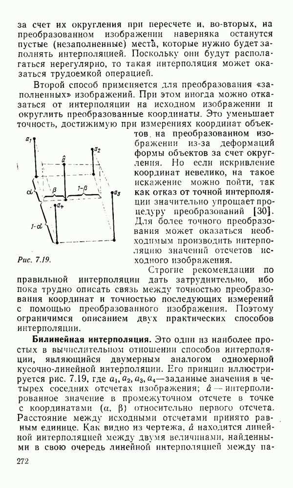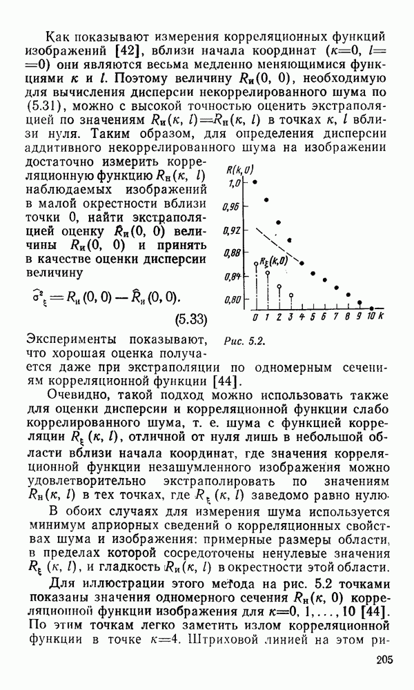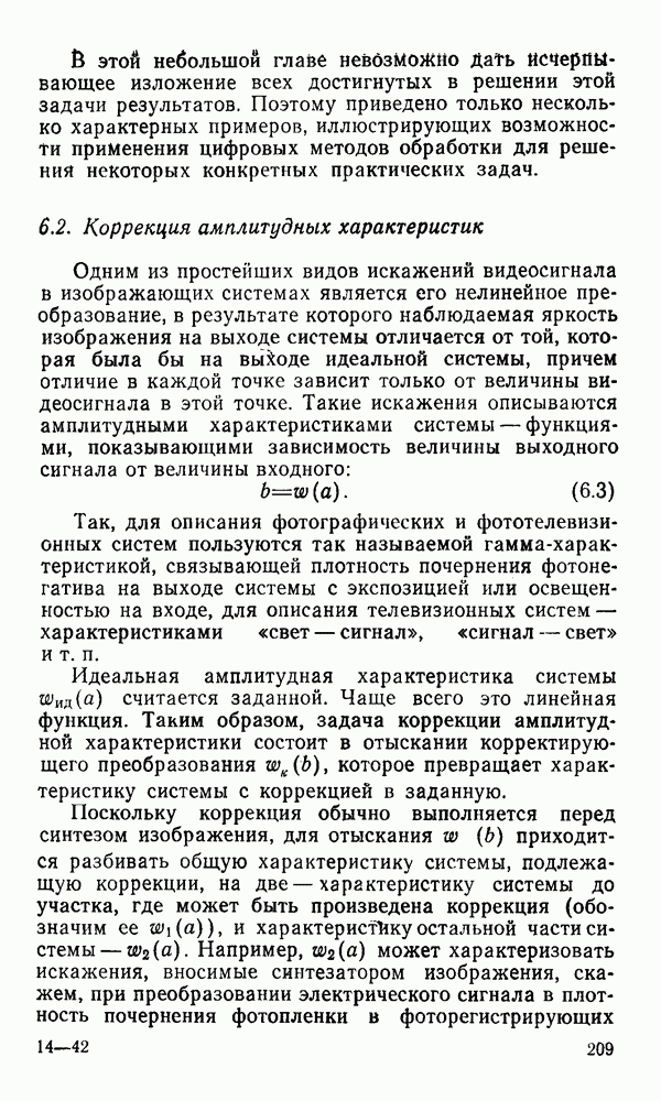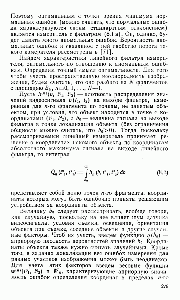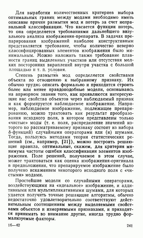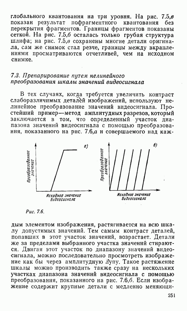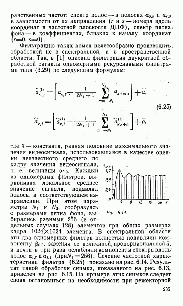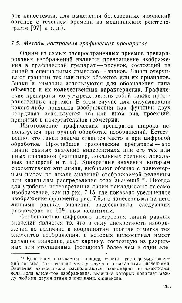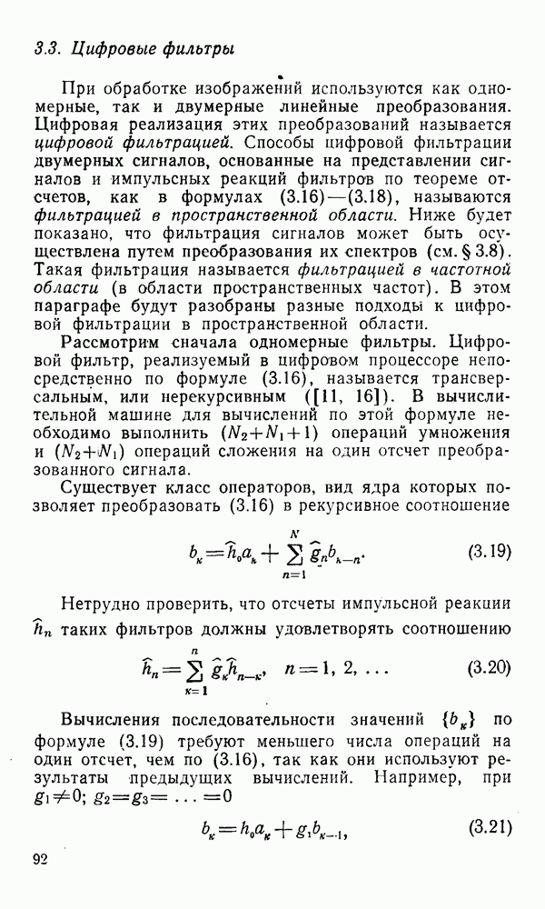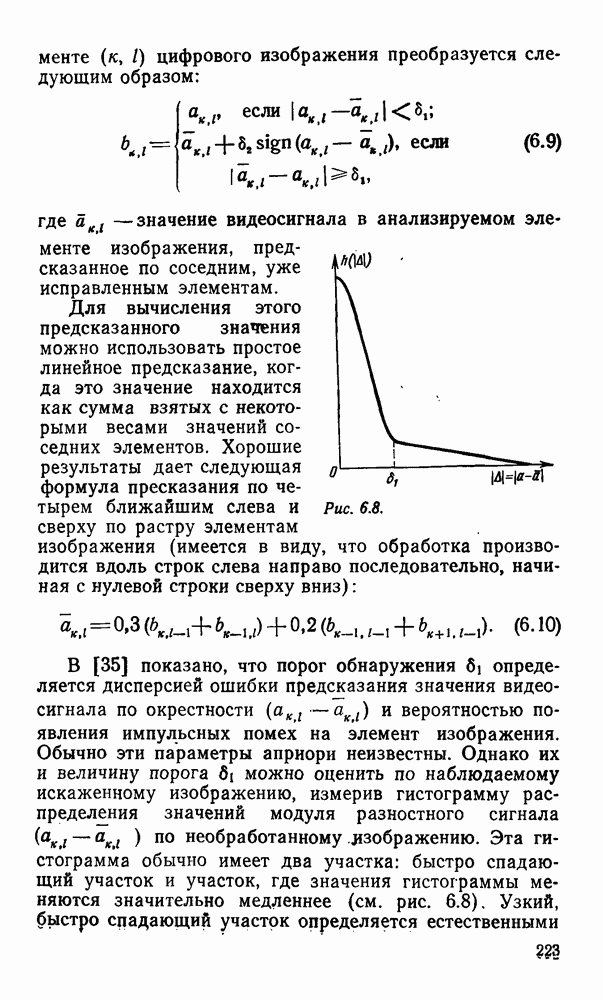 2.6. Другие подходы к дискретизацииТеорема отсчетов дает правило дискретизации сигналов с ограниченным спектром. Чтобы ее использовать для дискретизации изображений, необходимо знать форму и размеры фигуры, ограничивающей спектр изображений. Эти данные иногда непосредственно связаны с известными конструктивными характеристиками изображающих систем (скажем, с характеристиками объективов и фотопленки для фотографических систем). Но во многих случаях они неизвестны, либо неестественны для описания класса изображений, для которых необходимо выбрать параметры дискретизации. Кроме того, не всегда удобно описывать искажения изображений вследствие дискретизации искажением их спектров, как это удобно при использовании теоремы отсчетов. В этих случаях параметры дискретизации — форму растра, шаг дискретизации — выбирают, исходя из более простых критериев оценки ошибки дискретизации и задаваясь конкретным способом интерполяции отсчетов при восстановлении непрерывного изображения. Одним из таких критериев оценки ошибки является критерий максимального значения отличия сигнала от результата его восстановления по дискретному представлению. Учитывая реальные характеристики устройств воспроизведения изображений, считают, например, что при восстановлении происходит ступенчатая интерполяция его отсчетов (при квадратной апертуре). Поэтому задаются квадратным растром дискретизации, а расстояние между отсчетами выбирают так, чтобы на этом расстоянии сигнал не мог измениться больше, чем на заданную величину ошибки. Для этого нужно, конечно, задаться ограничениями на возможную скорость изменения сигнала изображения по координатам, скажем, на максимальное значение его производных. Если эта величина неизвестна, то можно построить устройство дискретизации, которое автоматически измеряет отличие текущего значения сигнала от его значения в ближайшем отсчете и выбирает следующий отсчет там, где это отличие достигает заданного порога ошибки. Такой способ дискретизации называется адаптивной дискретизацией. Очевидно, что при адаптивной дискретизации расстояние между отсчетами непостоянно. Поэтому этот способ, используемый иногда для экономного кодирования изображений для дискретных каналов связи, при представлении изображений в цифровых процессорах для цифровой обработки неудобен и не применяется. Он может, однако, использоваться при архивном хранении изображений в запоминающих устройствах цифровых процессоров. Наконец, в некоторых случаях не удается найти и сформулировать какой-либо определенный критерий точности дискретизации изображений. Тогда решение о выборе параметров дискретизации приходится принимать, основываясь на полученных эмпирическим путем данных о требуемом количестве отсчетов на объект минимальной площади или других подобных показателях. В описанных способах дискретизации изображений дискретным представлением служат отсчеты сигнала, что, как уже отмечалось, соответствует представлению сигнала по отсчетным функциям и в устройствах измерения и дискретизации слабых излучений (радиоактивного, рентгеновского, инфракрасного и т. п.) для увеличения чувствительности датчиков. Краткий обзор этих методов можно найти в [125, 126].