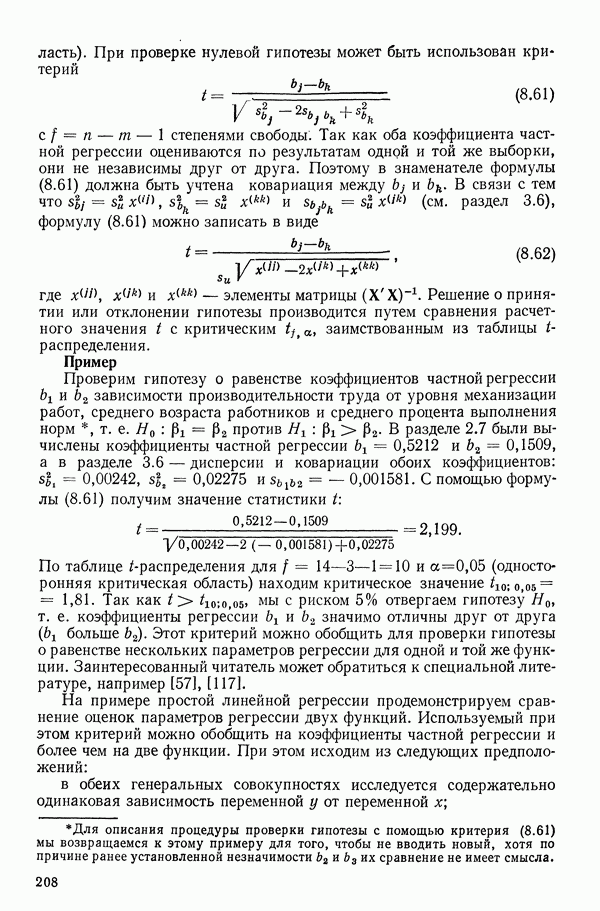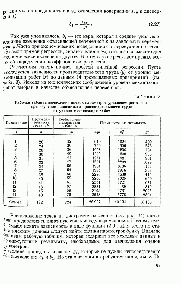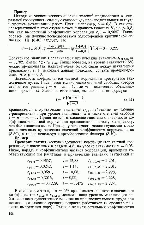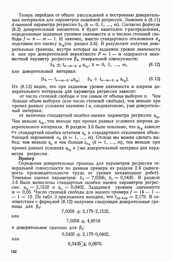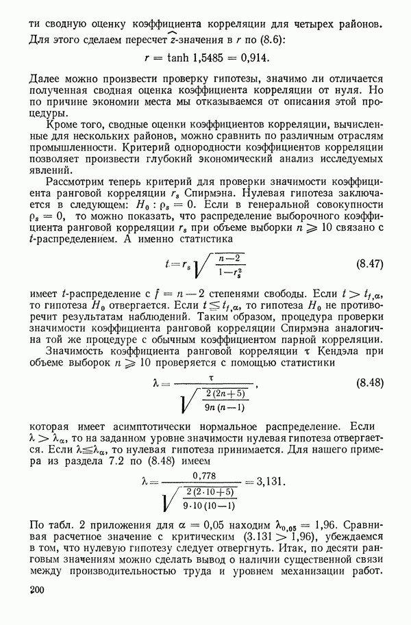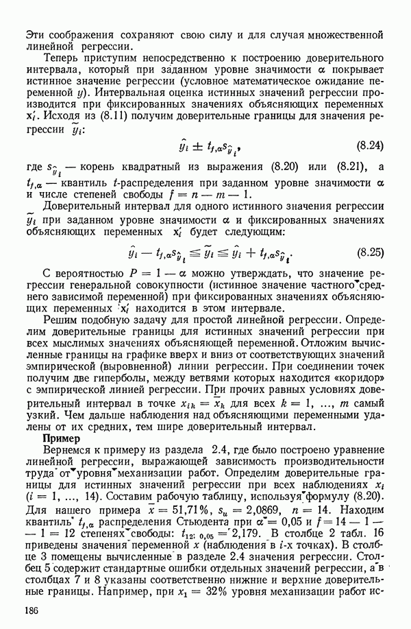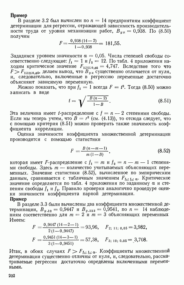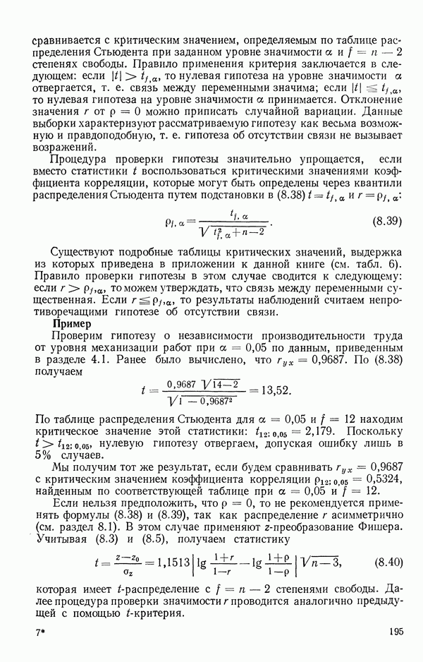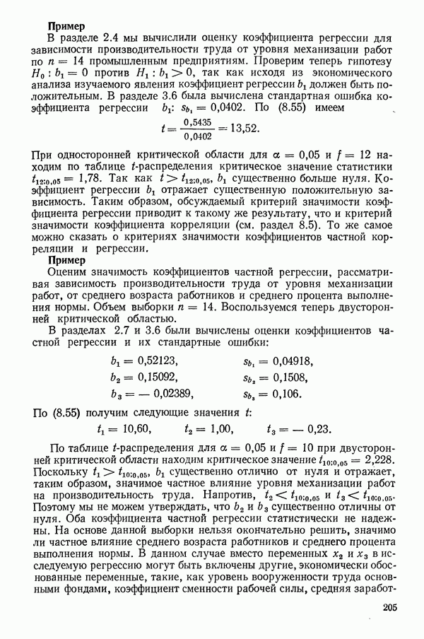 Выражение (8.57) также получается из (8.55) путем подстановки вместо Проверка гипотезы Пример В разделе 2.4 мы вычислили оценку коэффициента регрессии для зависимости производительности труда от уровня механизации работ по