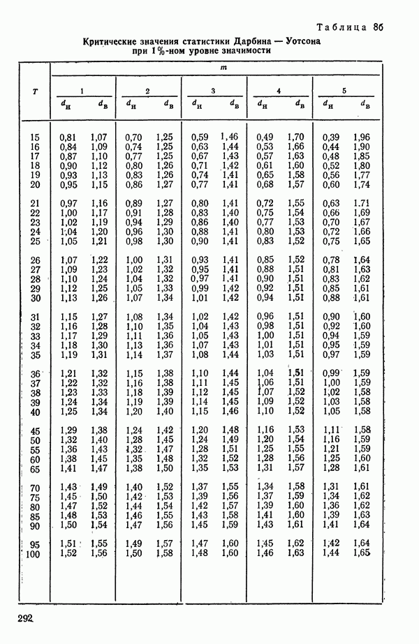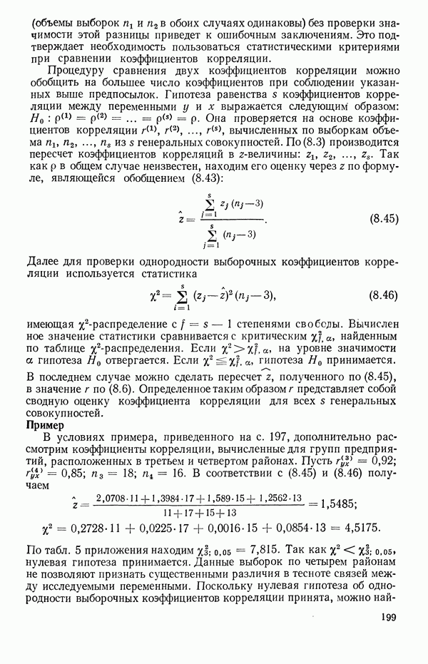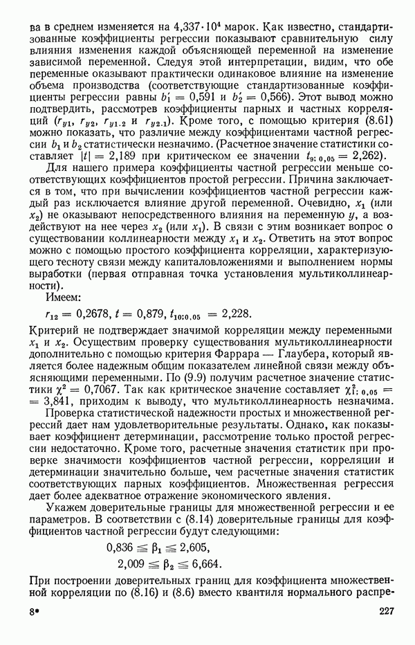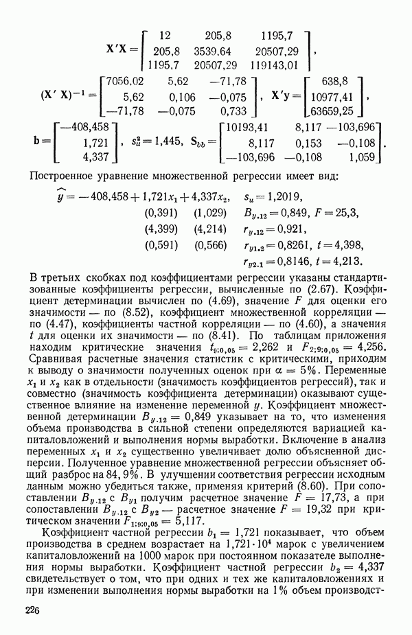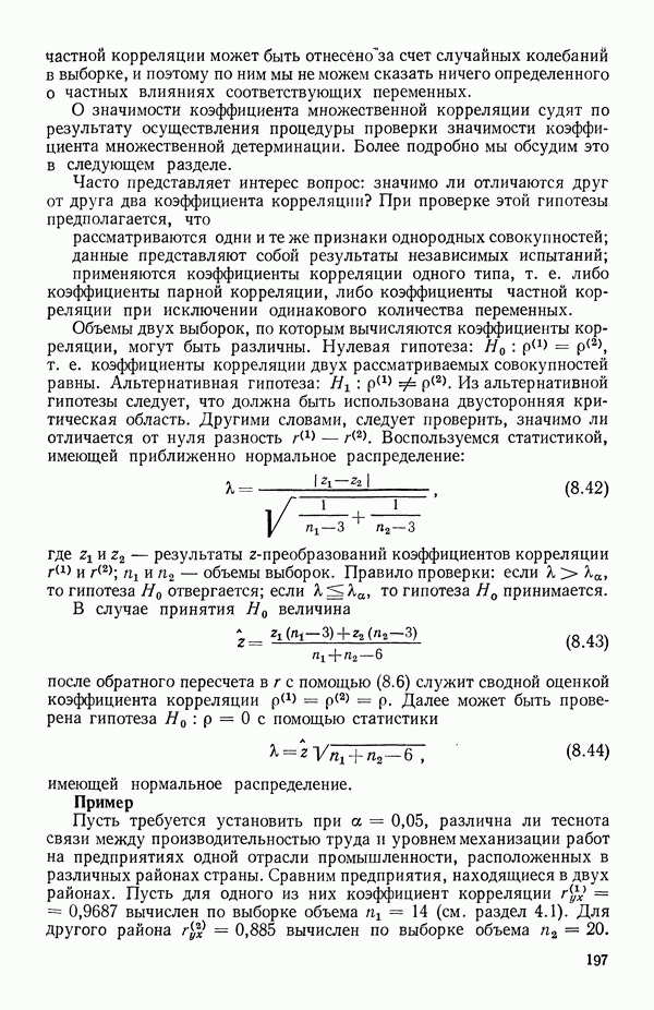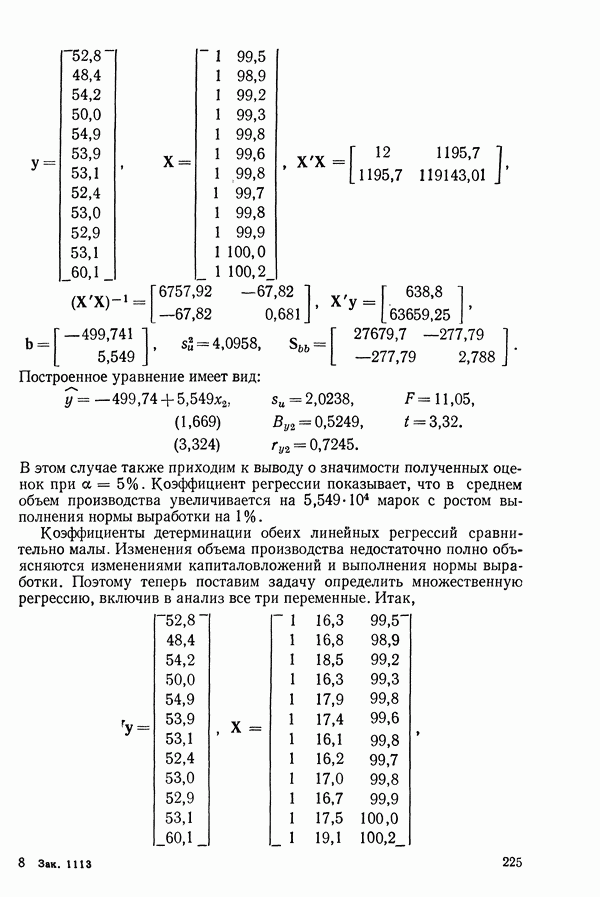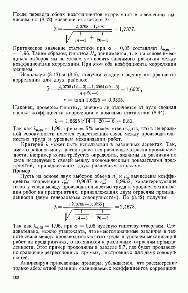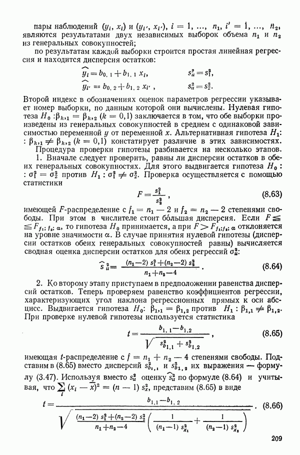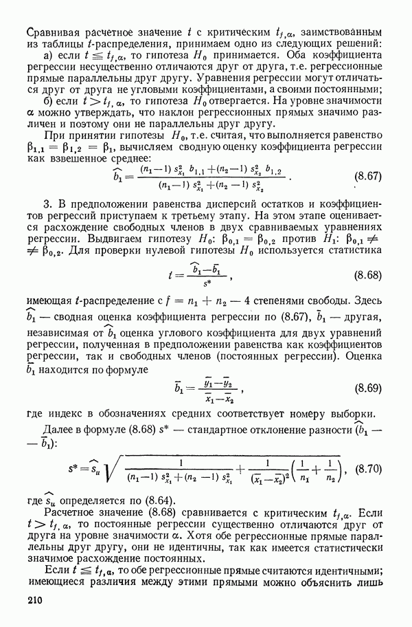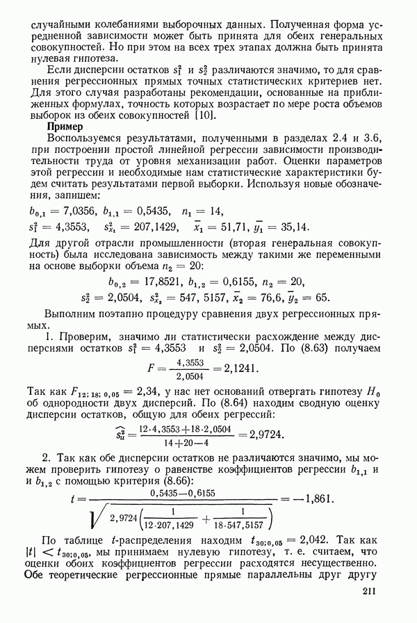 Так как Теперь подытожим результаты нашего исследования. Для обеих отраслей промышленности (генеральных совокупностей) может быть принята одинаковая усредненная зависимость производительности труда от уровня механизации работ. Но уравнения регрессии для обеих отраслей промышленности не идентичны в силу установленного статистического различия в свободных членах этих уравнений. По одной и той же регрессии нельзя оценить средний уровень производительности труда в обеих отраслях промышленности при заданных значениях коэффициента механизации работ. Кроме того, в разделе 8.5 было установлено, что теснота связи между исследуемыми переменными для обеих отраслей промышленности была различна. Аналогичная процедура может быть использована для определения структурных изменений во временных рядах. С этой целью исследуемый промежуток времени делят на два периода, для каждого из которых строят регрессионную зависимость. Затем с помощью приведенных выше критериев проверяется их идентичность. Если в результате проверки статистических гипотез подтверждается идентичность регрессий для обоих периодов, то приходят к выводу, что за исследуемый промежуток времени не произошло никаких нарушений, которые могли бы привести к структурным изменениям. Полученные уравнения регрессии принимаются характерными для исследуемого явления.