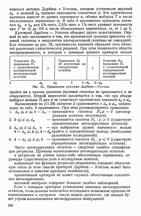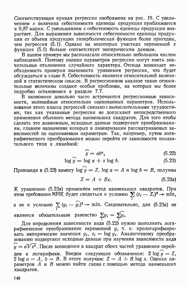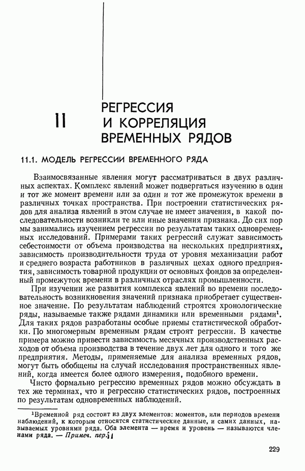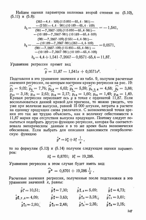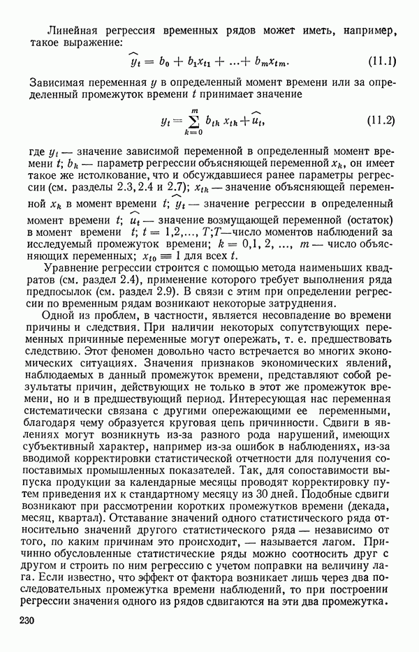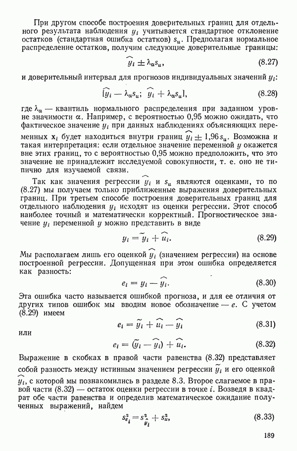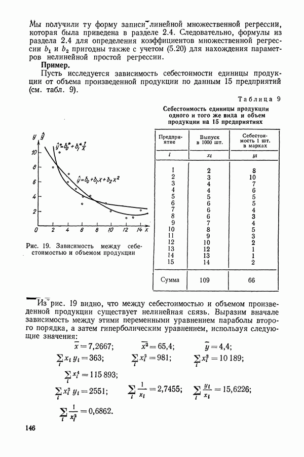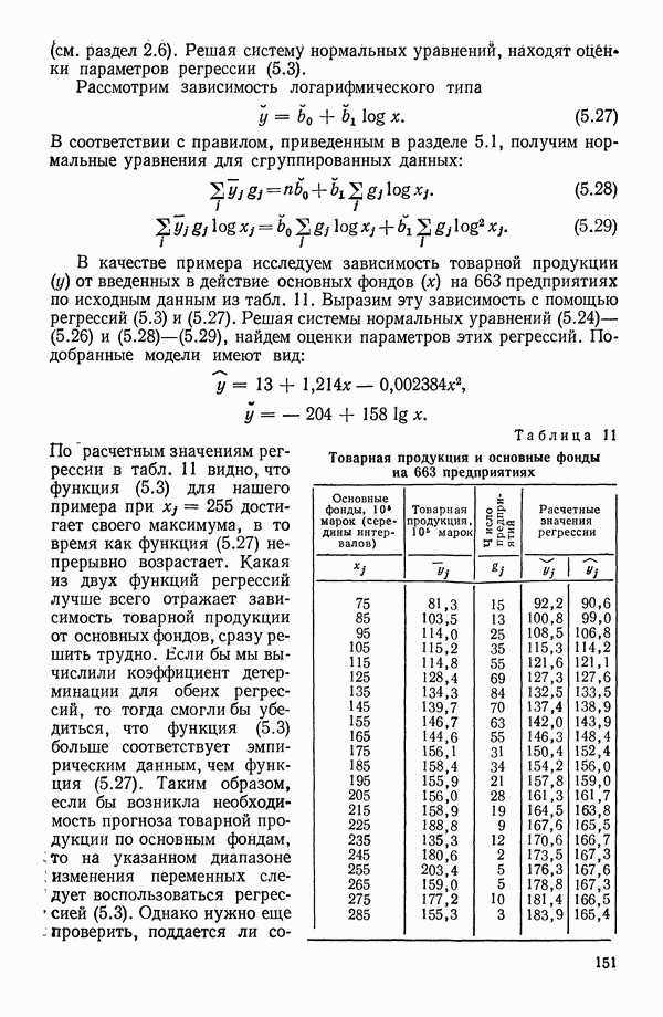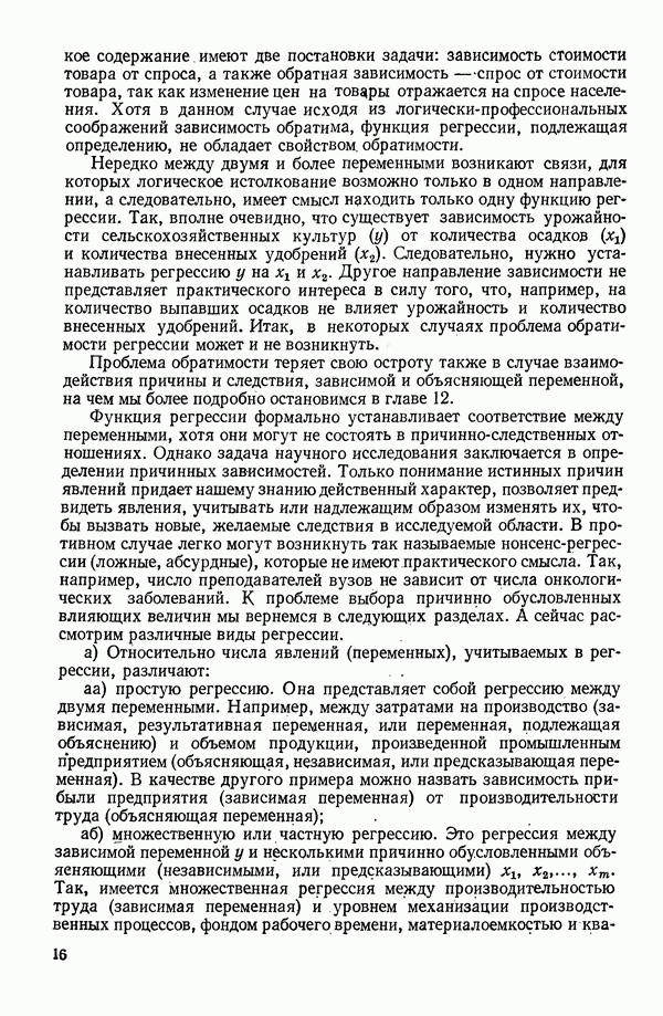 Так как Теперь подытожим результаты нашего исследования. Для обеих отраслей промышленности (генеральных совокупностей) может быть принята одинаковая усредненная зависимость производительности труда от уровня механизации работ. Но уравнения регрессии для обеих отраслей промышленности не идентичны в силу установленного статистического различия в свободных членах этих уравнений. По одной и той же регрессии нельзя оценить средний уровень производительности труда в обеих отраслях промышленности при заданных значениях коэффициента механизации работ. Кроме того, в разделе 8.5 было установлено, что теснота связи между исследуемыми переменными для обеих отраслей промышленности была различна. Аналогичная процедура может быть использована для определения структурных изменений во временных рядах. С этой целью исследуемый промежуток времени делят на два периода, для каждого из которых строят регрессионную зависимость. Затем с помощью приведенных выше критериев проверяется их идентичность. Если в результате проверки статистических гипотез подтверждается идентичность регрессий для обоих периодов, то приходят к выводу, что за исследуемый промежуток времени не произошло никаких нарушений, которые могли бы привести к структурным изменениям. Полученные уравнения регрессии принимаются характерными для исследуемого явления.