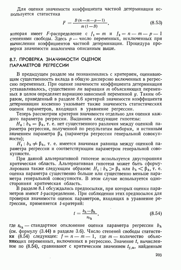 8.7. ПРОВЕРКА ЗНАЧИМОСТИ ОЦЕНОК ПАРАМЕТРОВ РЕГРЕССИИВ предыдущем разделе мы познакомились с критерием, оценивающим существенность вклада в общую дисперсию включенных в регрессию переменных. При оценке значимости коэффициента детерминации устанавливалось, существенно ли вариация Теперь рассмотрим критерии значимости отдельно для оценки каждого параметра регрессии. Выдвинем следующие гипотезы: