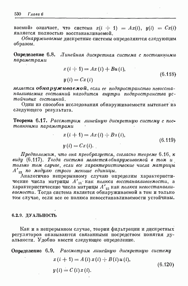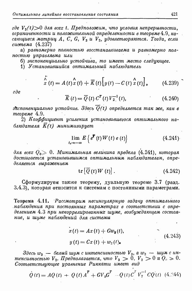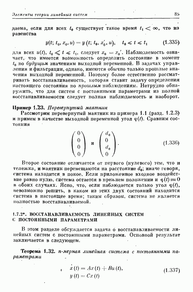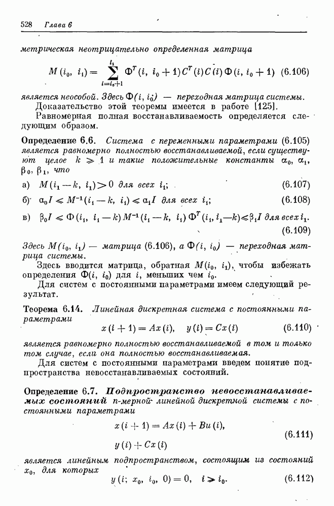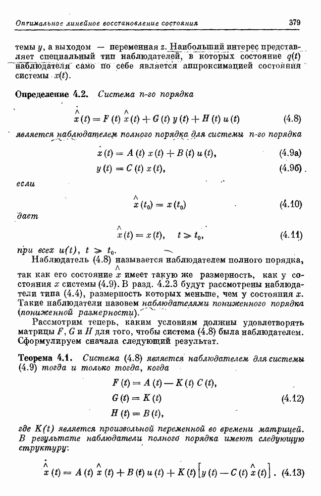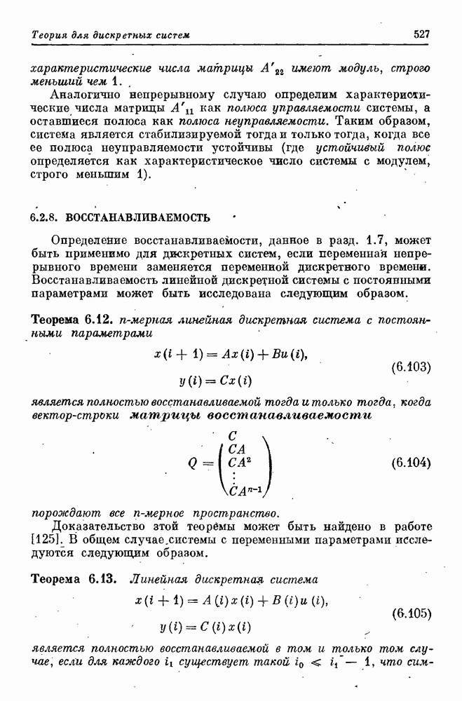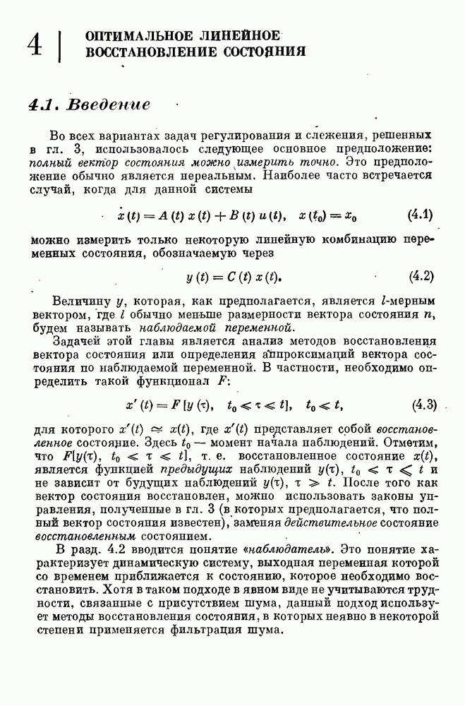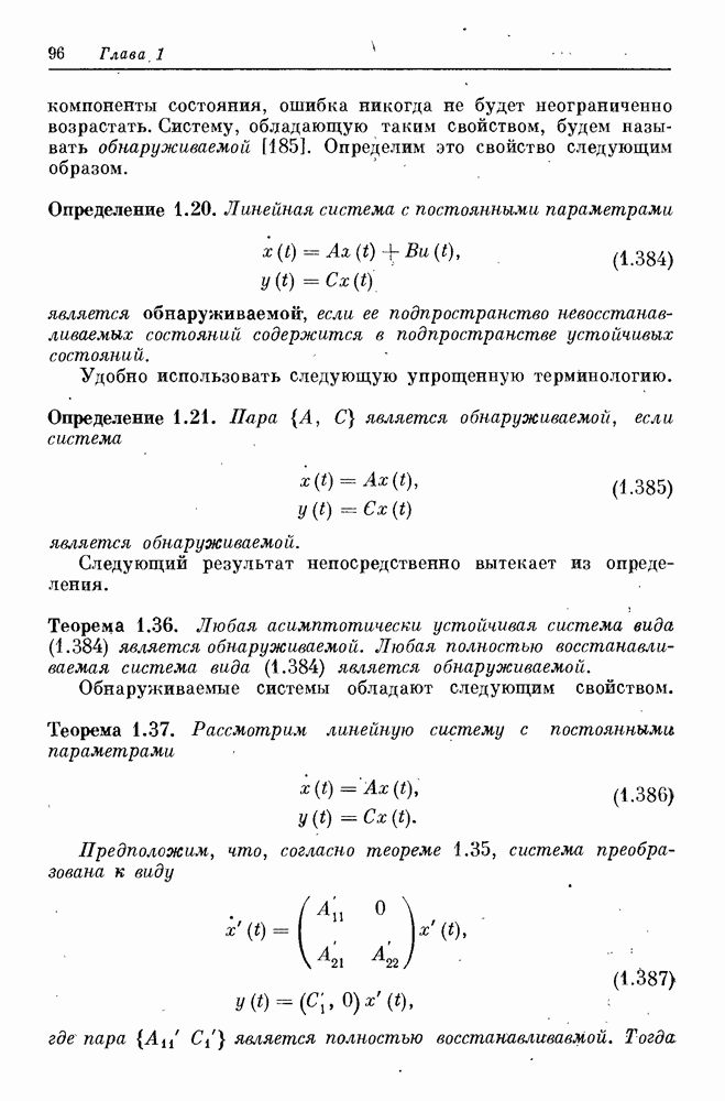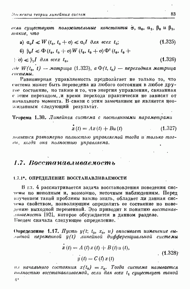 по будущим значениям выходной переменной. В задачах управления и фильтрации, однако, имеются обычно только прошлые значения выходной переменной. Поэтому более естественно рассматривать восстанавливаемость, которая ставит задачу определения настоящего состояния по прошлым наблюдениям. Нетрудно обнаружить, что для систем с постоянными параметрами из полной посстанавливаемости следует полная наблюдаемость и наоборот.