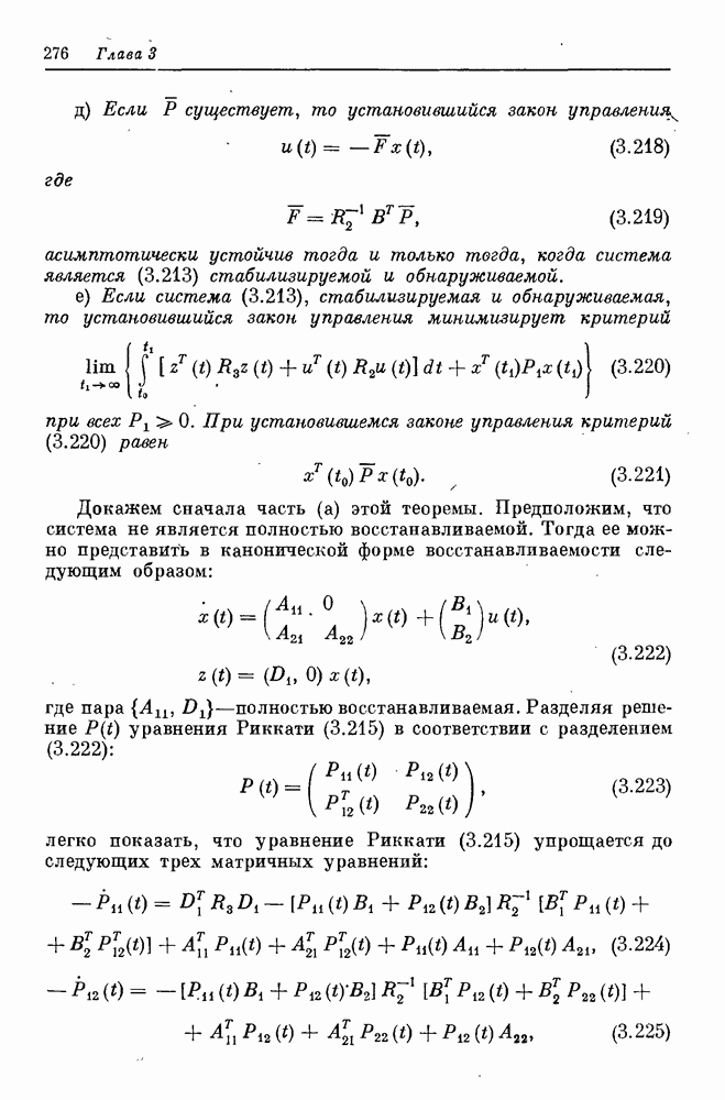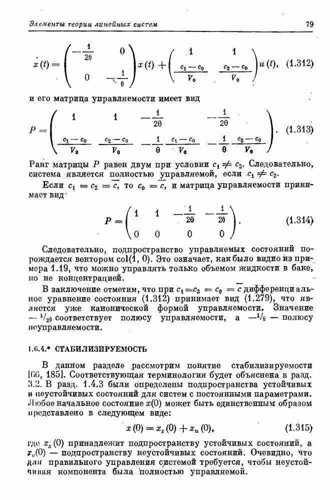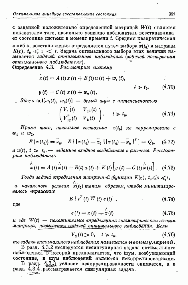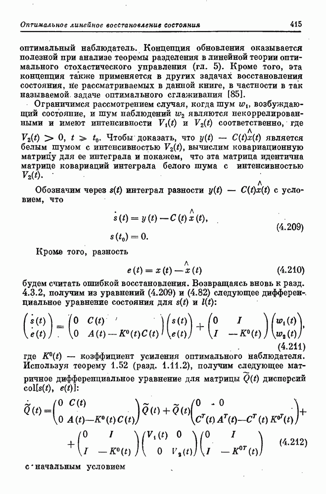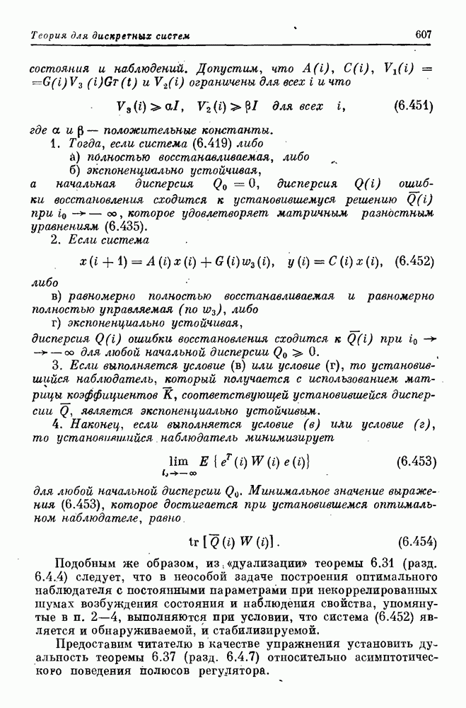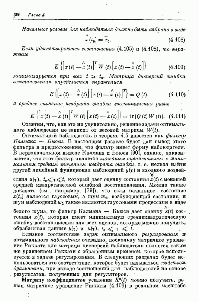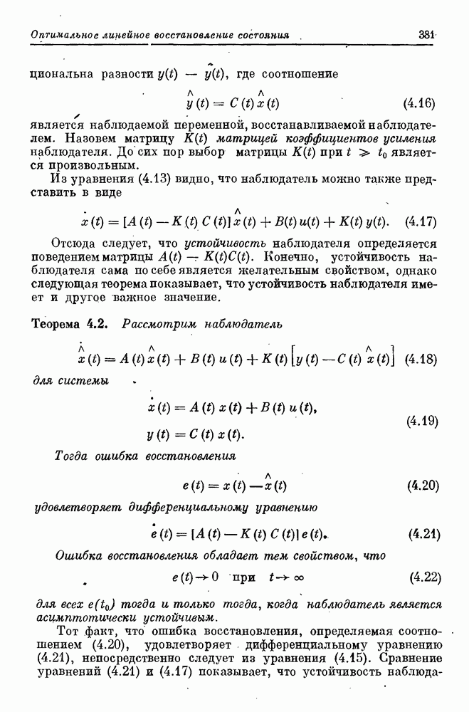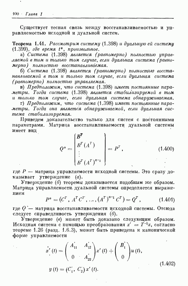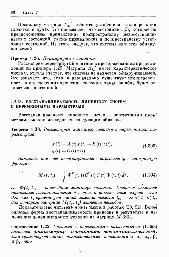по будущим значениям выходной переменной. В задачах управления и фильтрации, однако, имеются обычно только прошлые значения выходной переменной. Поэтому более естественно рассматривать восстанавливаемость, которая ставит задачу определения настоящего состояния по прошлым наблюдениям. Нетрудно обнаружить, что для систем с постоянными параметрами из полной посстанавливаемости следует полная наблюдаемость и наоборот.