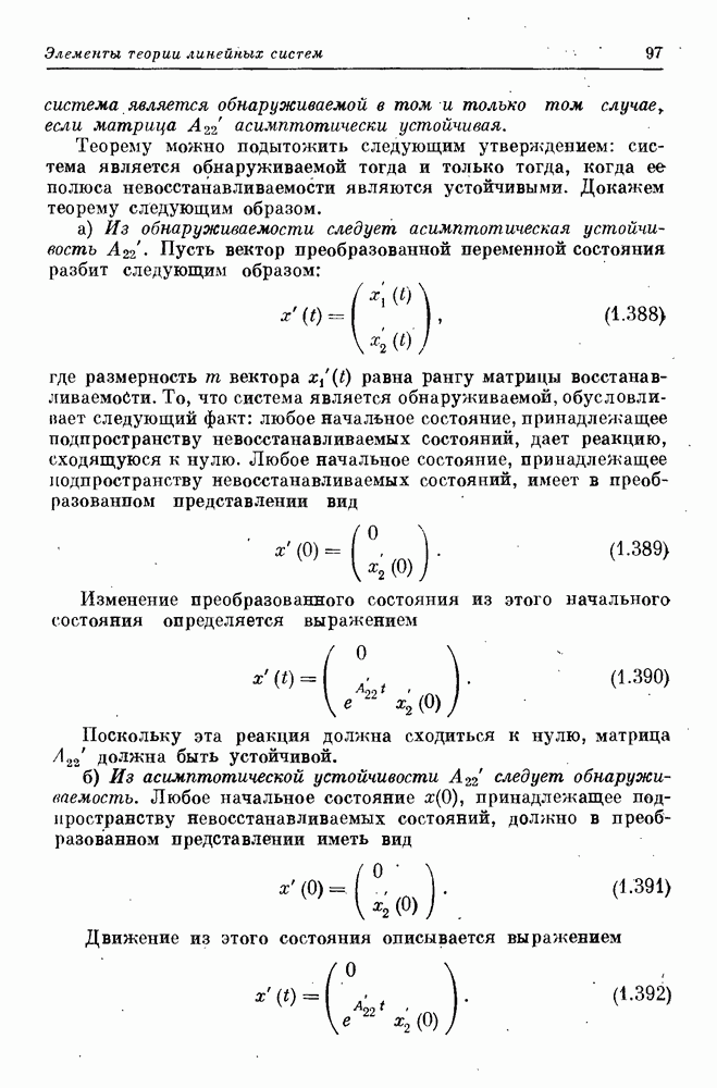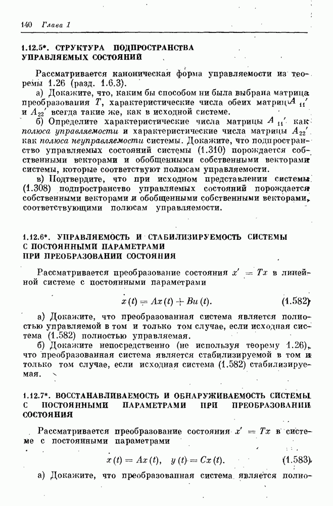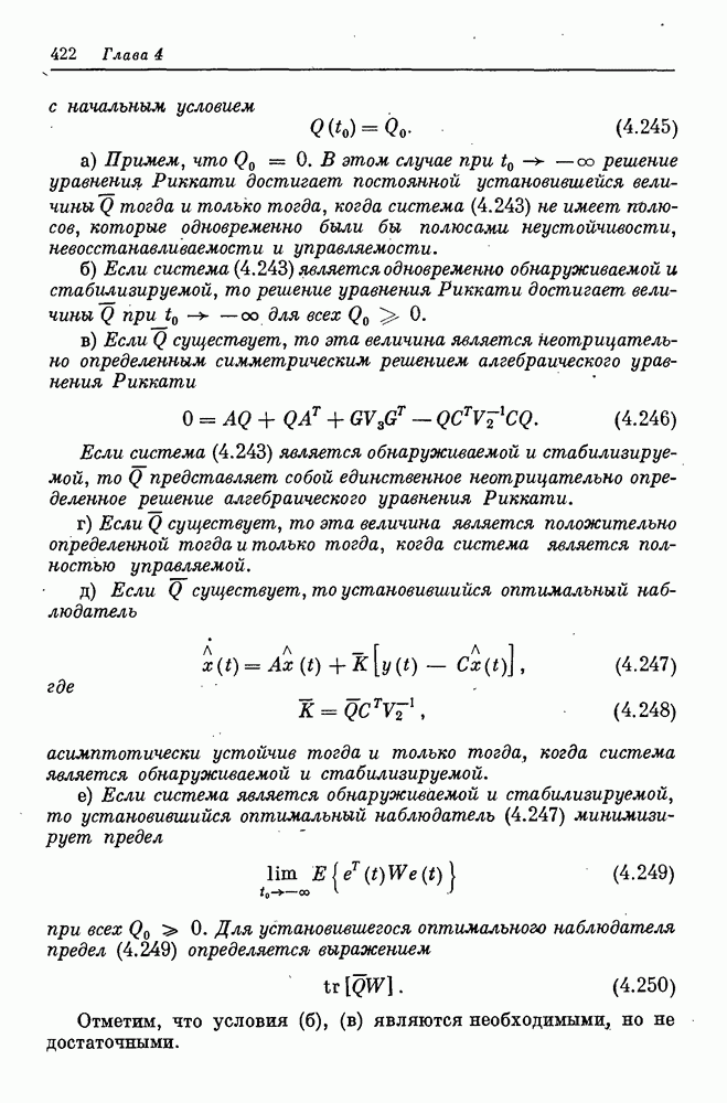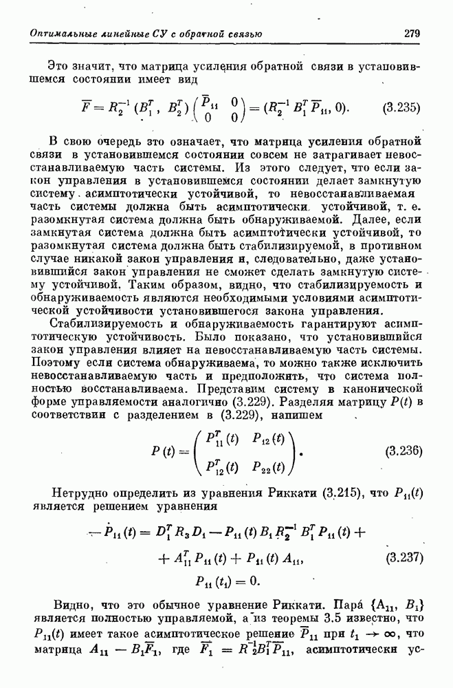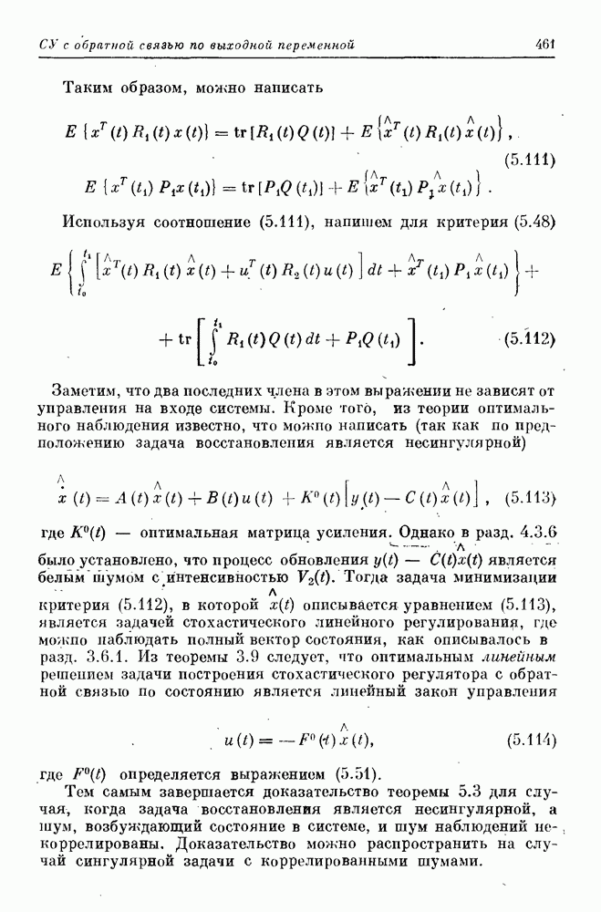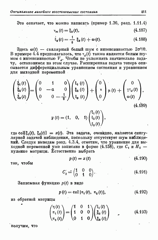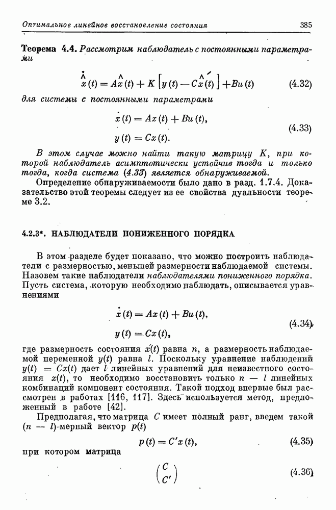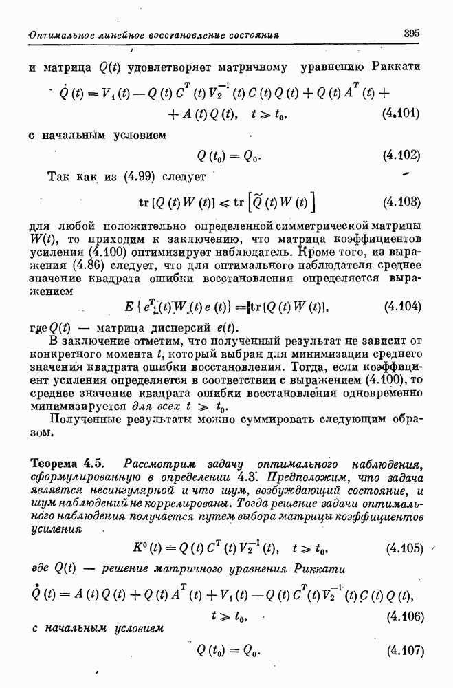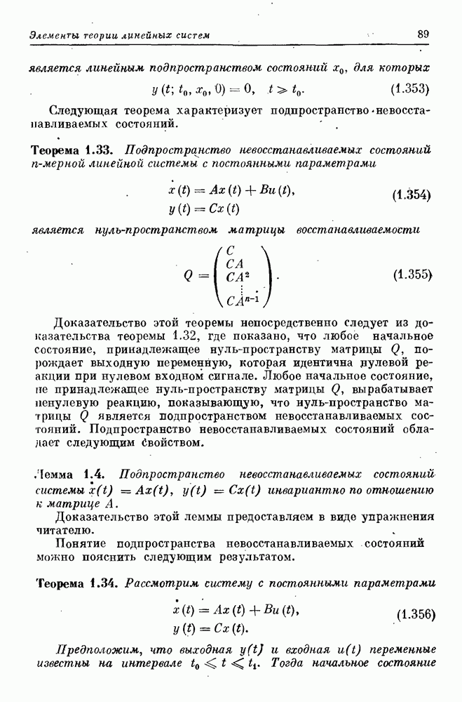 по будущим значениям выходной переменной. В задачах управления и фильтрации, однако, имеются обычно только прошлые значения выходной переменной. Поэтому более естественно рассматривать восстанавливаемость, которая ставит задачу определения настоящего состояния по прошлым наблюдениям. Нетрудно обнаружить, что для систем с постоянными параметрами из полной посстанавливаемости следует полная наблюдаемость и наоборот.