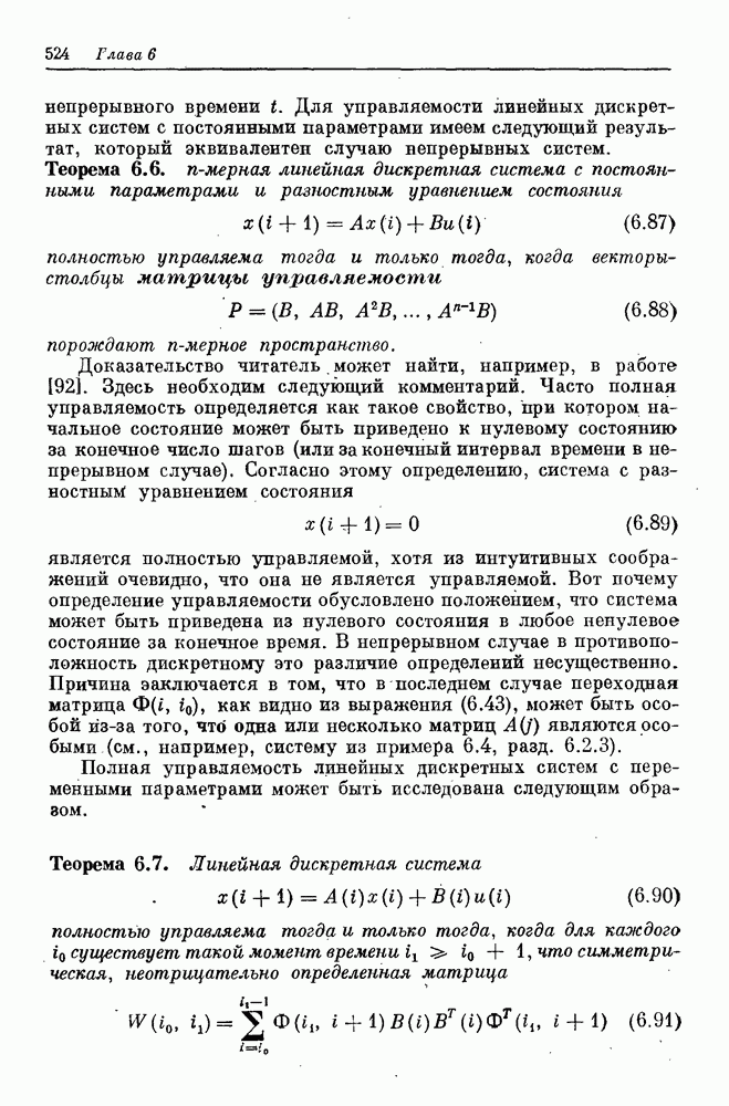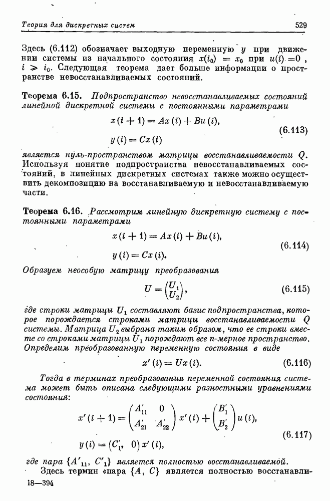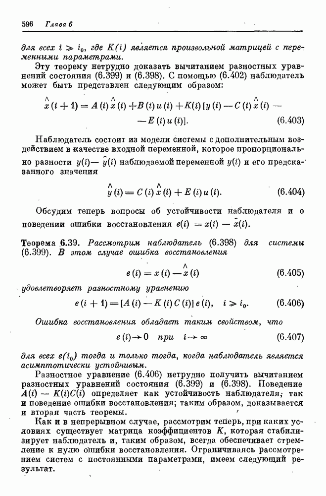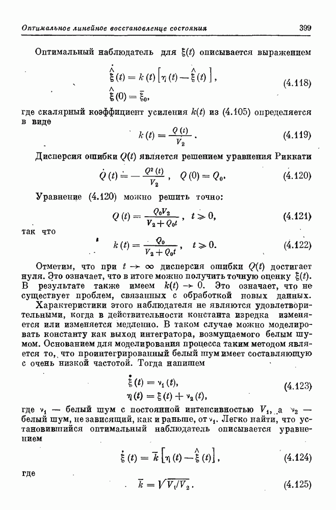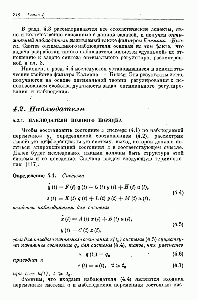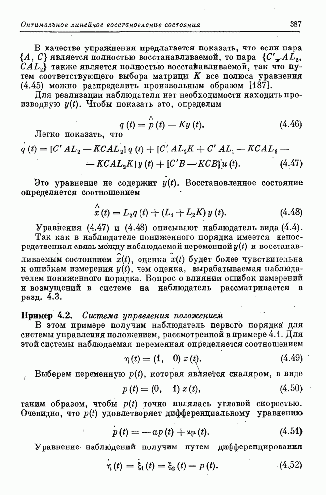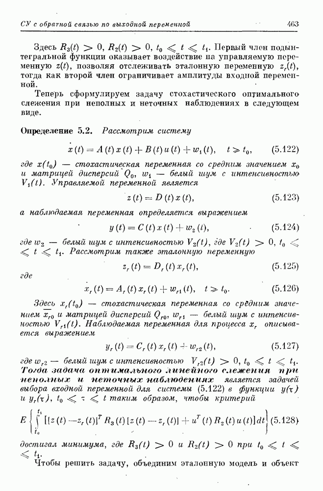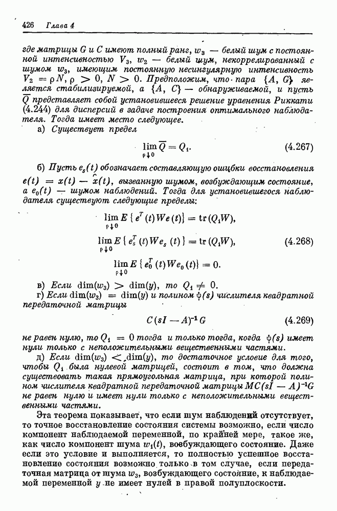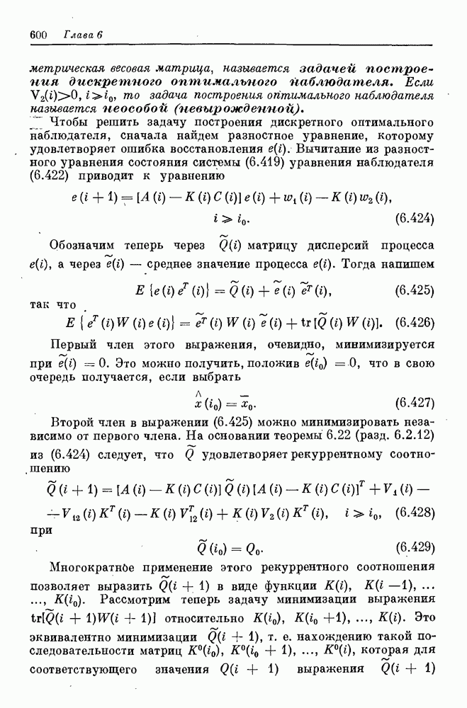 по будущим значениям выходной переменной. В задачах управления и фильтрации, однако, имеются обычно только прошлые значения выходной переменной. Поэтому более естественно рассматривать восстанавливаемость, которая ставит задачу определения настоящего состояния по прошлым наблюдениям. Нетрудно обнаружить, что для систем с постоянными параметрами из полной посстанавливаемости следует полная наблюдаемость и наоборот.