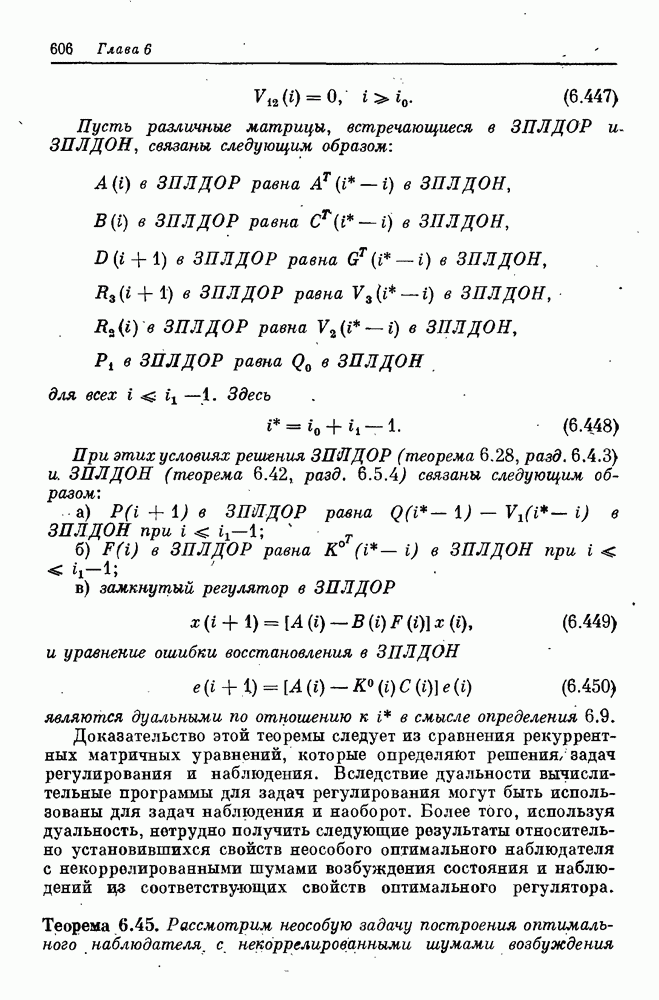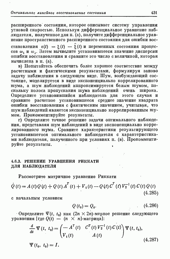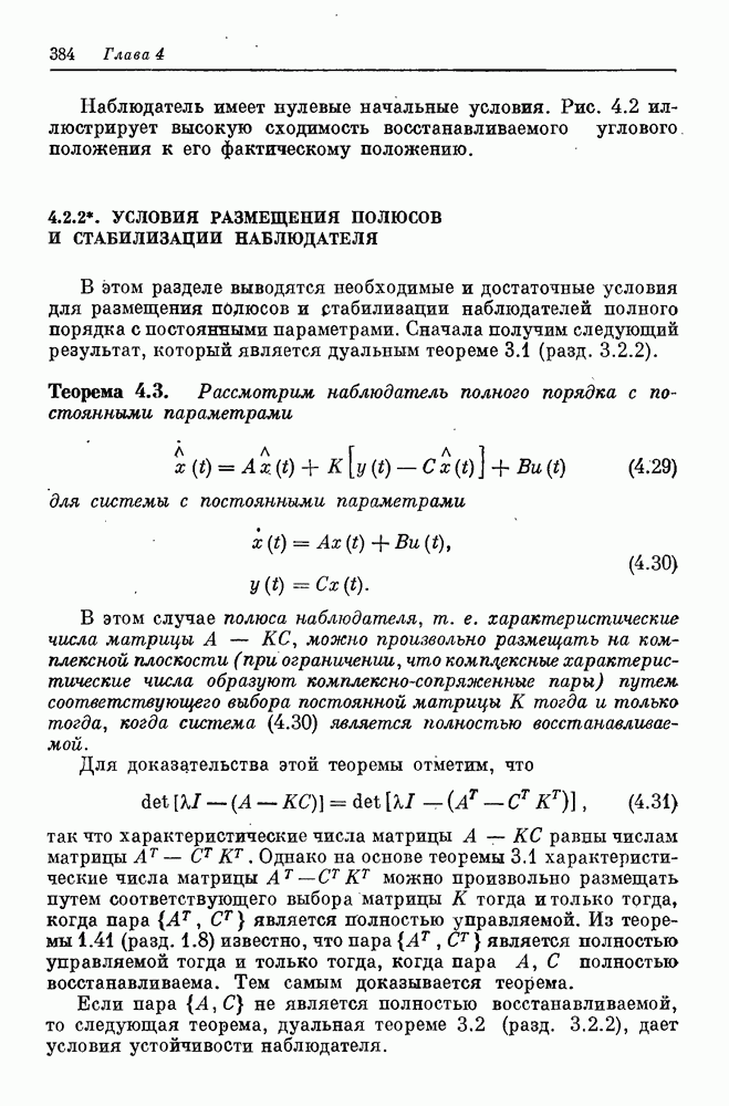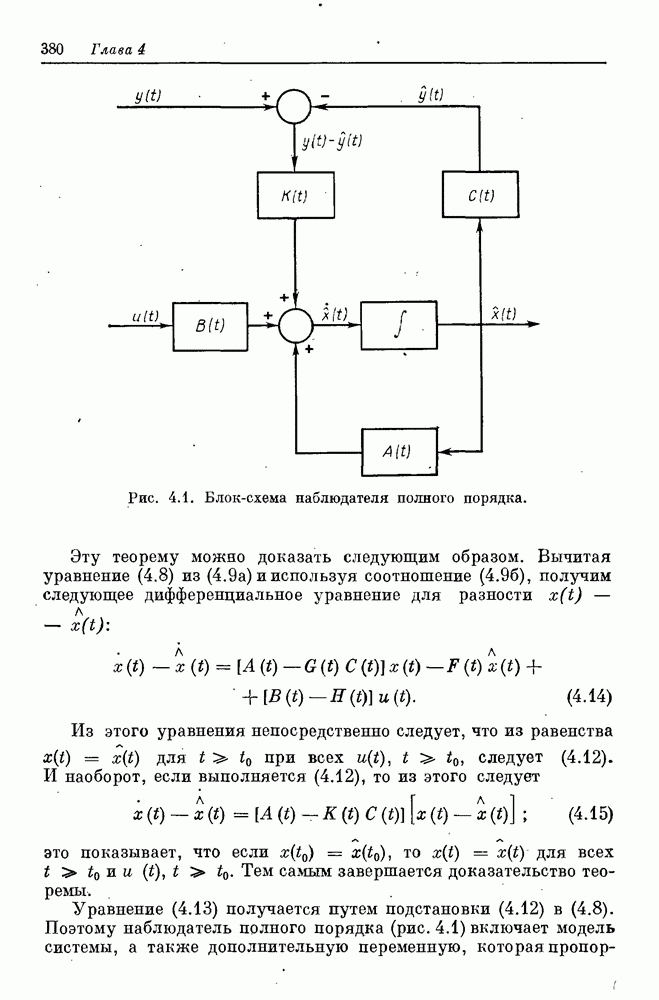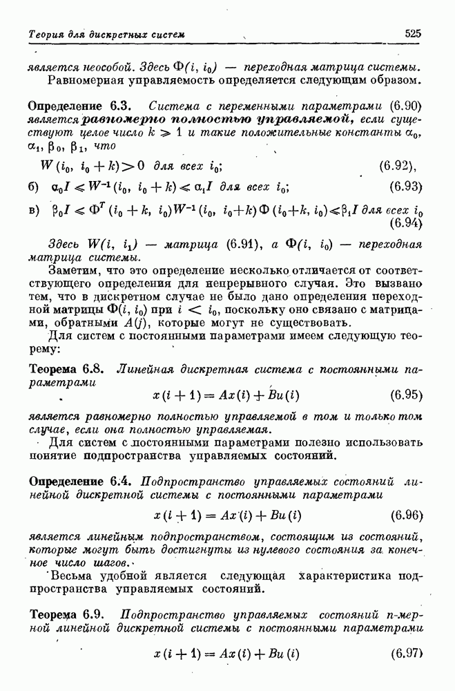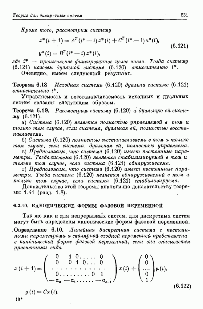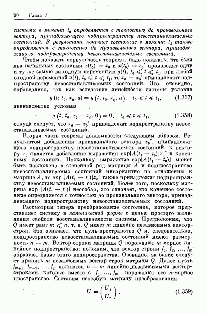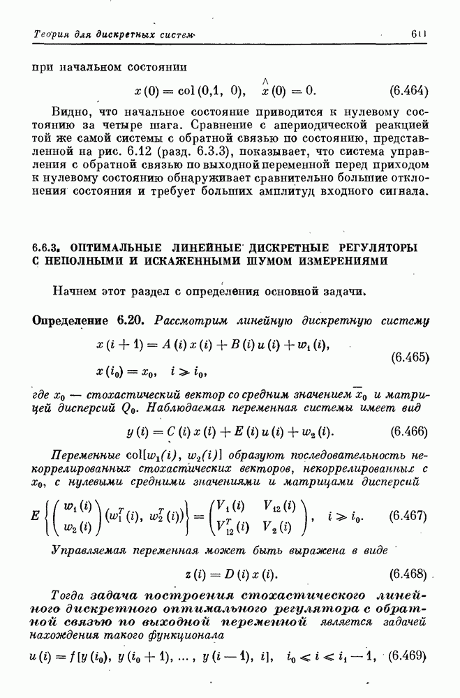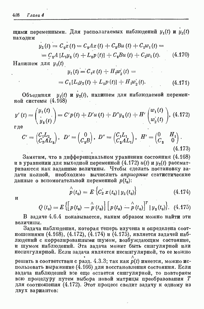 по будущим значениям выходной переменной. В задачах управления и фильтрации, однако, имеются обычно только прошлые значения выходной переменной. Поэтому более естественно рассматривать восстанавливаемость, которая ставит задачу определения настоящего состояния по прошлым наблюдениям. Нетрудно обнаружить, что для систем с постоянными параметрами из полной посстанавливаемости следует полная наблюдаемость и наоборот.